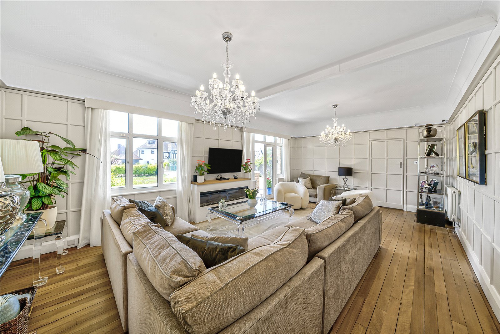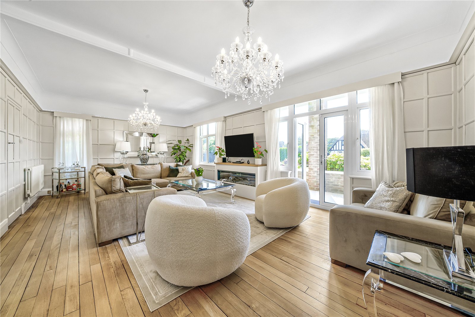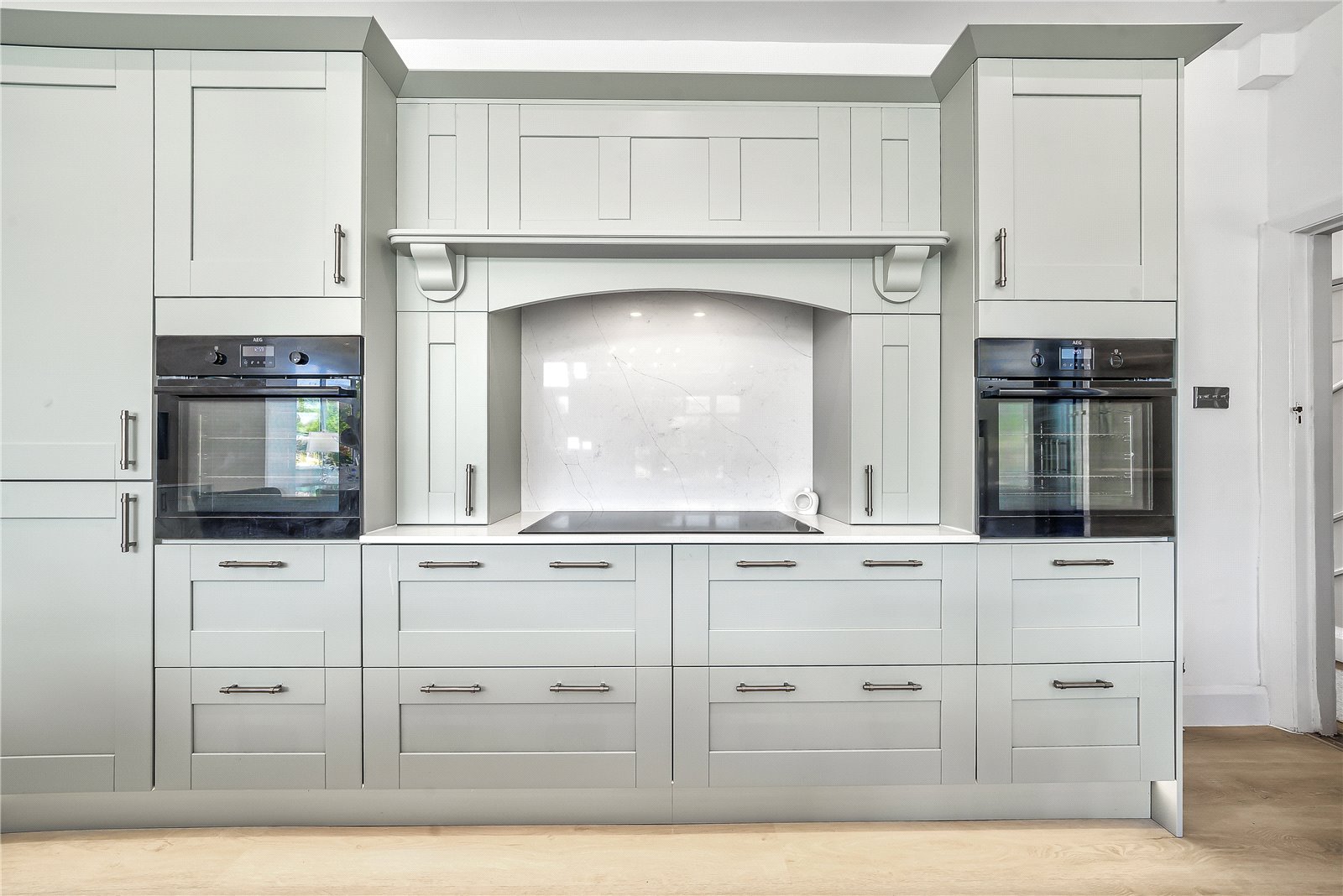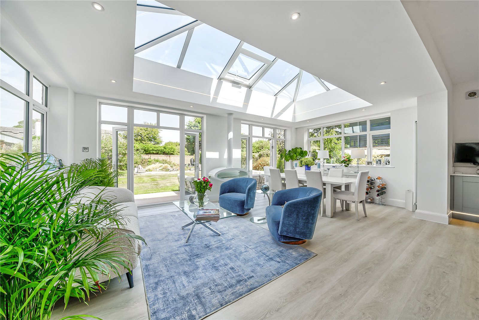 A welcoming entrance hall, with original wooden flooring and beautifully detailed panelling, sets the tone for what lies ahead. To the rear, the newly constructed extension opens into a striking open-plan kitchen, dining and living area, bathed in natural light from full-height glazing, patio doors, and an oversized sky lantern. This impressive space frames views of the landscaped garden and blurs the boundary between inside and out.