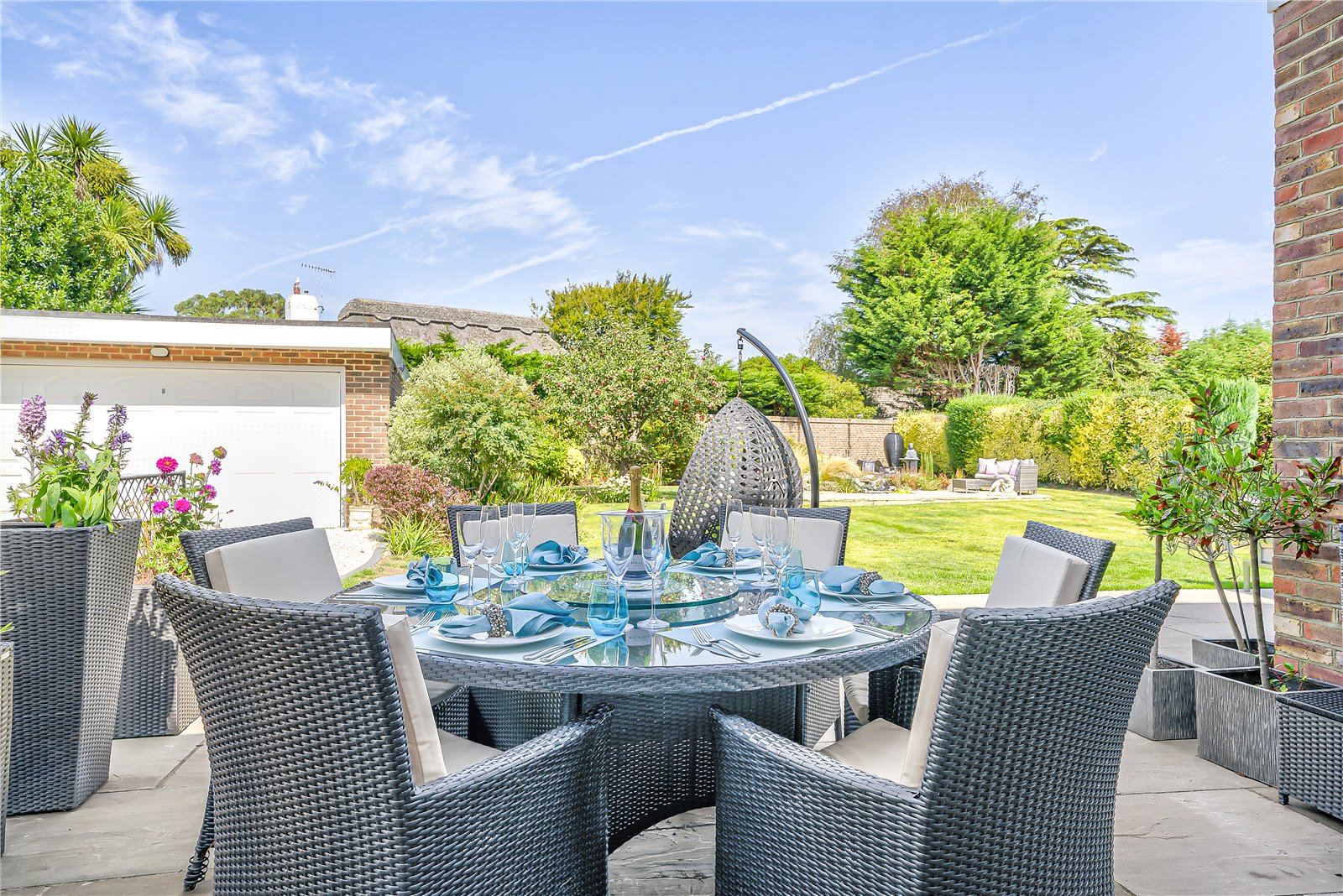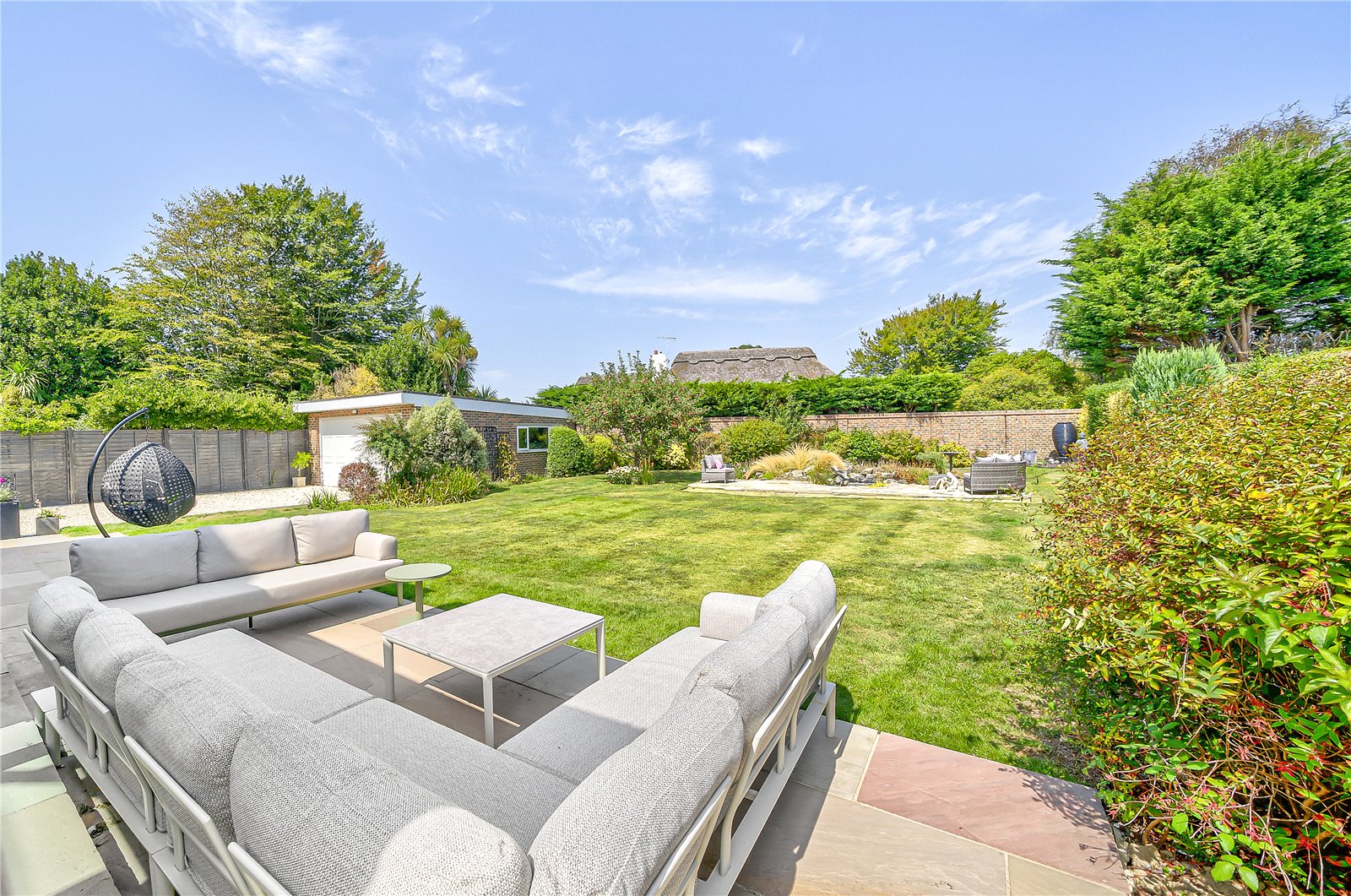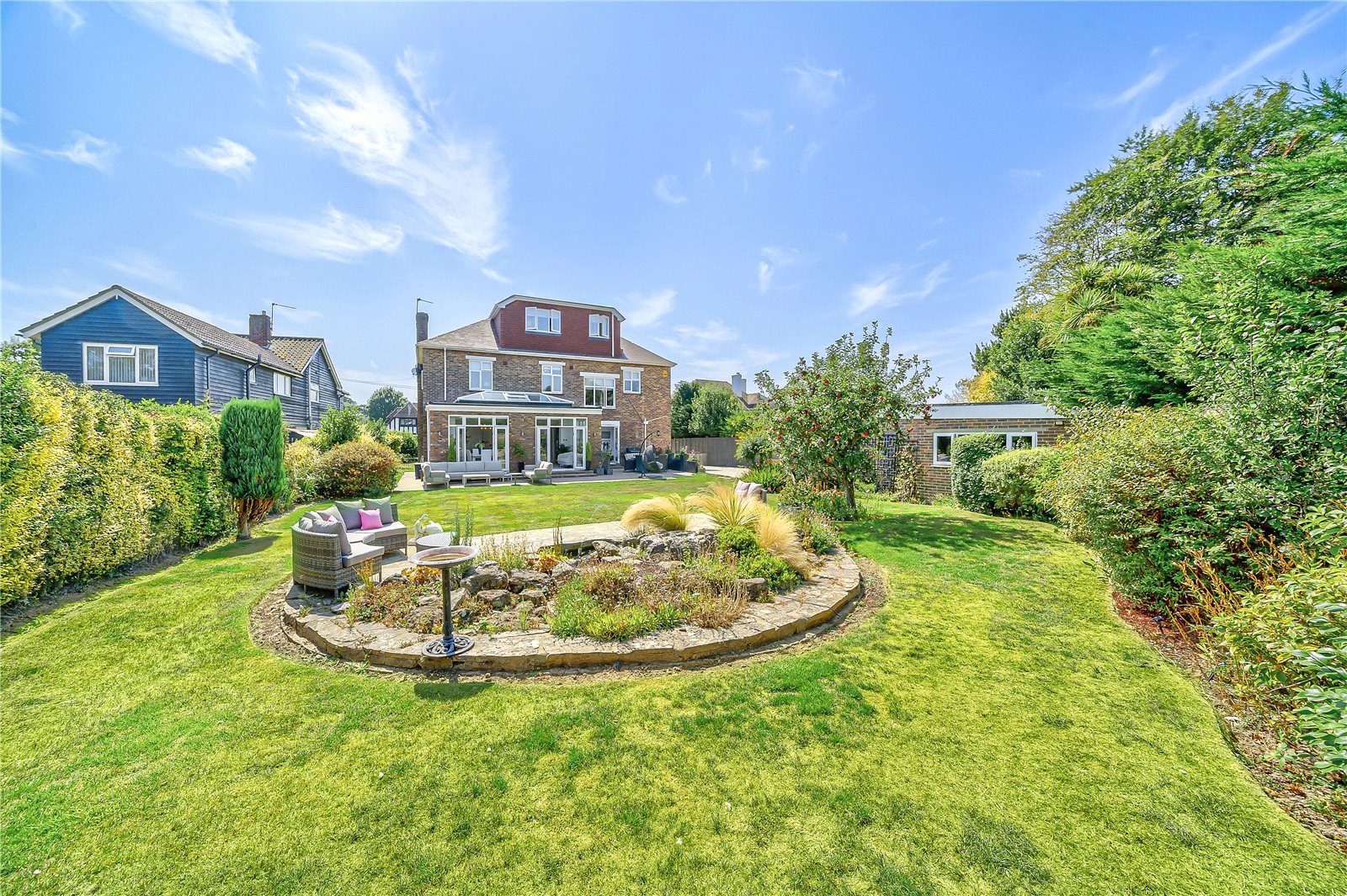 The mature rear garden is equally tranquil, offering excellent seclusion and side access from both ends of the house. A paved terrace is ideal for alfresco dining, while manicured lawns, established planting, and a charming ornamental water feature add to the sense of calm and relaxation.