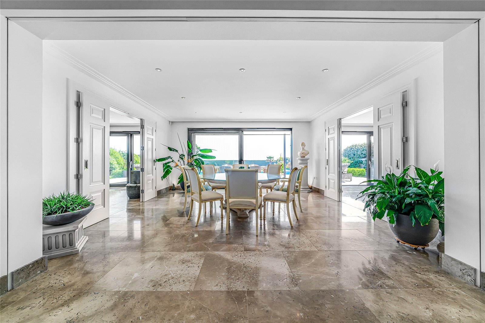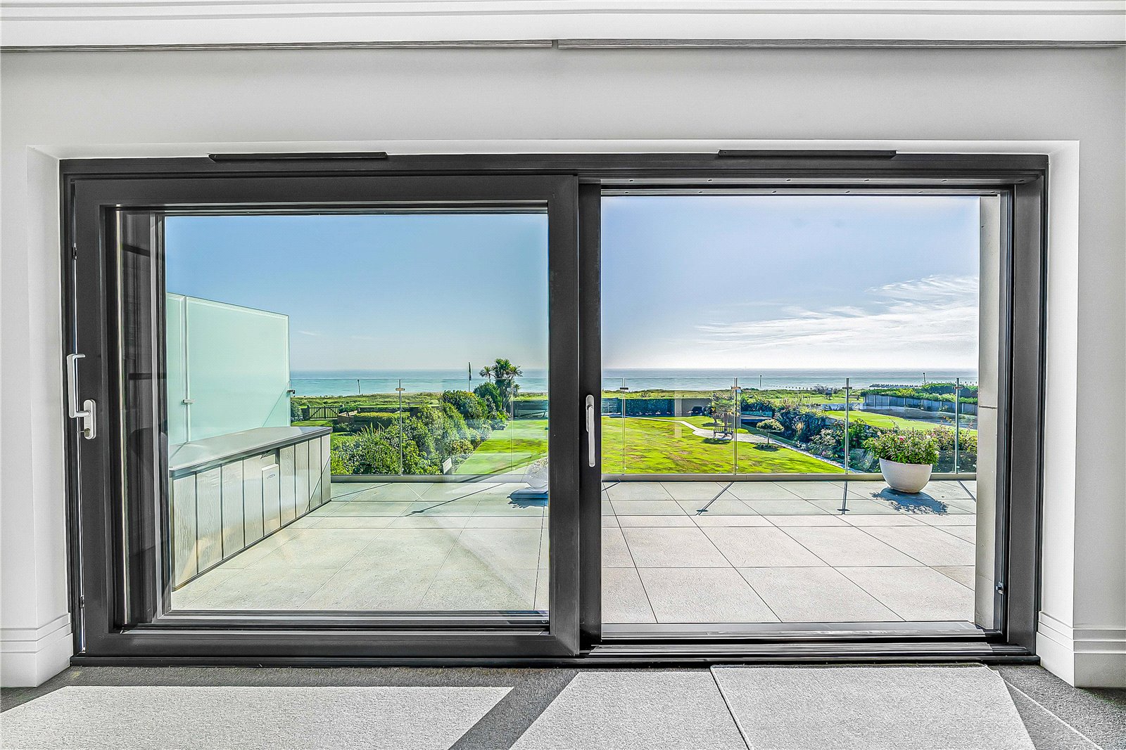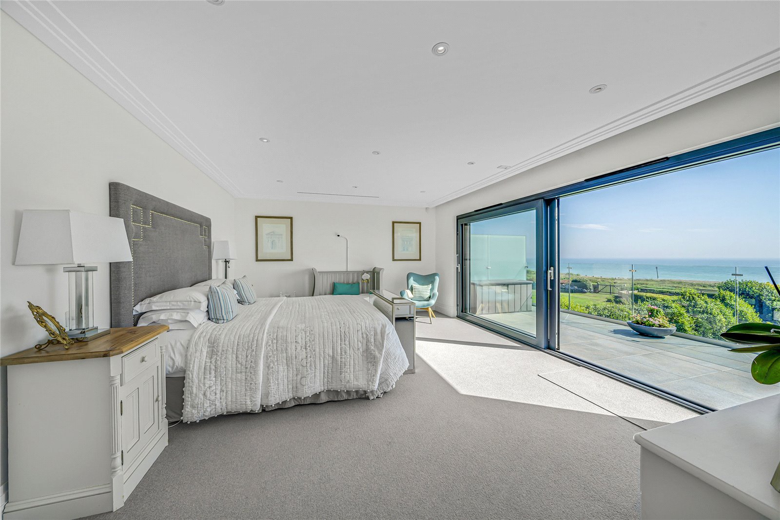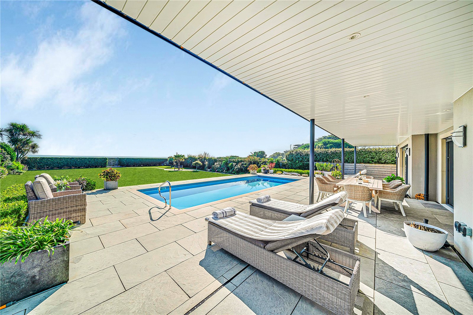 The outside is equally magnificent, featuring a double-width garage, a sweeping carriage driveway with electric gates, and a heated swimming pool with a retractable solar cover. The landscaped garden and extensive terrace envelop the property in tranquillity, completing the vision of a lavish coastal haven.