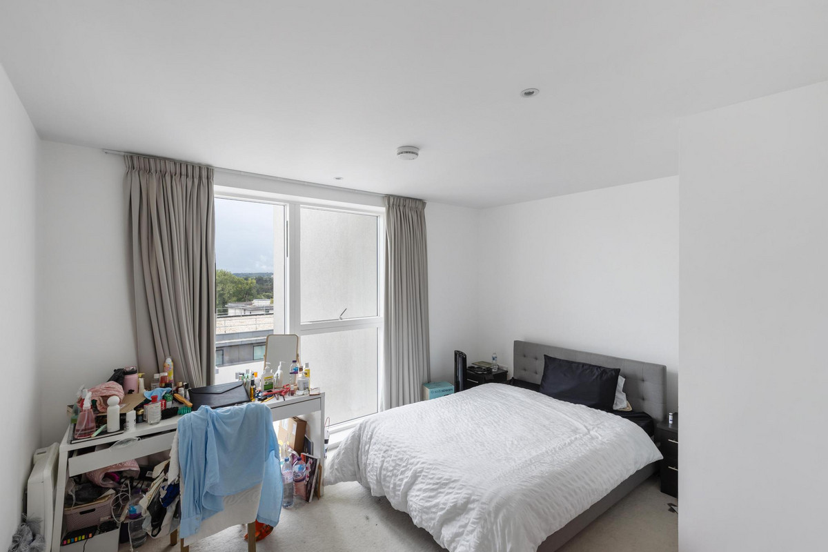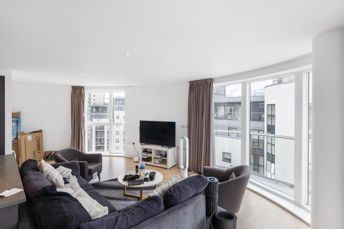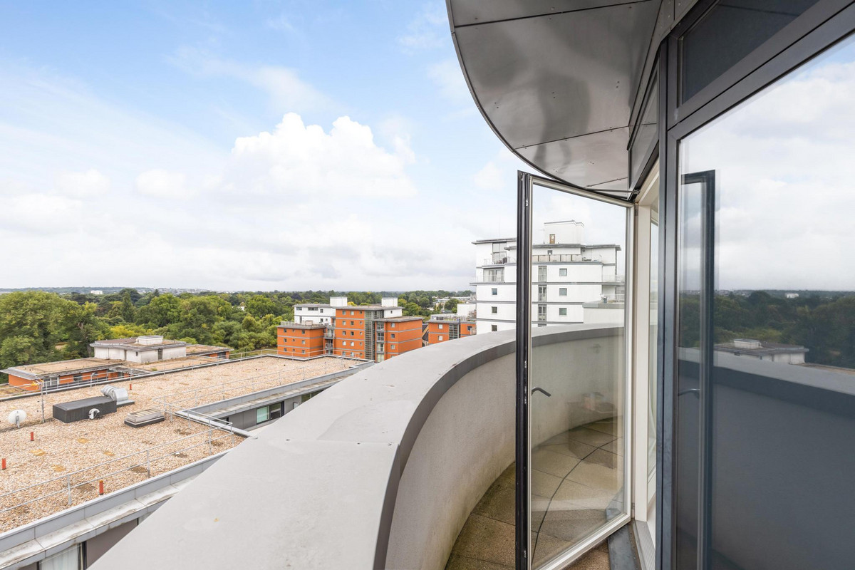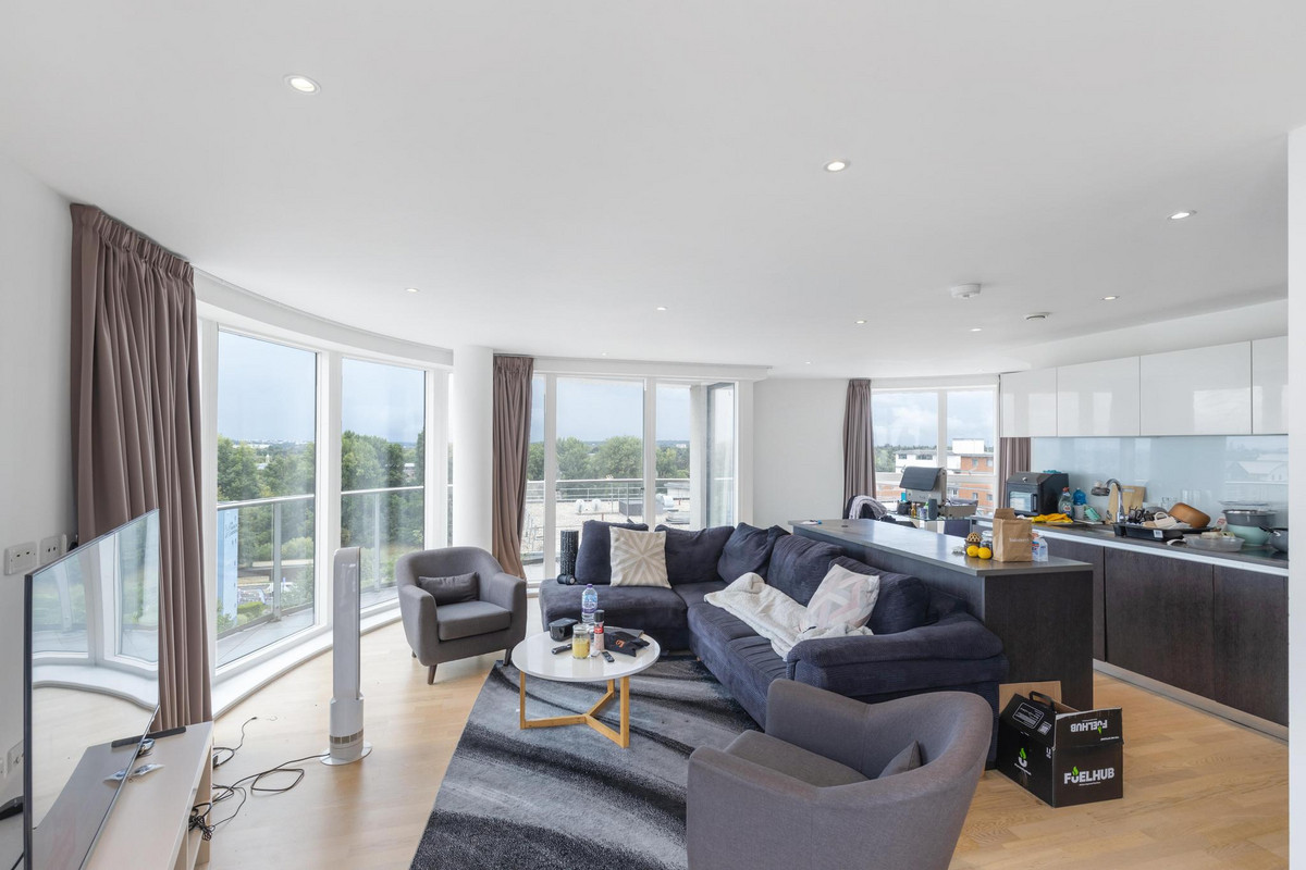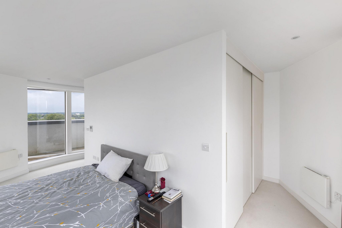 Occupying the 7th and 8th floors, this 1,391 sq ft residence is defined by its striking circular architecture and abundance of natural light. The impressive open-plan kitchen, dining, and reception space is framed by panoramic curved windows, creating a stunning backdrop for both everyday living and entertaining. From here, doors open onto a private wrap-around balcony, perfect for enjoying elevated views across Brentford and the City of London.