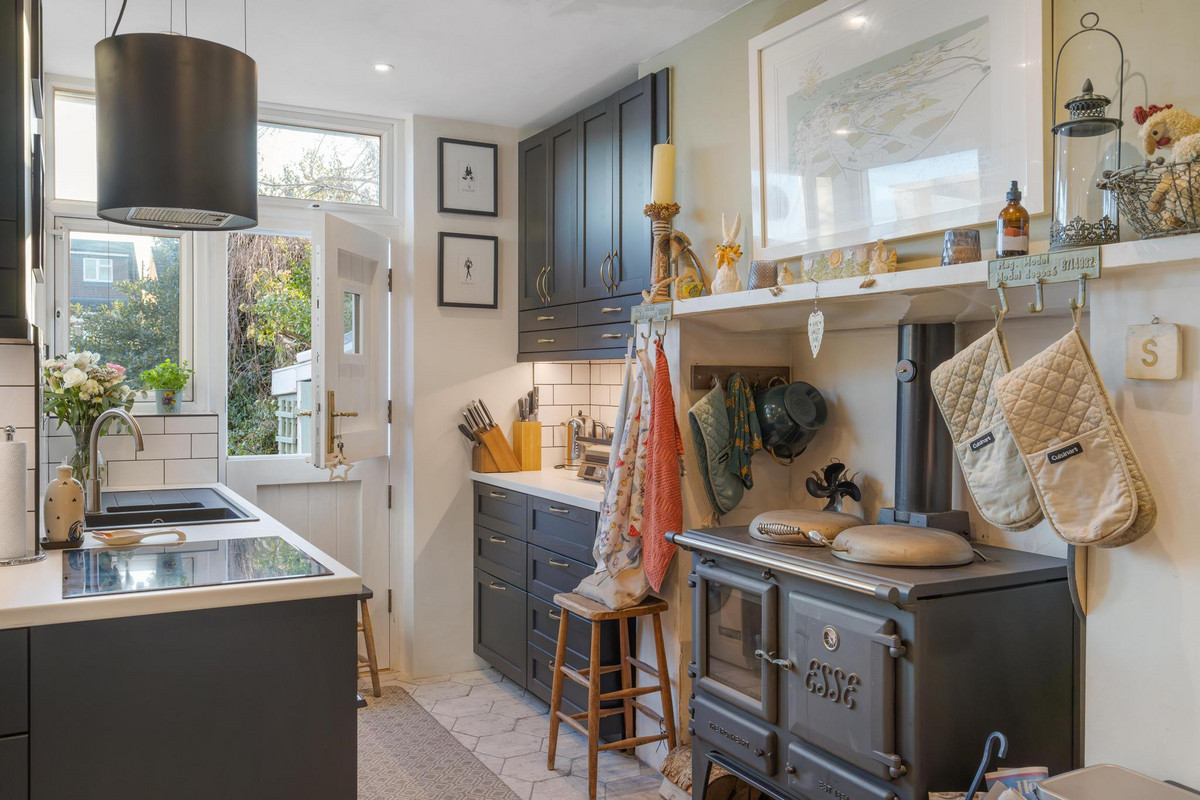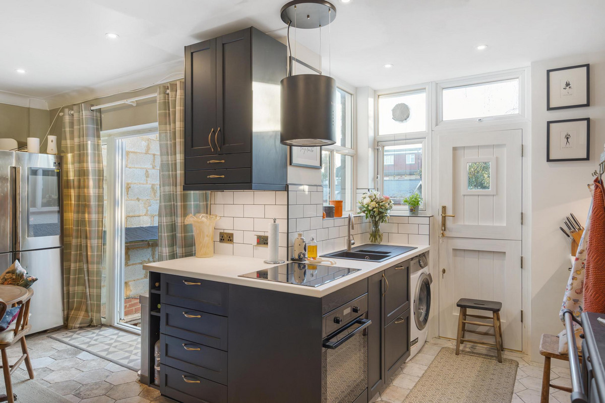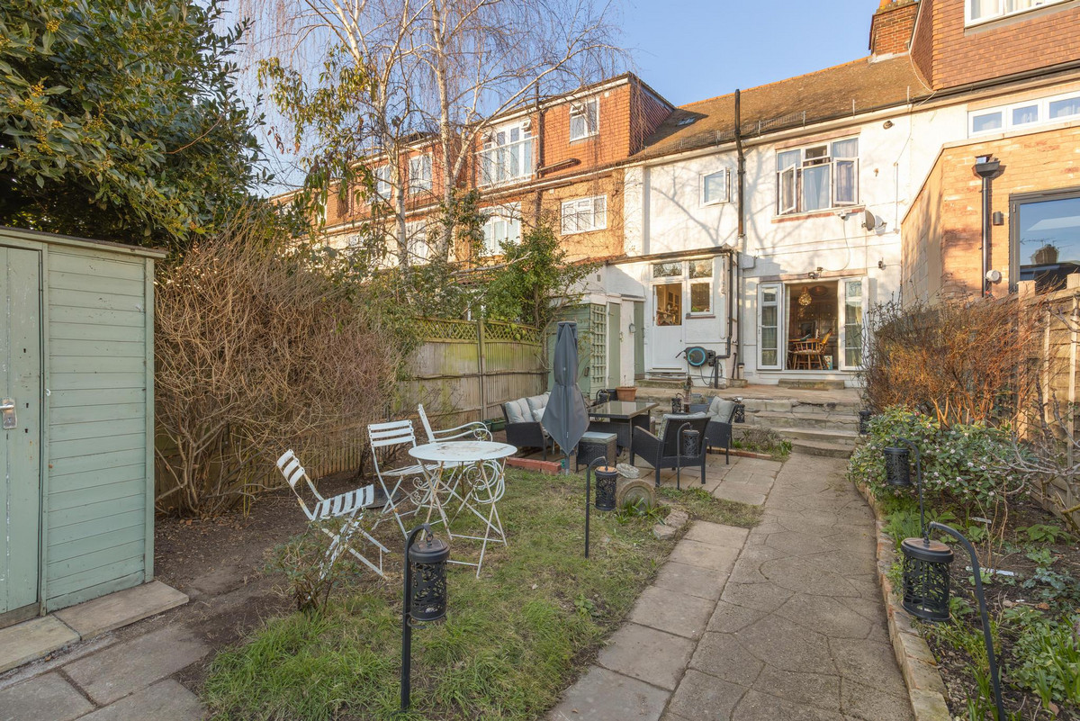 The large reception room is an inviting space for relaxation and entertaining, enhanced by a charming bay window that floods the room with natural light. The heart of the home is the stylish kitchen, which seamlessly connects to the garden through a unique barn door feature, creating a perfect blend of indoor and outdoor living. The garden itself is a standout feature—both spacious and private—with the added benefit of garage shutters for secure off-street parking via rear access.