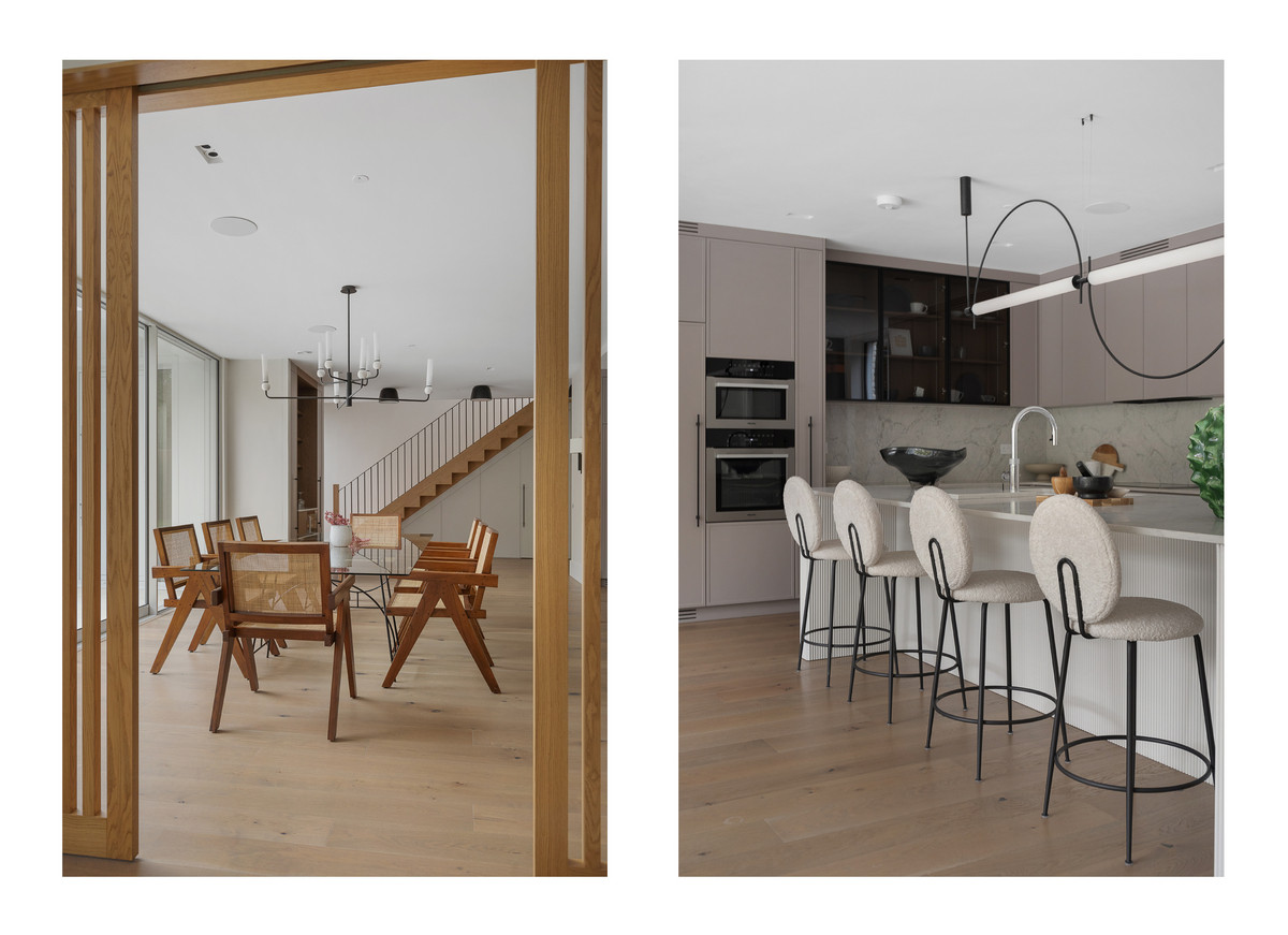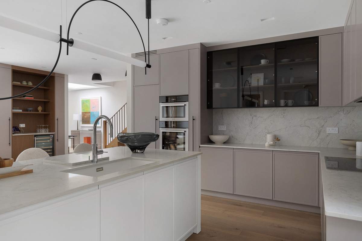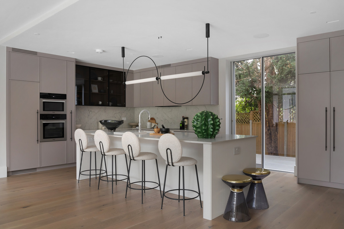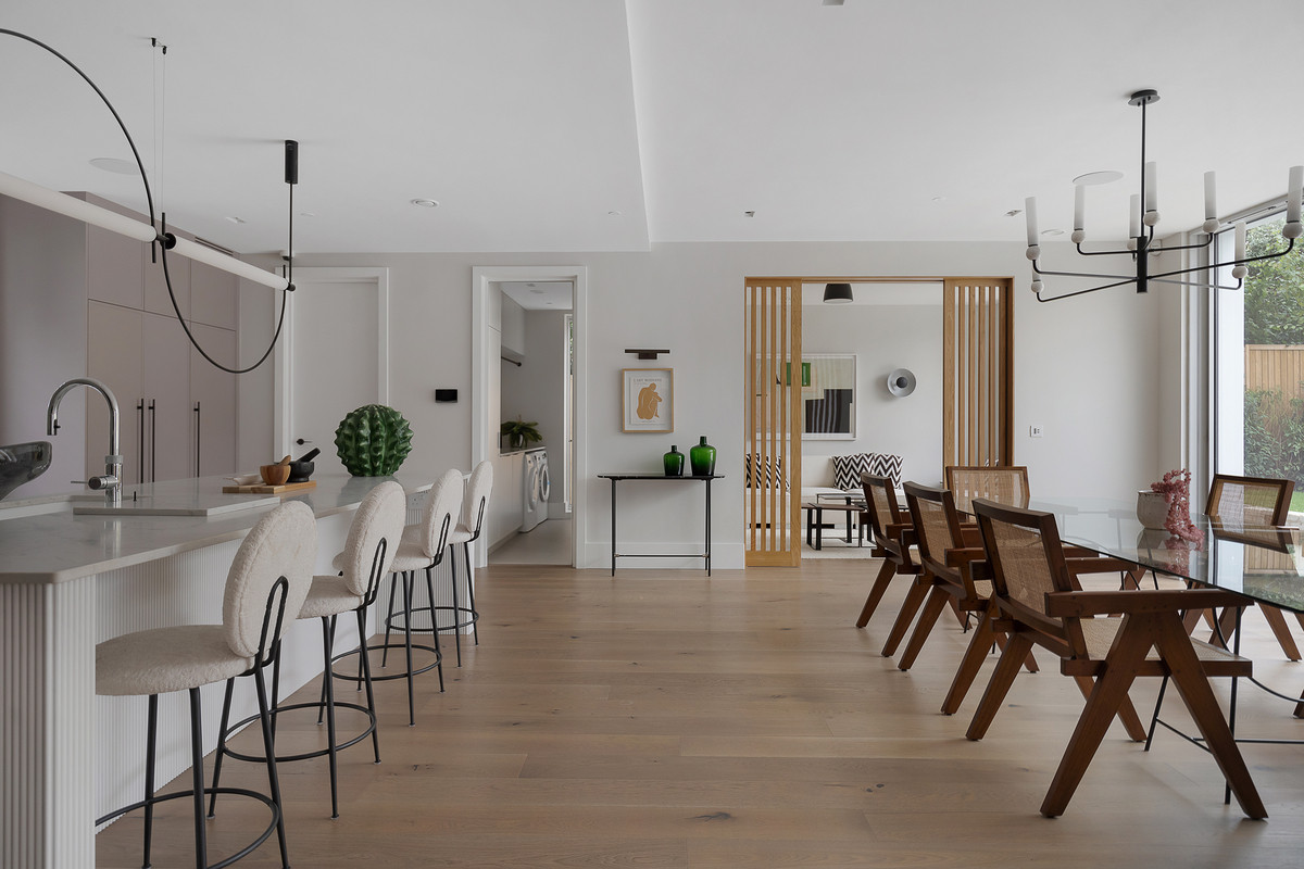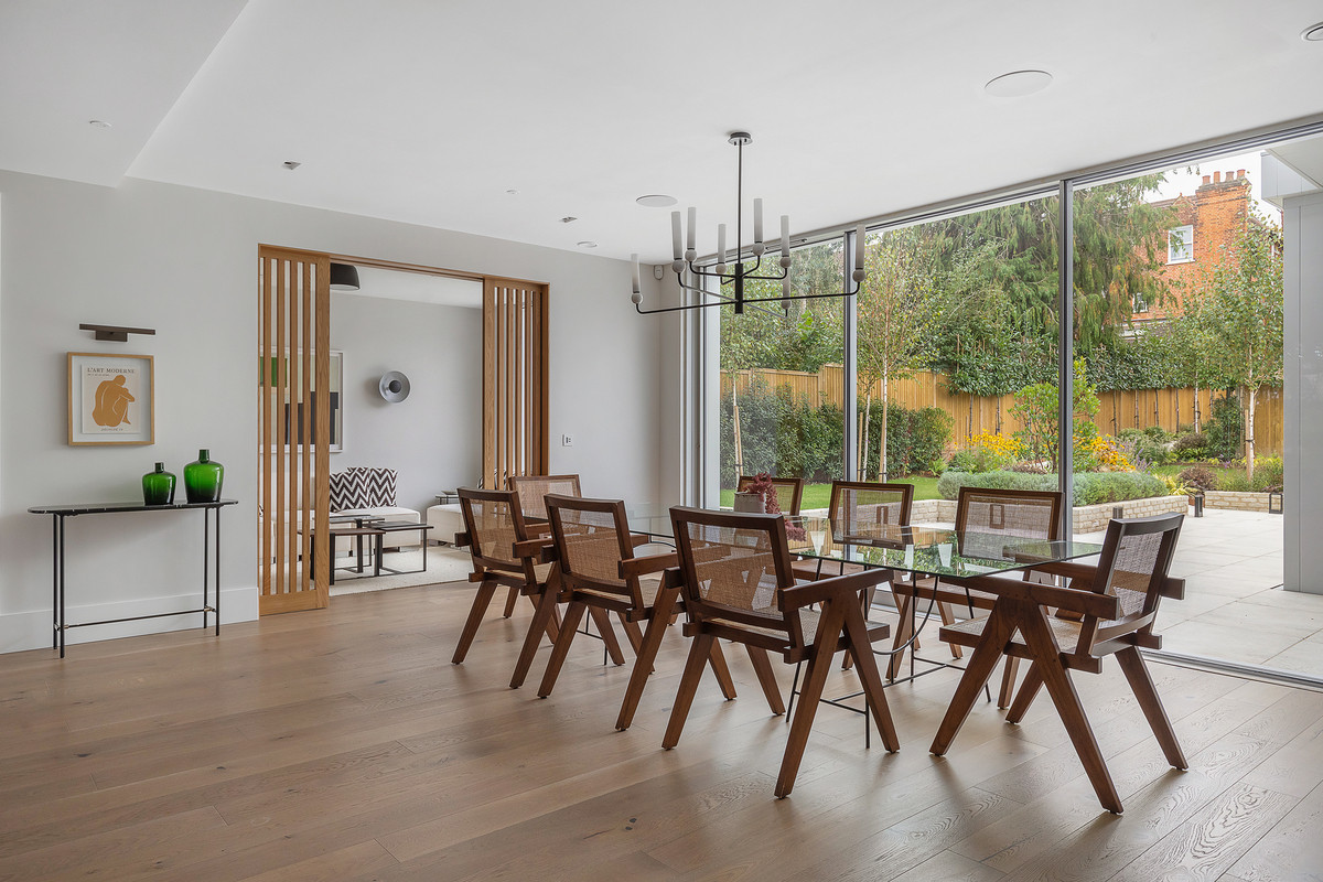This exceptional residence is a testament to meticulous design and unparalleled luxury. Bathed in natural light, Montpelier House seamlessly blurs the line between indoors and outdoors, thanks to its expansive slim-profile aluminium sliding doors that not only connect the reception room to the garden but also ensure outstanding insulation and energy efficiency. As you step inside, a grand entrance welcomes you, leading to a sumptuous kitchen and dining area adorned with top-of-the-line Miele appliances, a Quooker instant hot water and clean filtered water tap, dual dishwashers, a generously sized double door larder storage cupboard, and an eye-catching statement pendant lamp.