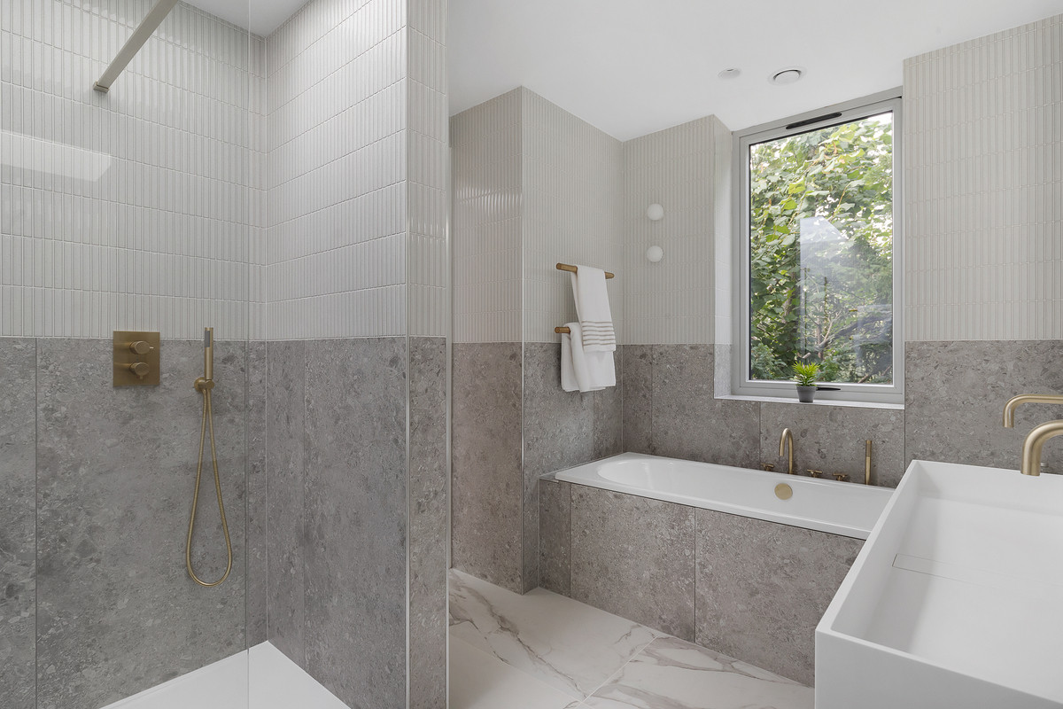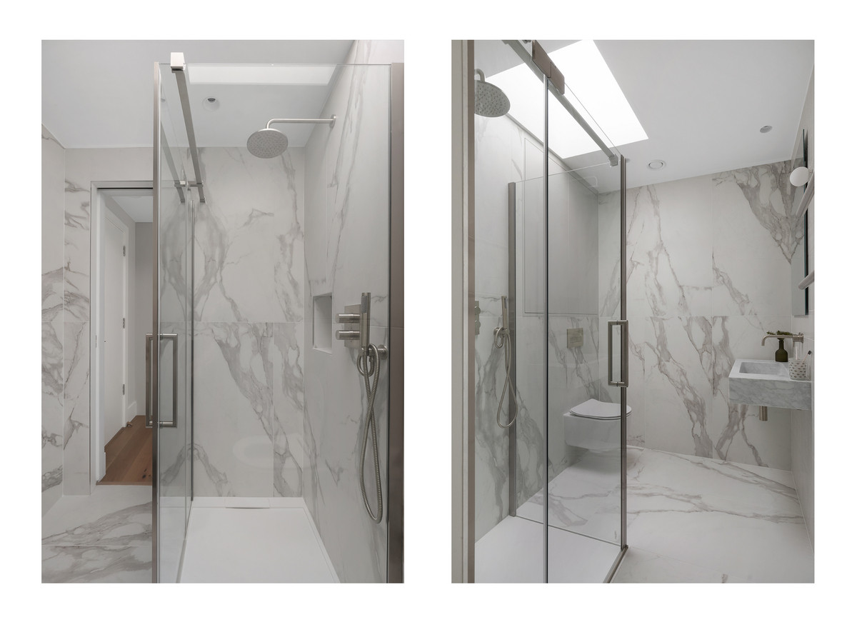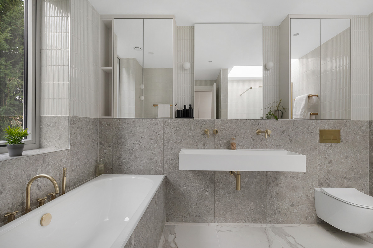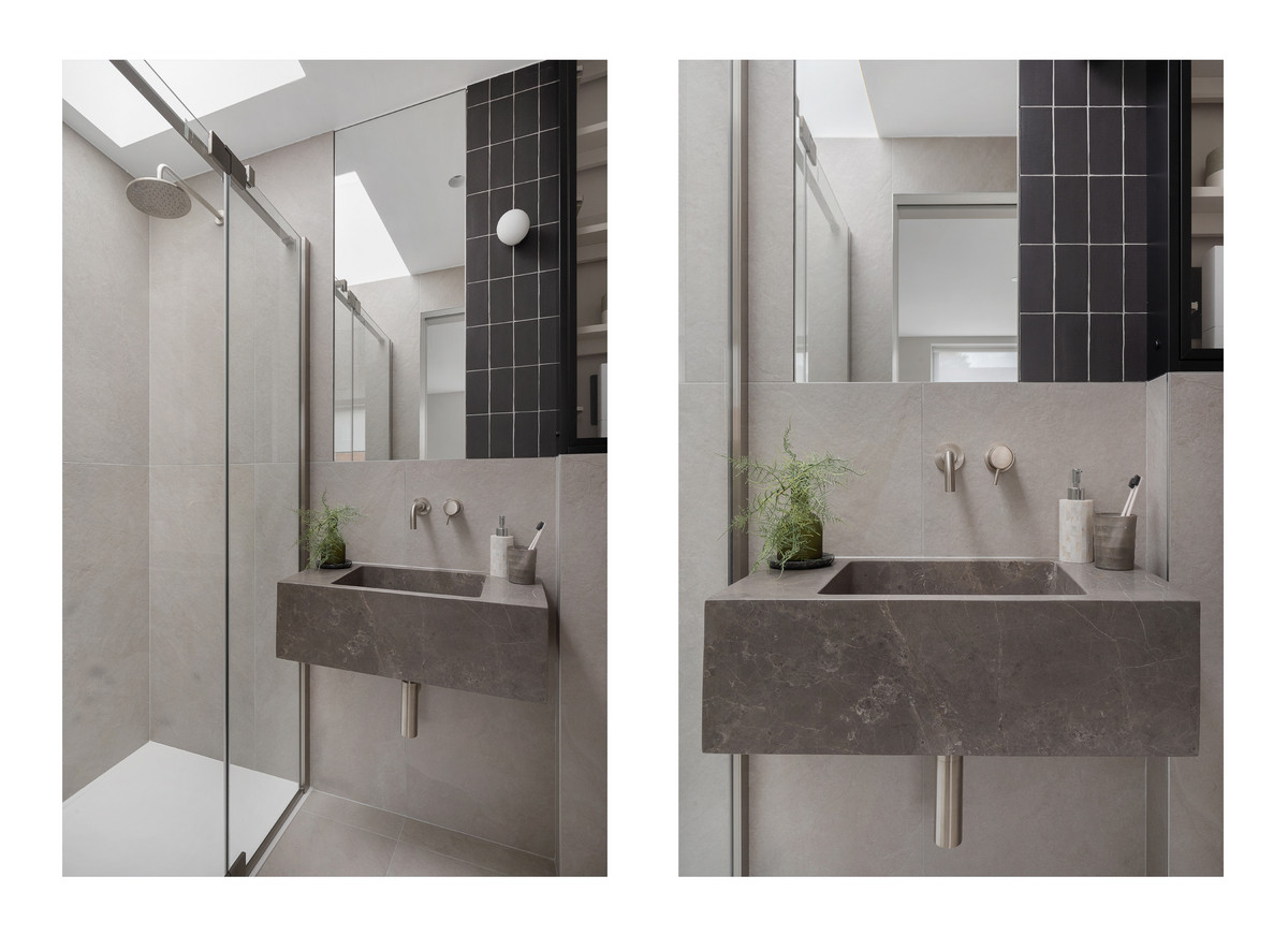 The bathrooms themselves are a testament to unique design, featuring distinctive stone wash basins and elegant brassware, complemented by bespoke fitted storage cabinets.