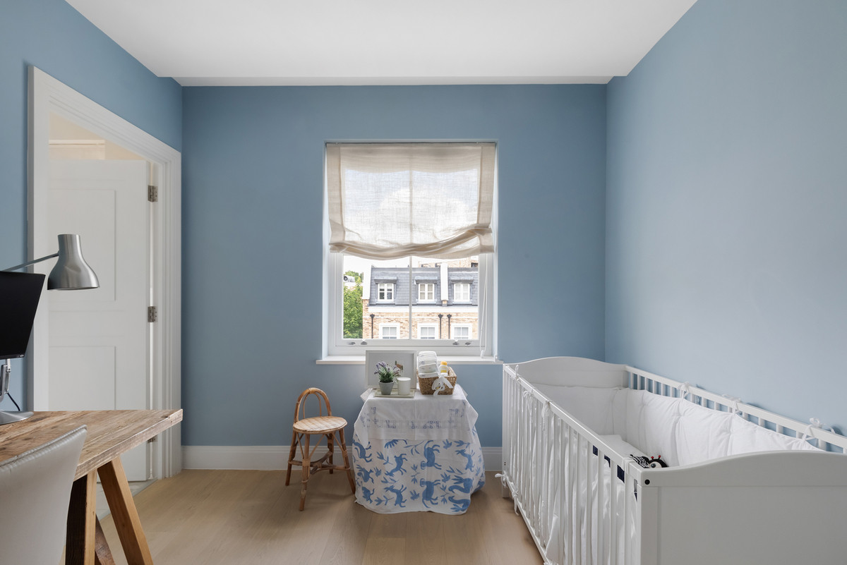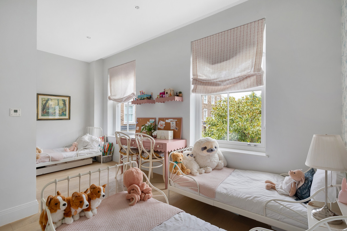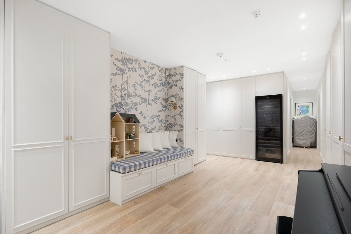 The converted lower ground floor serves as a children's playroom with custom-built cupboards, a substantial wine fridge, a fourth bedroom, a shower room, and a utility room.