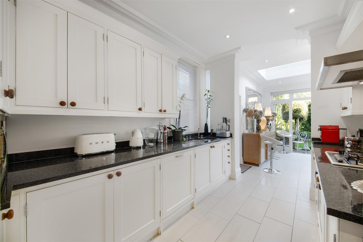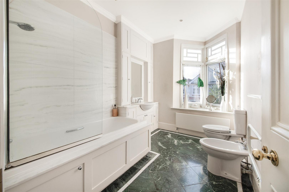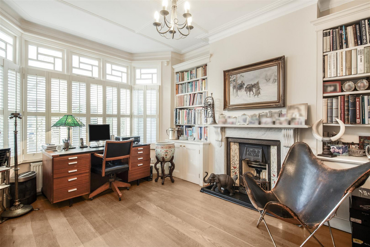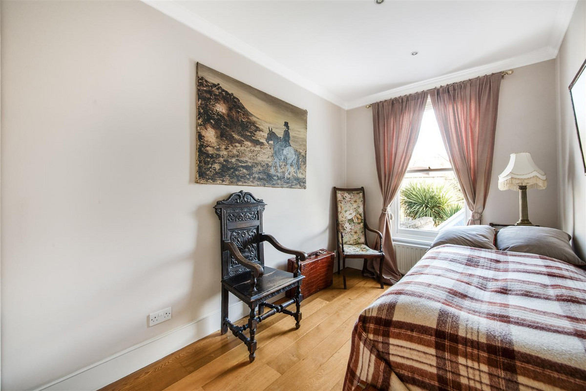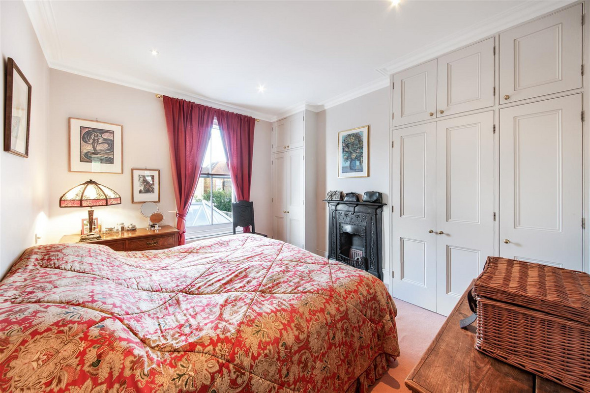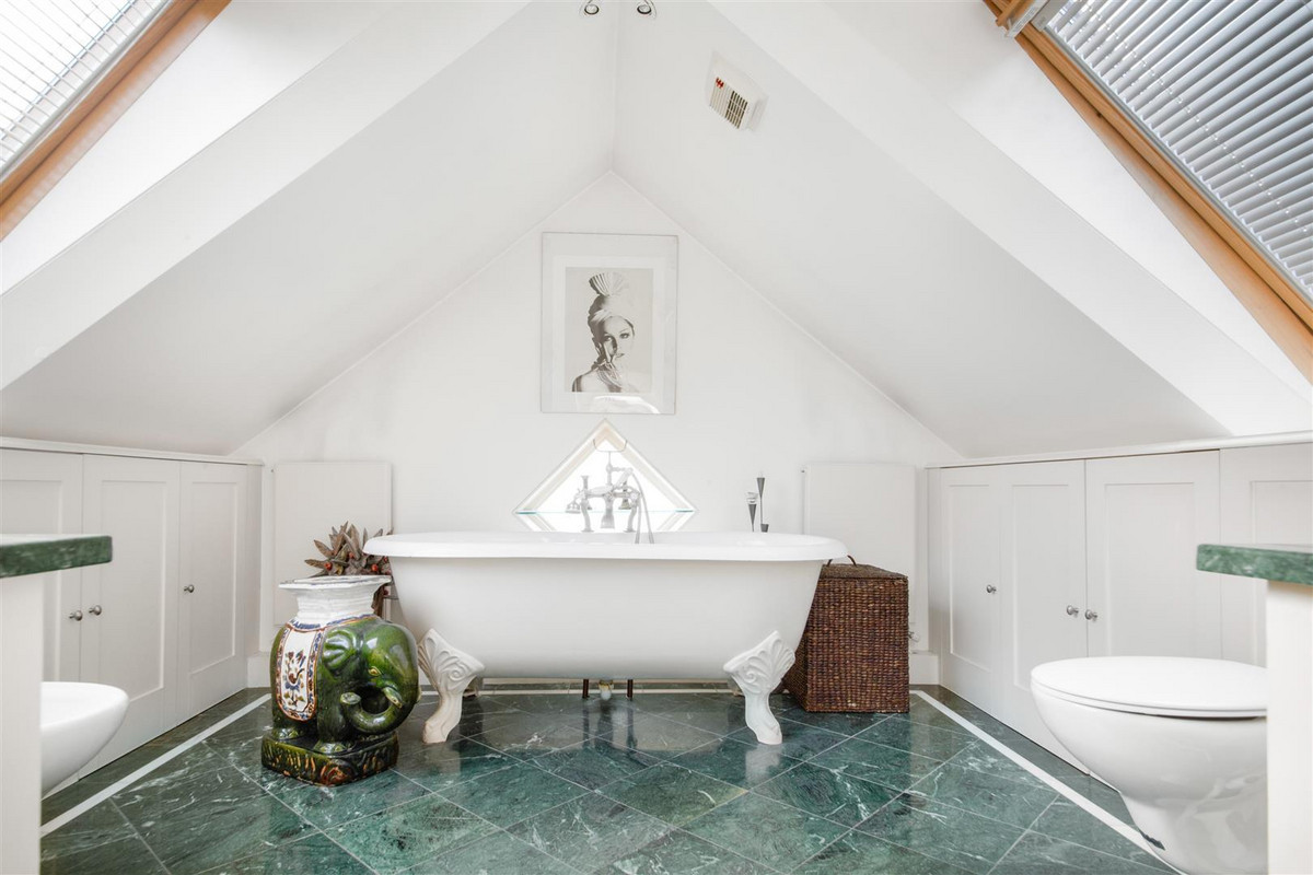 The first floor is home to three double bedrooms, all with fitted storage and two with fireplaces, served by a four piece family bathroom with feature window. The smallest of these bedrooms would be ideal as a quiet home office overlooking the garden. On the second floor is a fourth double bedroom with fitted eaves storage, skylights and an ensuite bathroom with free-standing bath and two sinks.
