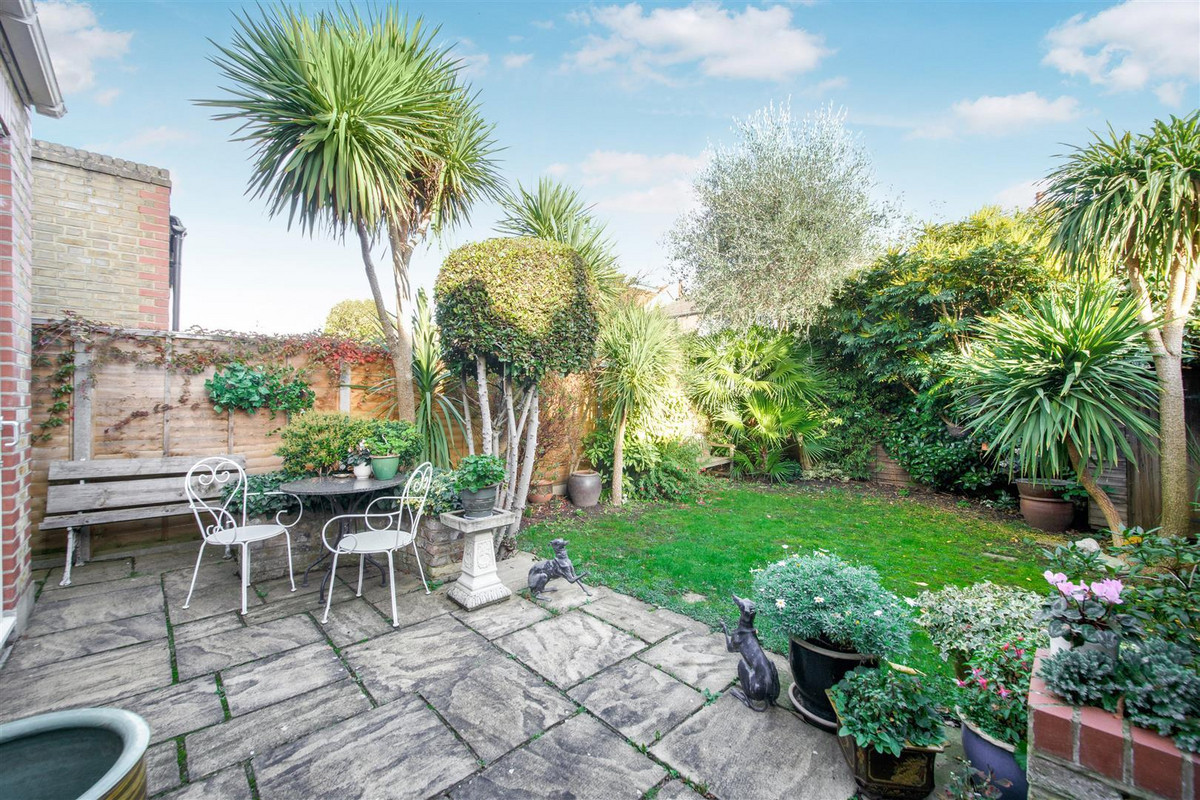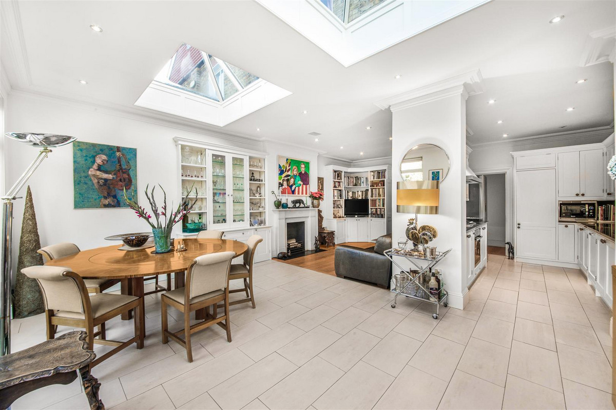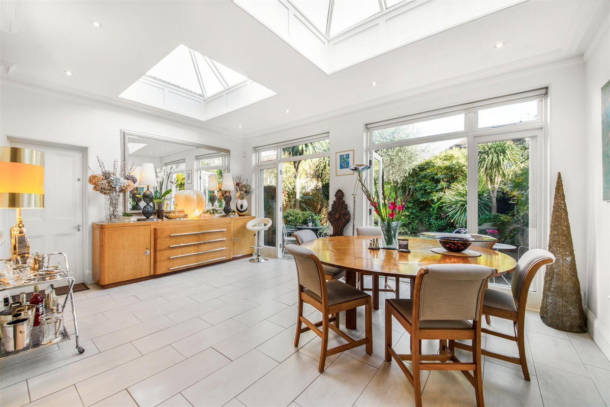 Entered through a convenient porch, the broad entrance hall with guest cloakroom leads to the front living room with bay window, bespoke shutters and fireplace. The 25 ft rear living room, also with a fireplace, has a broad dining area, open plan to the fully fitted kitchen. From the dining area, which has large roof lanterns, two pairs of French windows give access to the landscaped rear garden with paved terrace, a lawn, mature trees and established plants. There is access along the side of the house to from the front garden, with its neat bushes and majestic palm tree, through to the back garden.