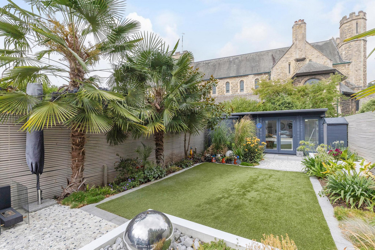 To the rear, the landscaped garden is divided into four distinct areas, including a spacious TREX deck, a recessed seating zone, a water feature and a high-quality AstroTurf lawn. At night, Wi-Fi-controlled lighting transforms the space into something truly special, creating a magical ambiance with the illuminated church as a backdrop.