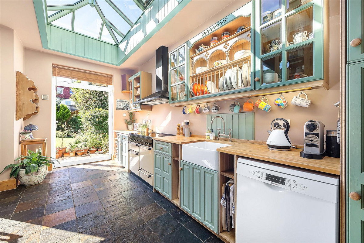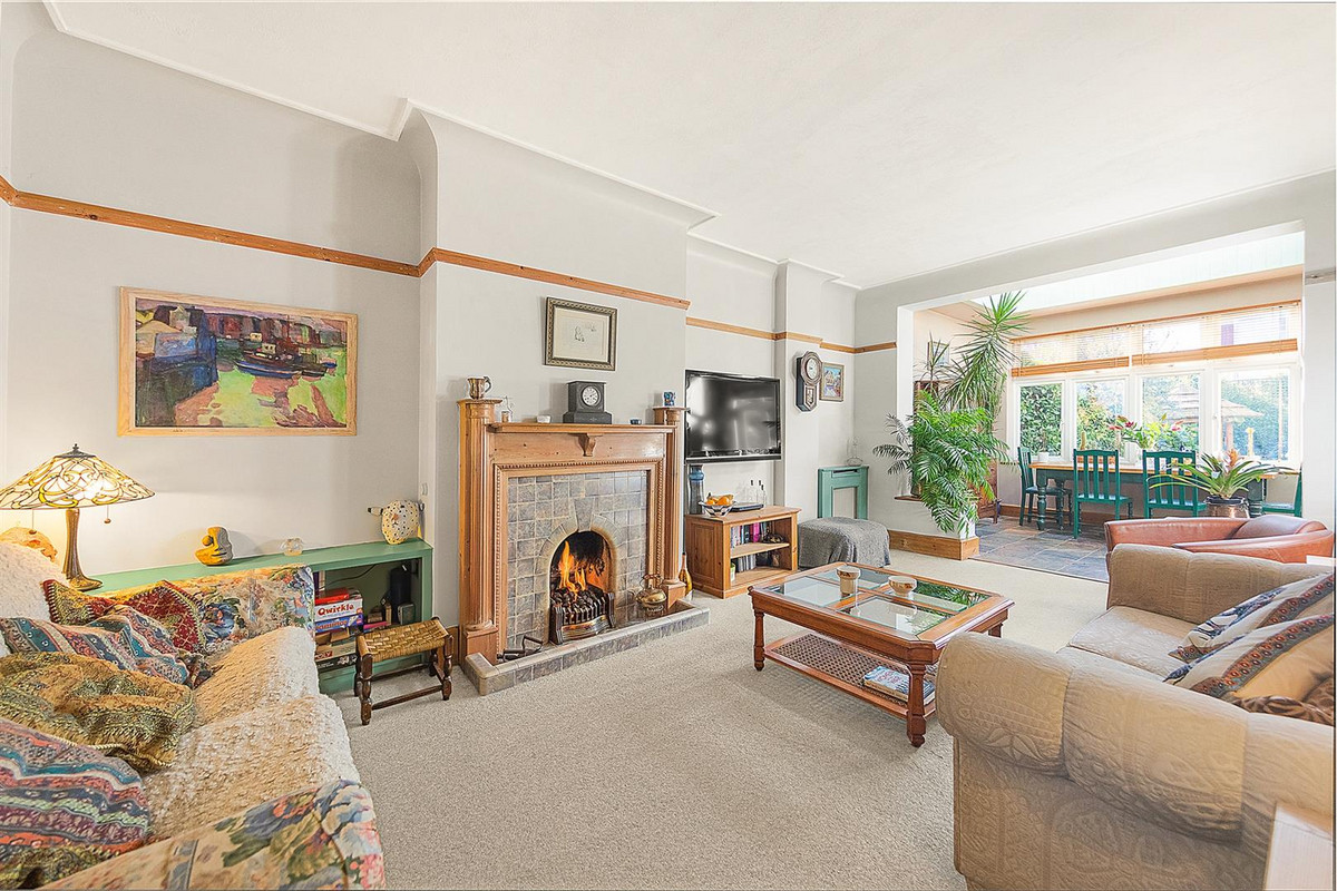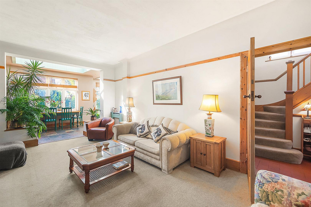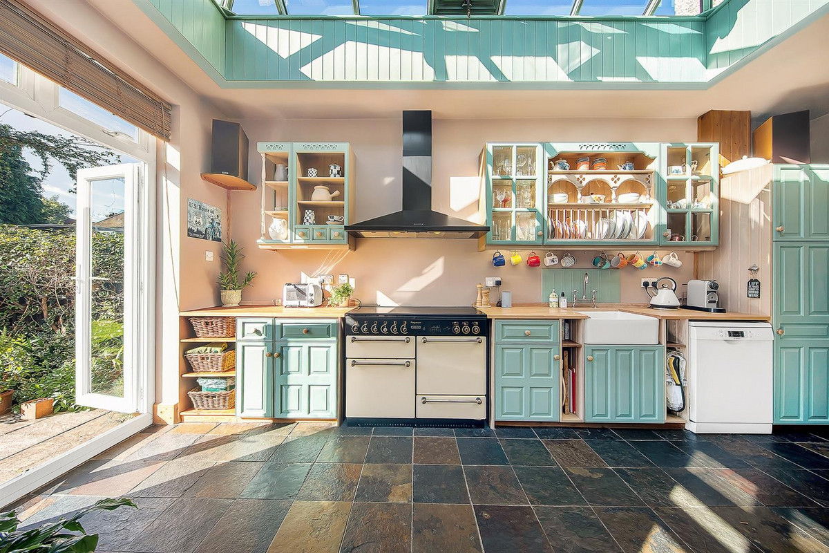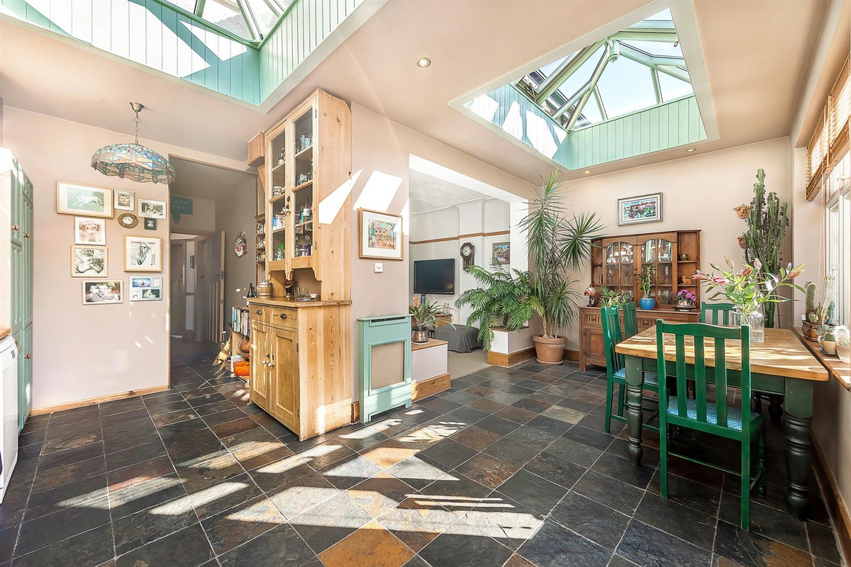 Accessed through a porch, the quarry-tiled entrance hall leads to each of the ground floor rooms. Period details feature throughout the house, including wooden doors, dado rails, picture rails and fireplaces. The front living room, currently used as a library and study, has fitted cupboards and bookshelves, and a large bow window to the front. The rear living room features a tiled fireplace and is semi-open plan to the large orangery extension that forms the kitchen and dining room at the back of the house. This room is bathed in natural light from two roof lanterns and French windows and doors to the garden. The fitted kitchen has a Belfast sink, an integrated fridge-freezer and space for a dishwasher. A rare feature in the kitchen is the original maid's call box! Completing the ground floor is a downstairs WC/laundry room and an understairs storage cupboard.