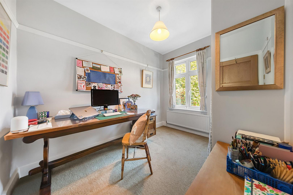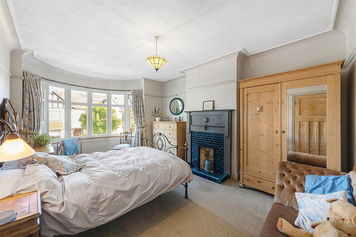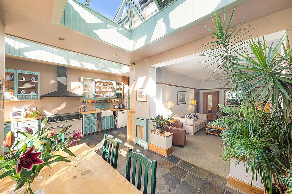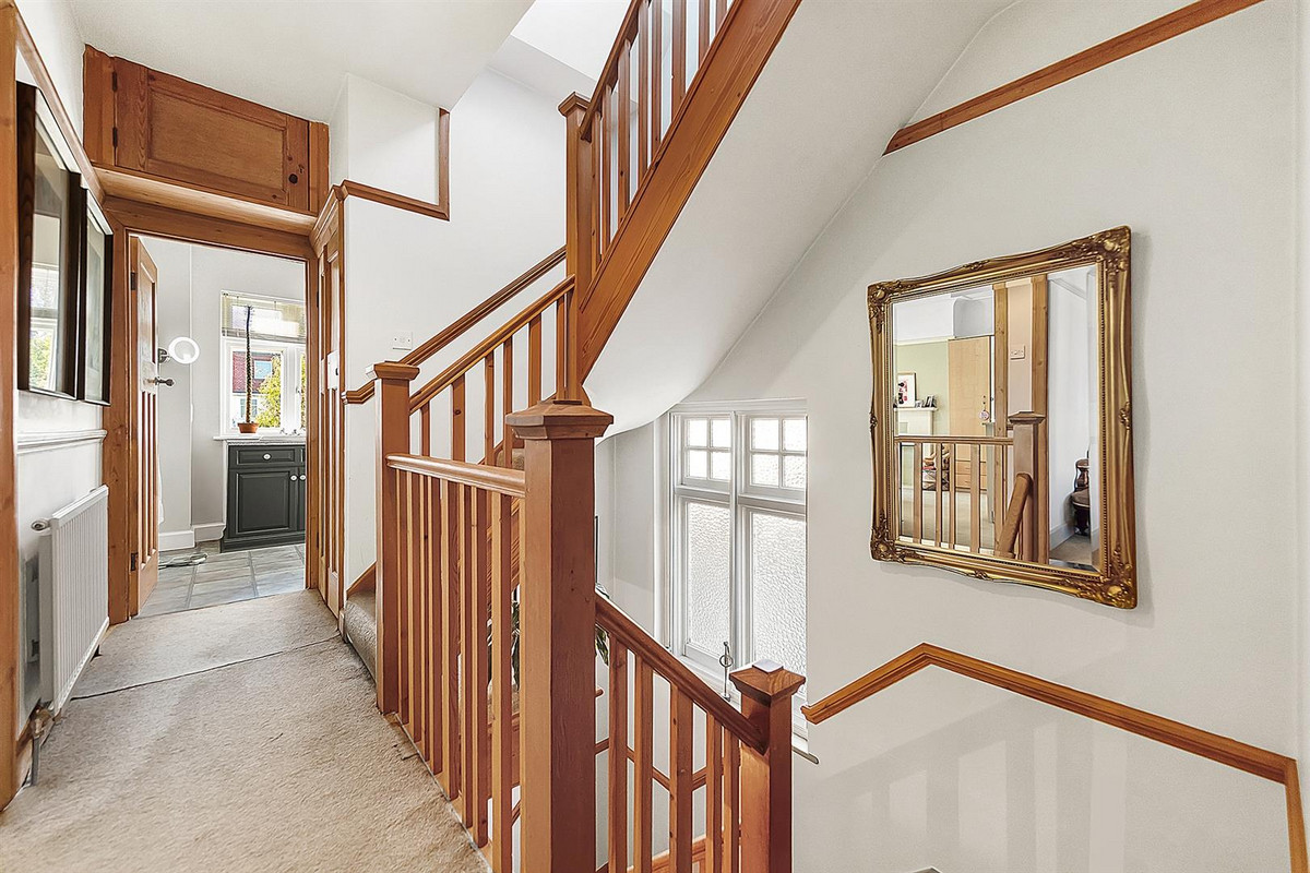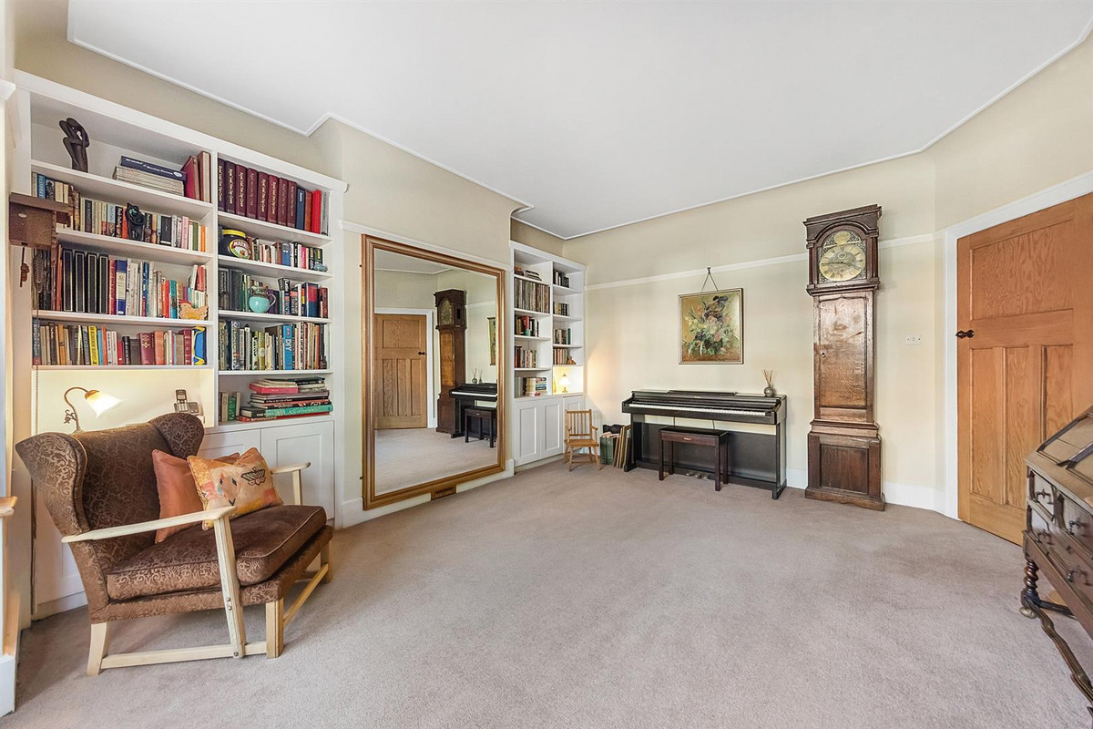 Accessed through a porch, the quarry-tiled entrance hall leads to each of the ground floor rooms. Period details feature throughout the house, including wooden doors, dado rails, picture rails and fireplaces. The front living room, currently used as a library and study, has fitted cupboards and bookshelves, and a large bow window to the front. The rear living room features a tiled fireplace and is semi-open plan to the large orangery extension that forms the kitchen and dining room at the back of the house. This room is bathed in natural light from two roof lanterns and French windows and doors to the garden. The fitted kitchen has a Belfast sink, an integrated fridge-freezer and space for a dishwasher. A rare feature in the kitchen is the original maid's call box! Completing the ground floor is a downstairs WC/laundry room and an understairs storage cupboard.