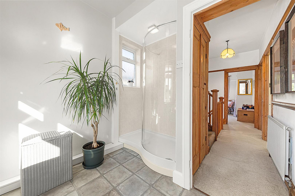 On the first floor are three bedrooms, one of which has a south-west-facing balcony and another has a built-in wardrobe. These bedrooms are served by a large shower room.