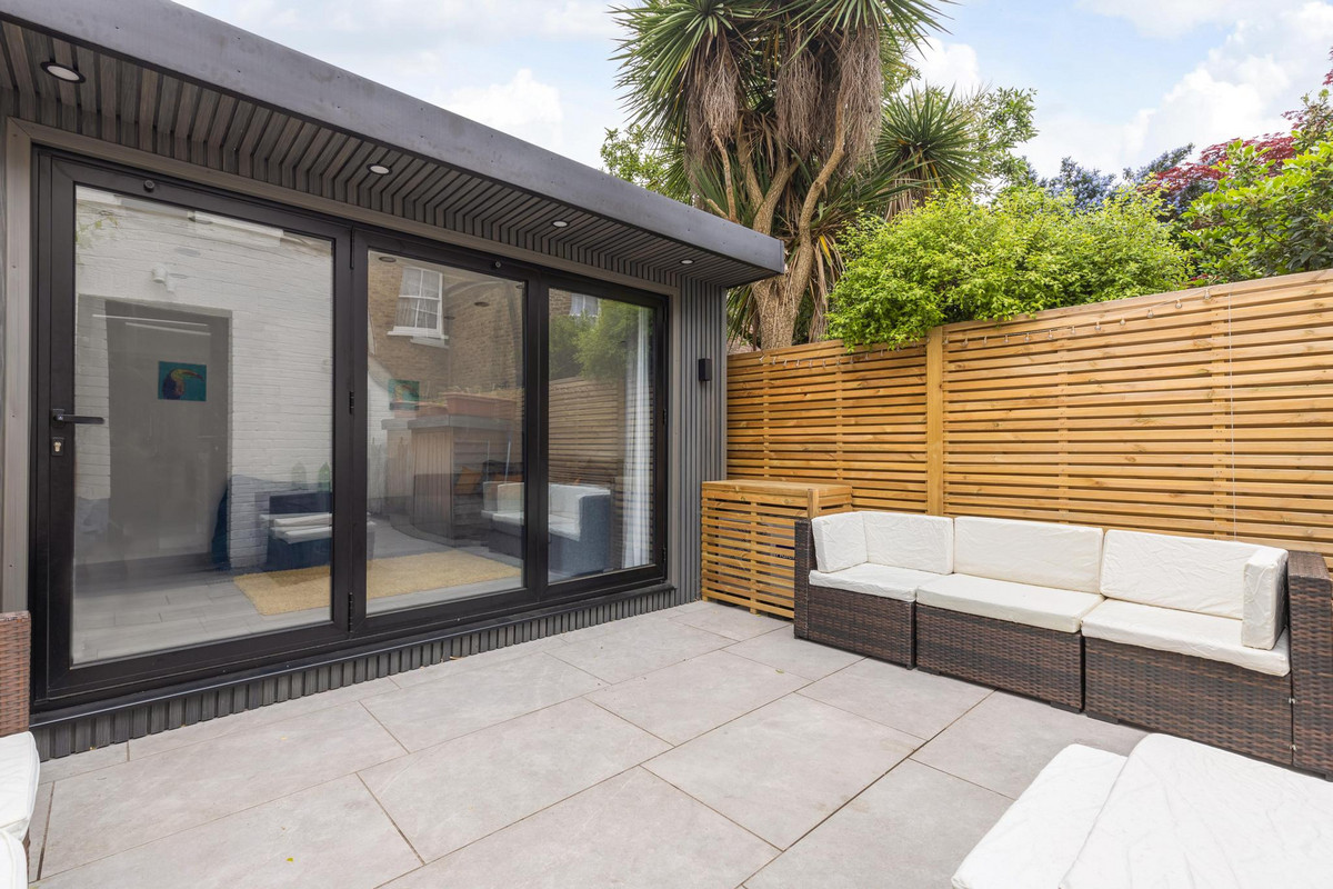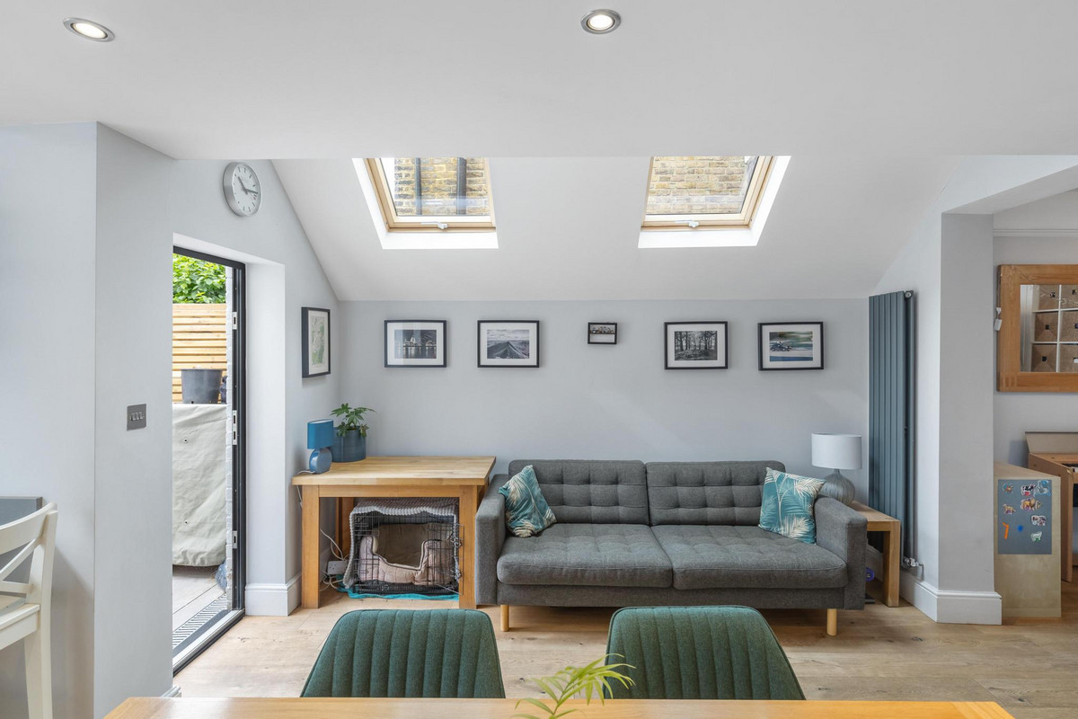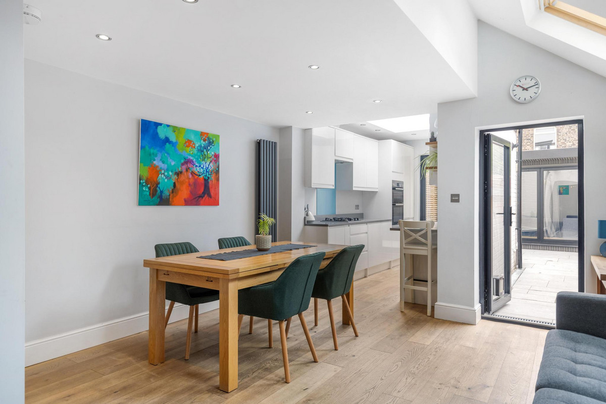 The ground floor features two bright reception rooms, a separate dining room, and a fully fitted kitchen that leads out to a south-facing private garden. At the rear, a spacious, air-conditioned and insulated garden office, still under warranty, offers an ideal space for remote working, fitness, or creative use.