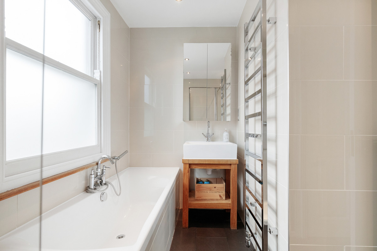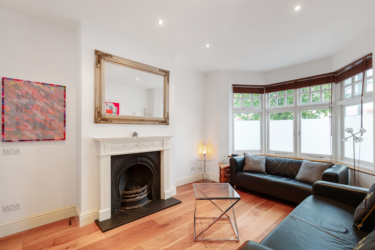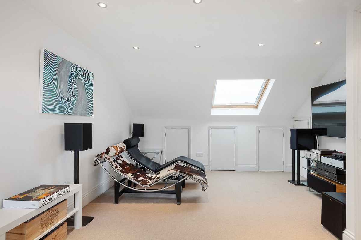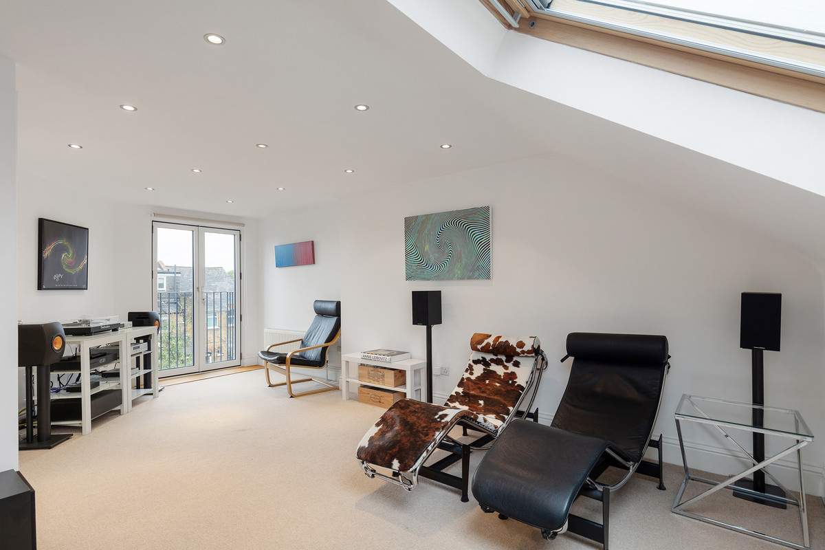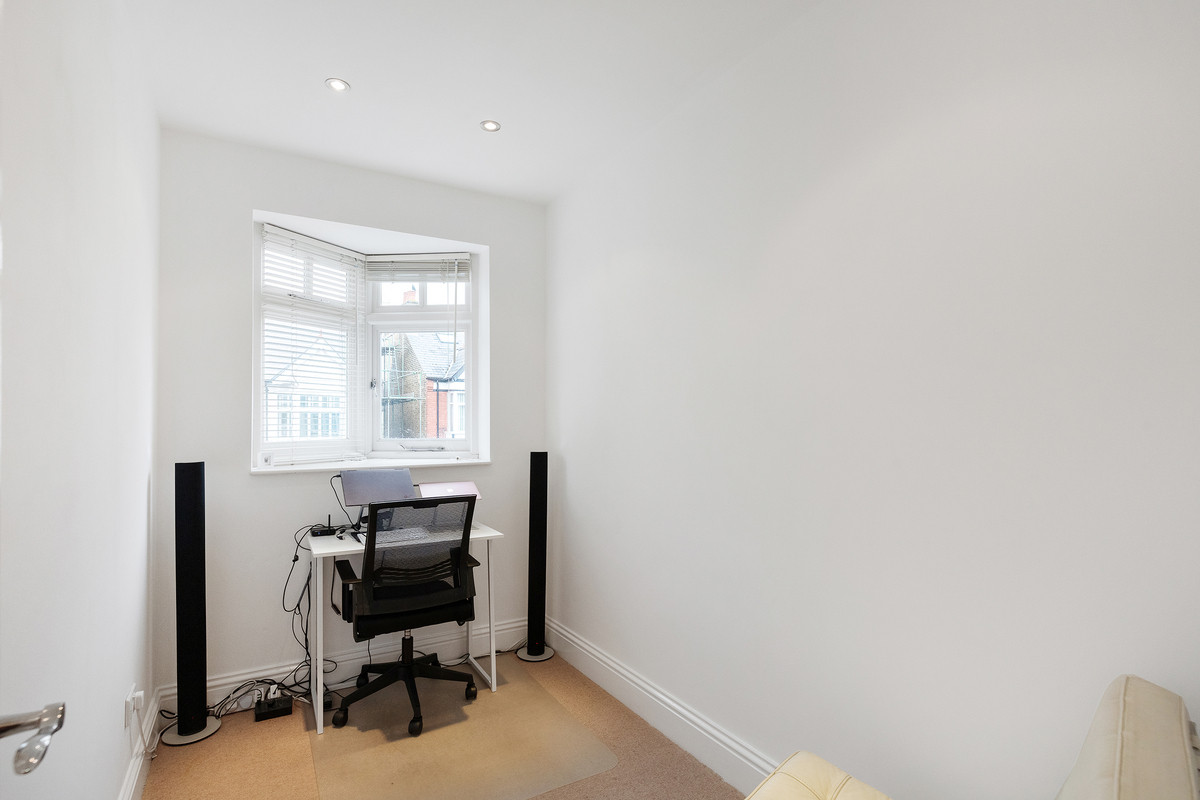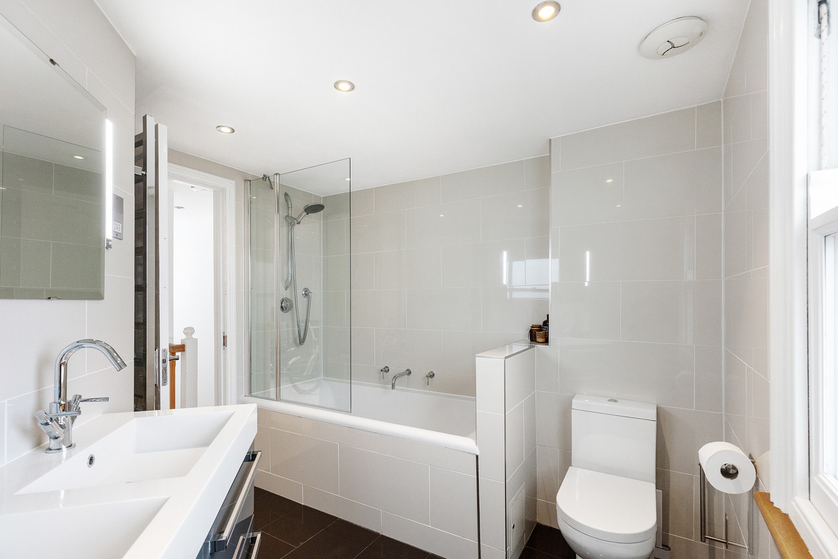 On the first floor, you'll find two well-proportioned bedrooms, along with a smaller room that could serve as an office or a child's room, complete with a double-glazed oriel bay window. The modern family bathroom on this level features underfloor heating and the top floor hosts a large bedroom with excellent head height, a stylish bathroom and plenty of eaves storage.