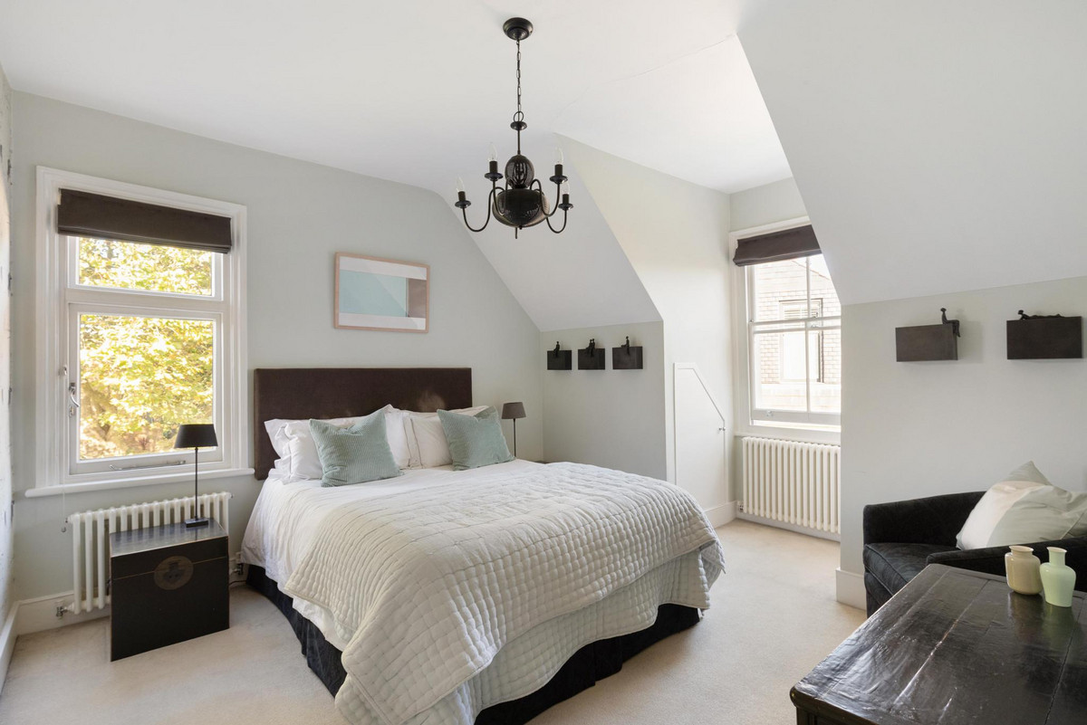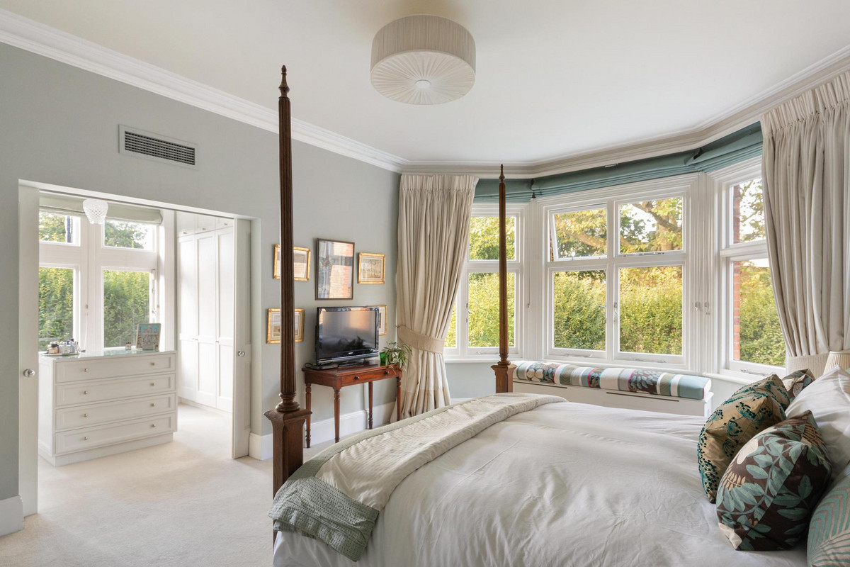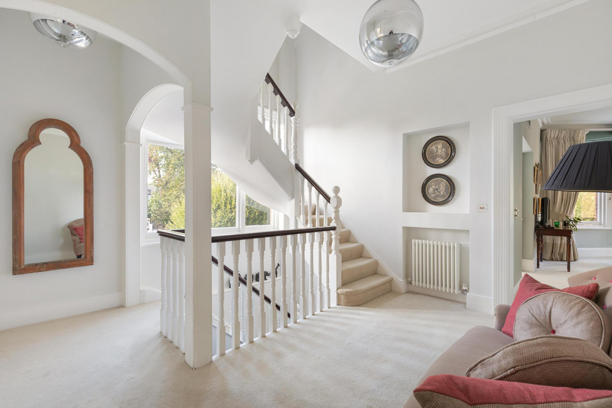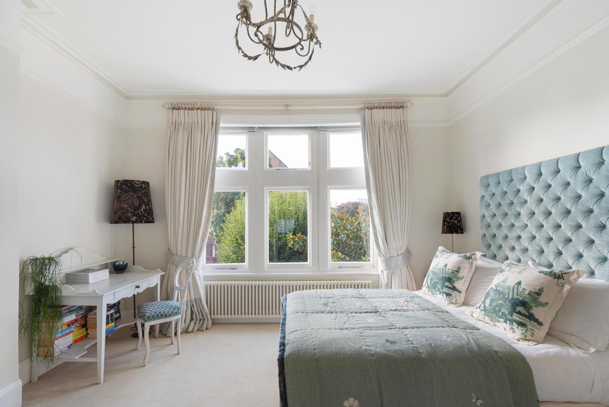 Upstairs, the first floor houses the magnificent principal bedroom, featuring a custom-designed dressing room and a luxurious en suite bathroom equipped with a steam shower. A guest suite on this floor also offers a private dressing room and a beautifully panelled en suite bathroom with an original roll-top bath. The second floor comprises three additional double bedrooms, one with its own en suite, as well as a spacious family bathroom.