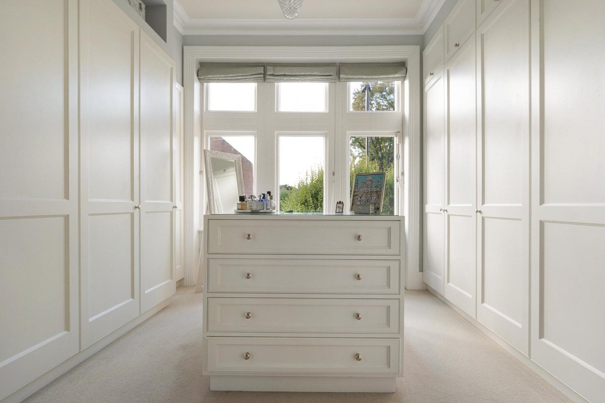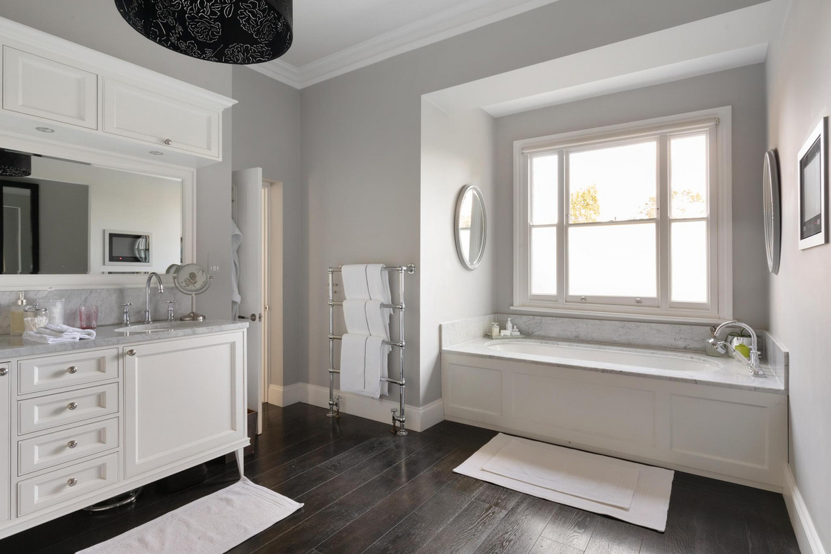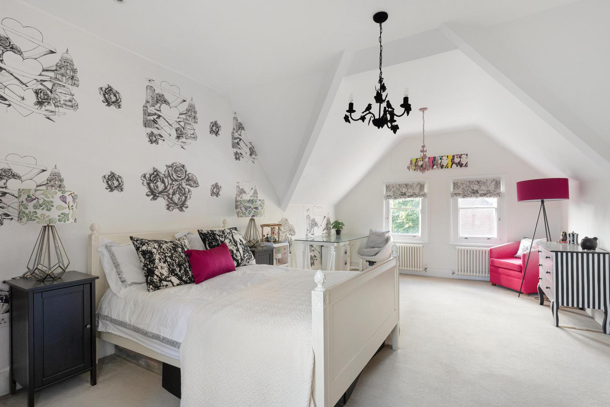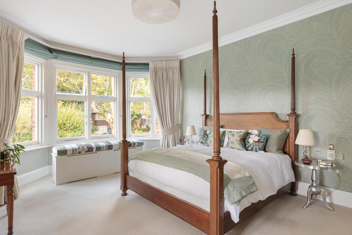 Upstairs, the first floor houses the magnificent principal bedroom, featuring a custom-designed dressing room and a luxurious en suite bathroom equipped with a steam shower. A guest suite on this floor also offers a private dressing room and a beautifully panelled en suite bathroom with an original roll-top bath. The second floor comprises three additional double bedrooms, one with its own en suite, as well as a spacious family bathroom.