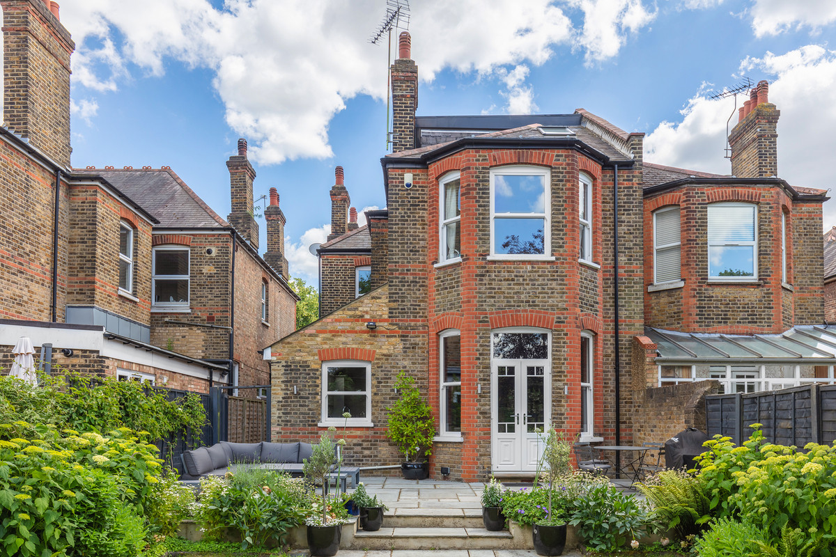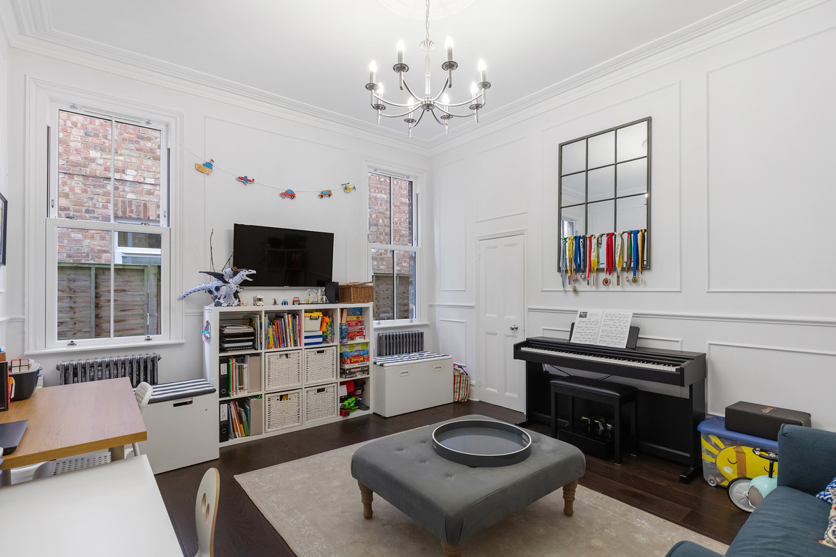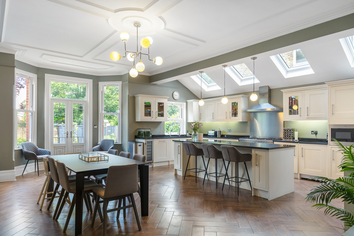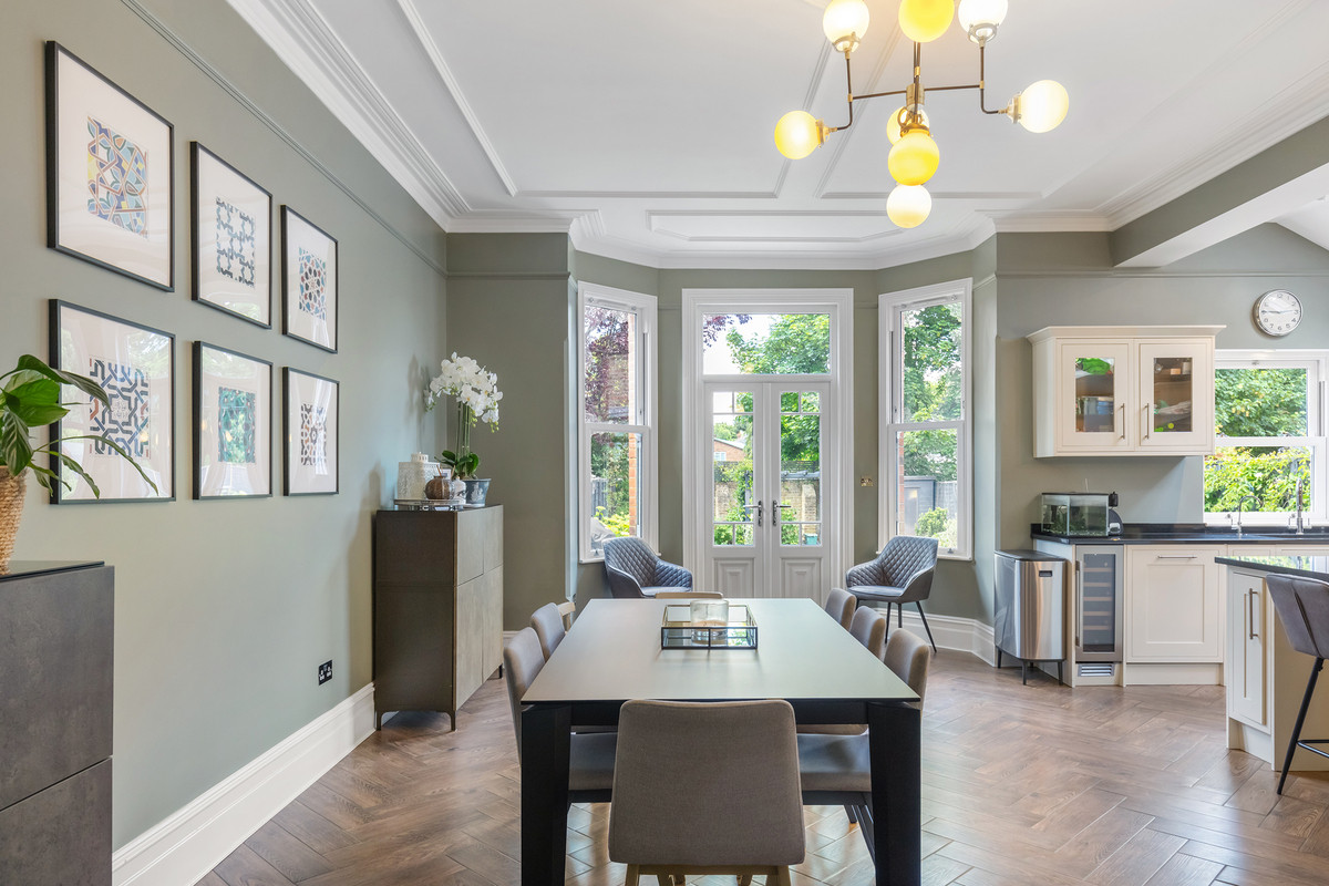 Upon entering, you are greeted by a grand entrance hall that sets the tone for the rest of the home. The ground floor boasts two beautifully appointed reception rooms, each featuring original period details such as high ceilings, ornate cornices, and feature fireplaces, evoking a sense of grandeur and historical charm. The vast kitchen and dining area is a true highlight, designed for both family living and entertaining, with state-of-the-art appliances, bespoke cabinetry, and an abundance of natural light streaming through large windows and French doors that open onto the beautifully landscaped garden. The garden is one of many highlights to this beautiful family home, spanning nearly 60ft its offers a great sense of space given you are not overlooked and offers versatility with a large paved terrace, perfect for family gatherings, or al fresco dining and then large grassed area ideal for the little ones running around.