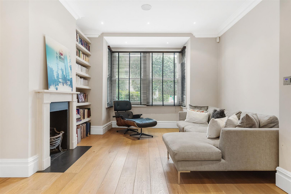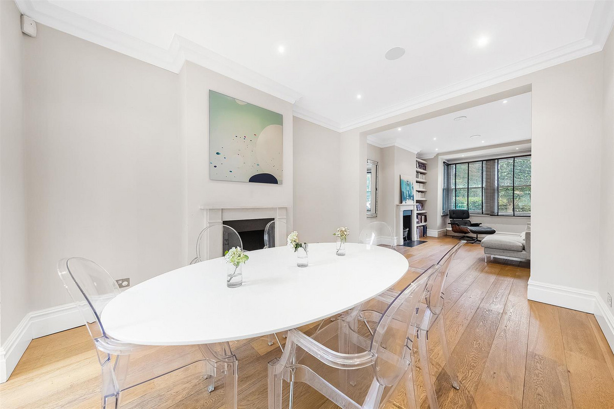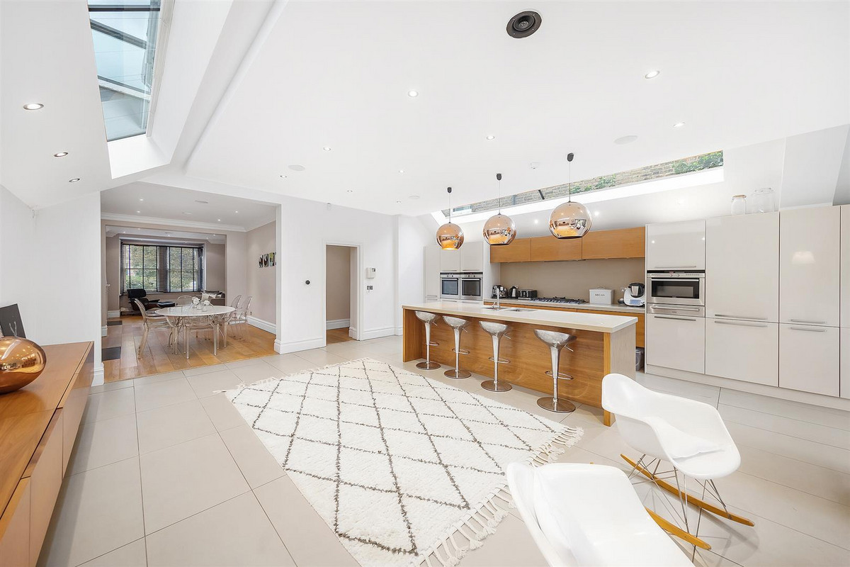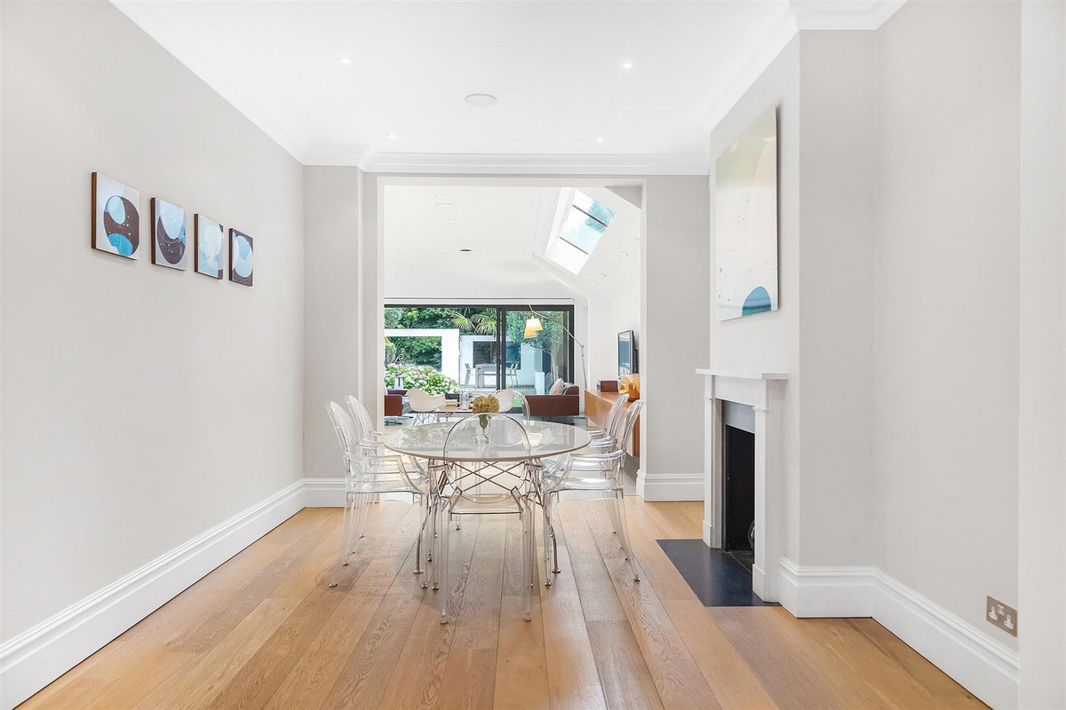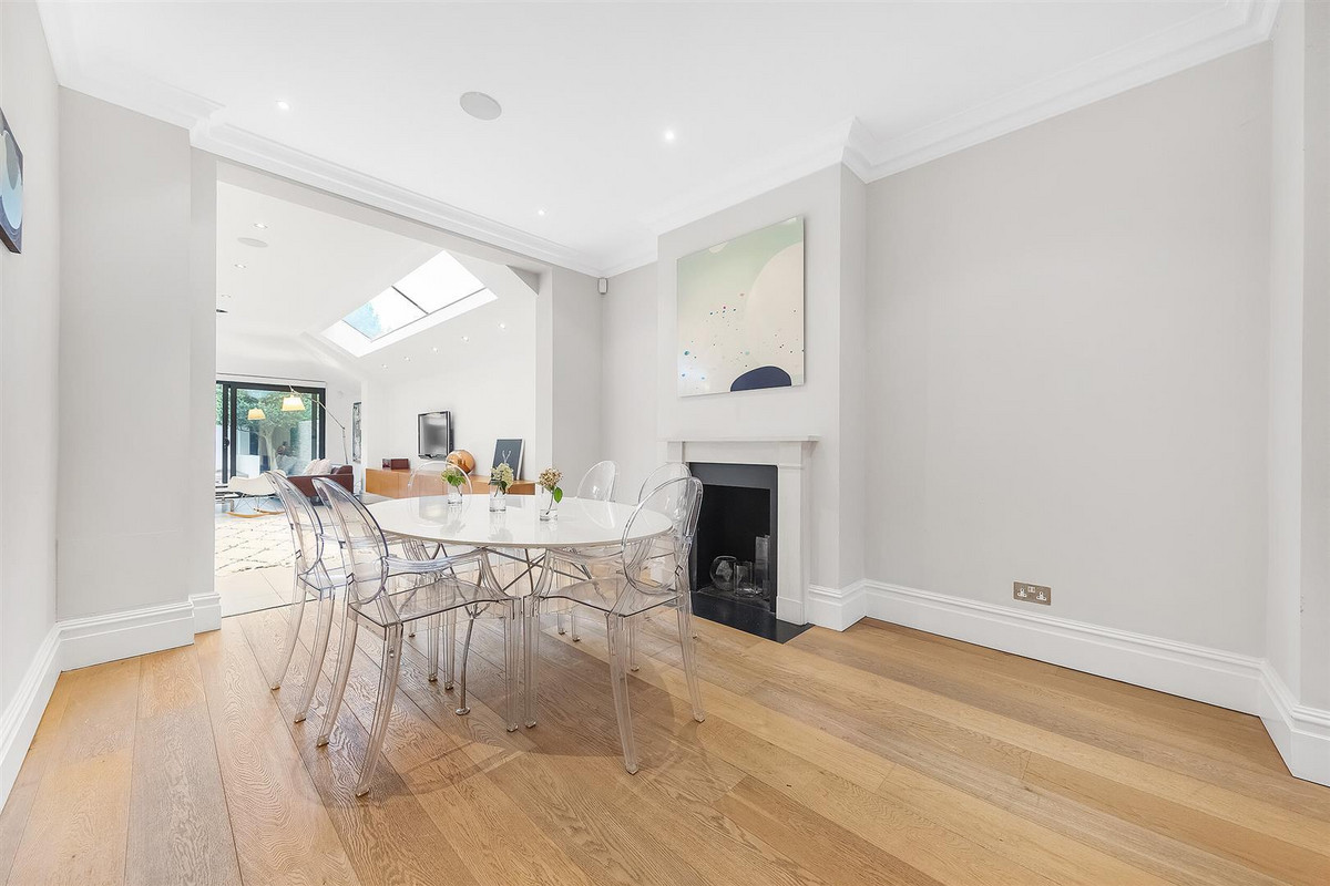 On the ground floor are three living areas, all arranged semi-open plan. The wide entrance hall leads to the living room at the front, the kitchen at the rear and also the guest cloakroom and utility room. The front living room has a grand fireplace, fitted shelves and a box bay with sash windows overlooking the front garden. The living room flows into the dining room, which has a matching fireplace, and wooden flooring unites the two spaces. The centrepiece of the house is the 27 ft kitchen, extended to both sides with dramatic skylights which bathe the space in natural light. A wealth of fitted kitchen units house integrated appliances and extensive storage, while a large island unit provides an opportunity for casual dining. There is ample room in the kitchen for secondary living and dining spaces, and sliding doors give a broad connection to the garden.||The main bedroom suite occupies the full width of the front of the house and comprises the bedroom, two dressing areas and a luxury en suite bathroom with inset bath, wall-mounted television and walk-in rainfall shower. The first floor is completed by another double bedroom, which overlooks the garden, and a separate bathroom. Three further double bedrooms, two with fitted wardrobes, and a bathroom are set on the second floor.||The property is presented in immaculate decorative condition, and features Lutron lighting controls and an integrated speaker system throughout. The ground floor and all bathrooms benefit from underfloor heating, while all bedrooms are carpeted.||The landscaped front garden is bordered by railings and an established hedge and provides space for off street parking, while a mature tree offers privacy. To the rear, a terrace by the kitchen leads to a lawn, and beyond that a cleverly designed outdoor room with decked floor, surrounded by mature trees and shrubs. The garden is not overlooked and enjoys an open westerly aspect.