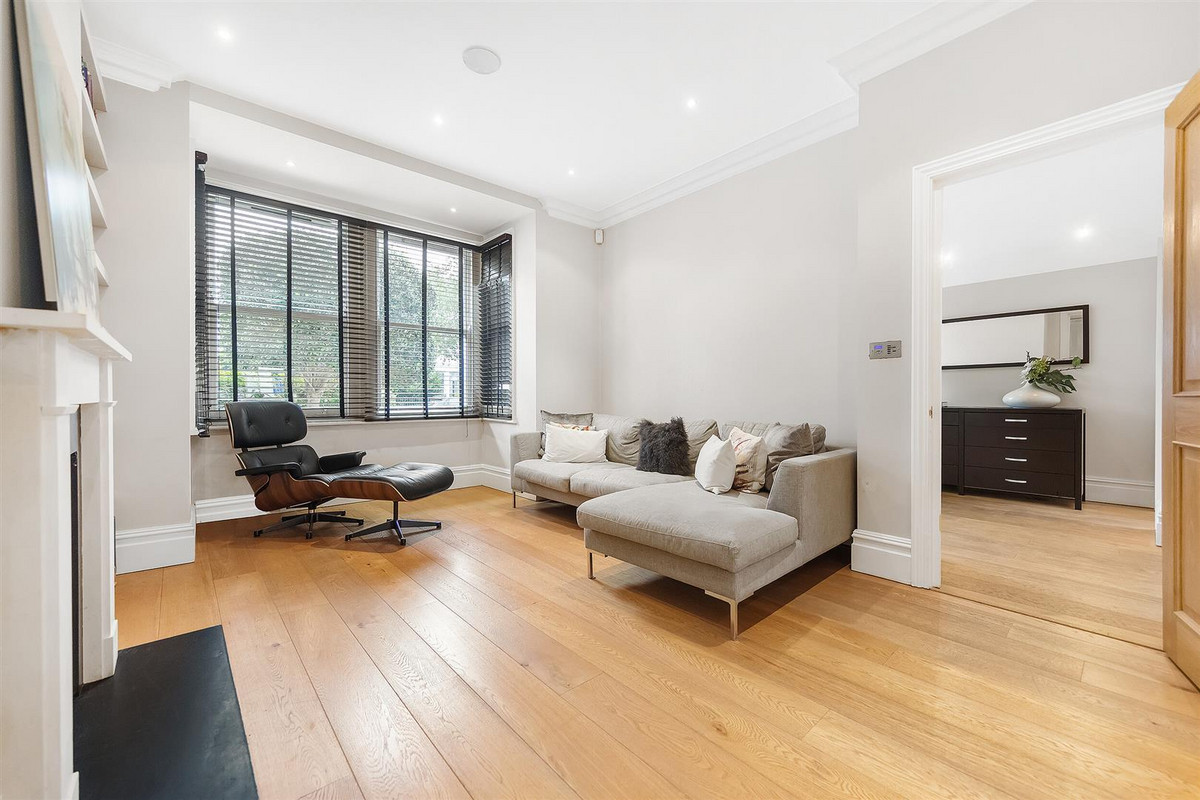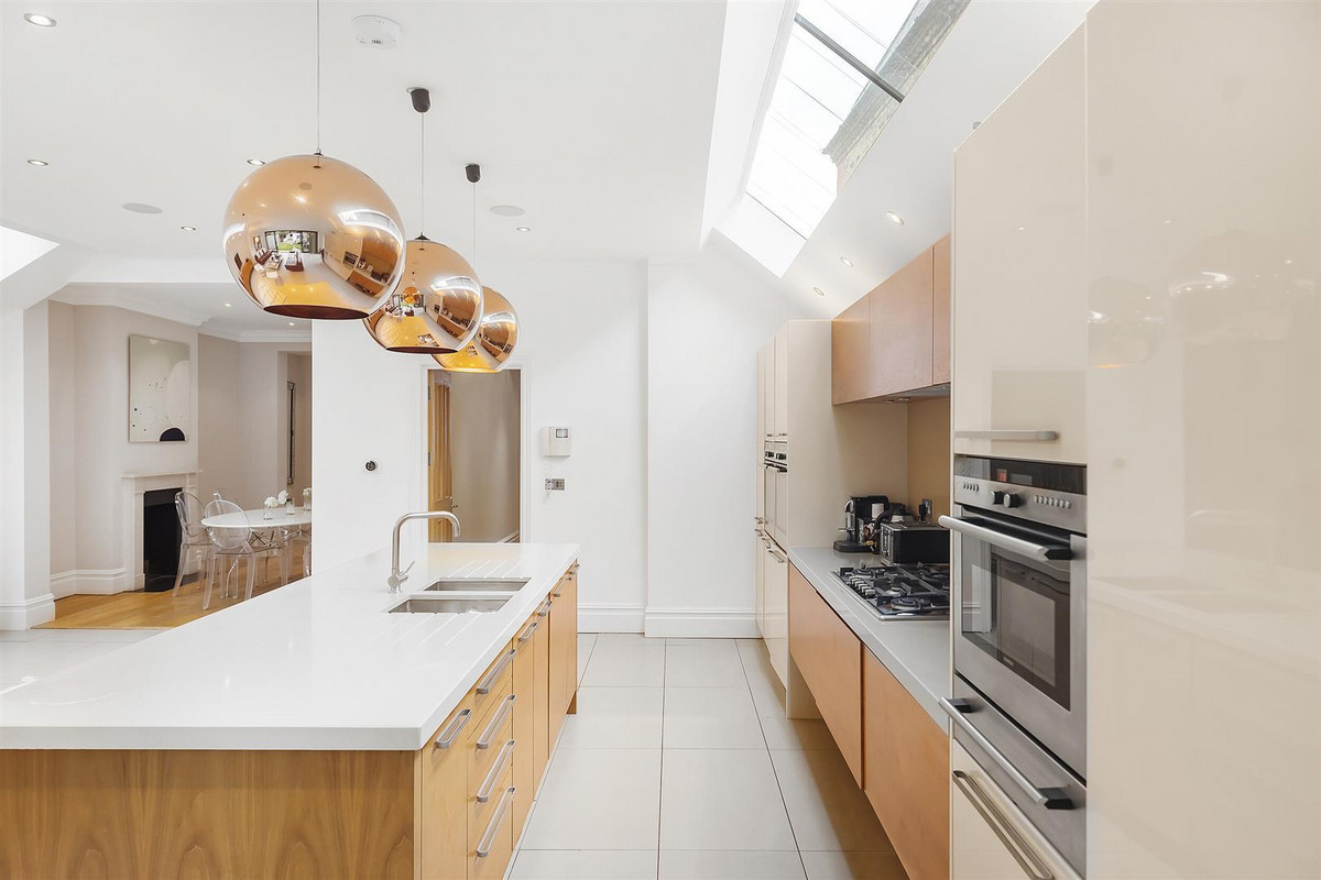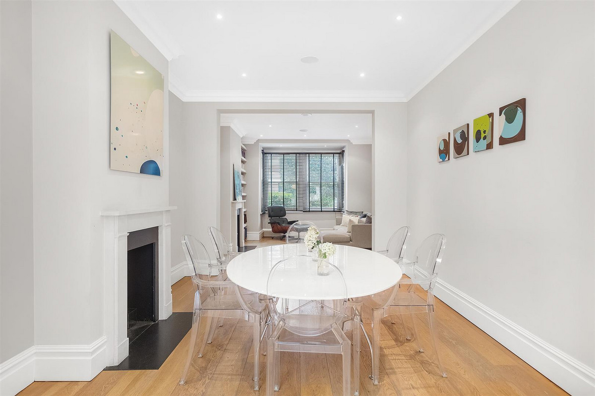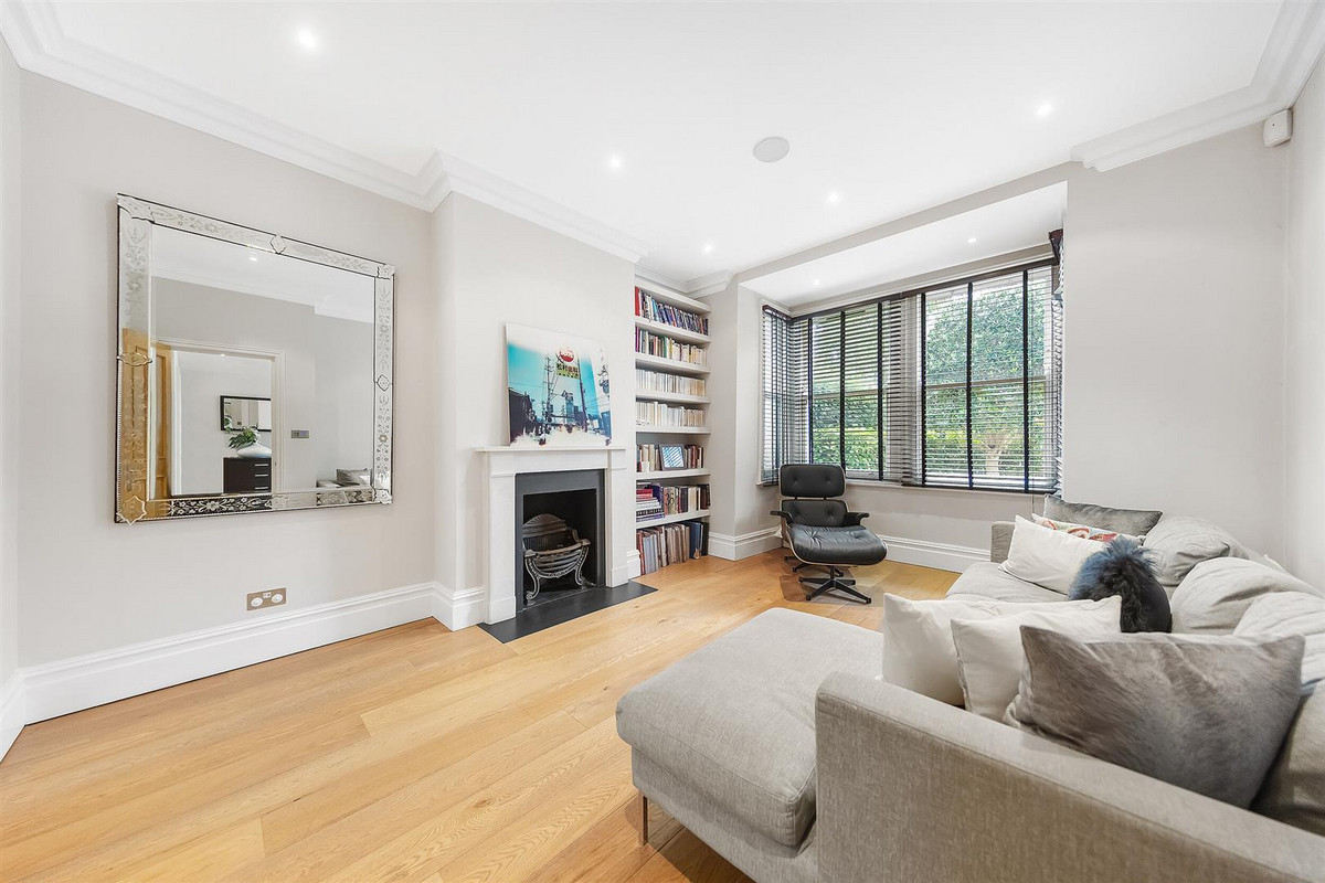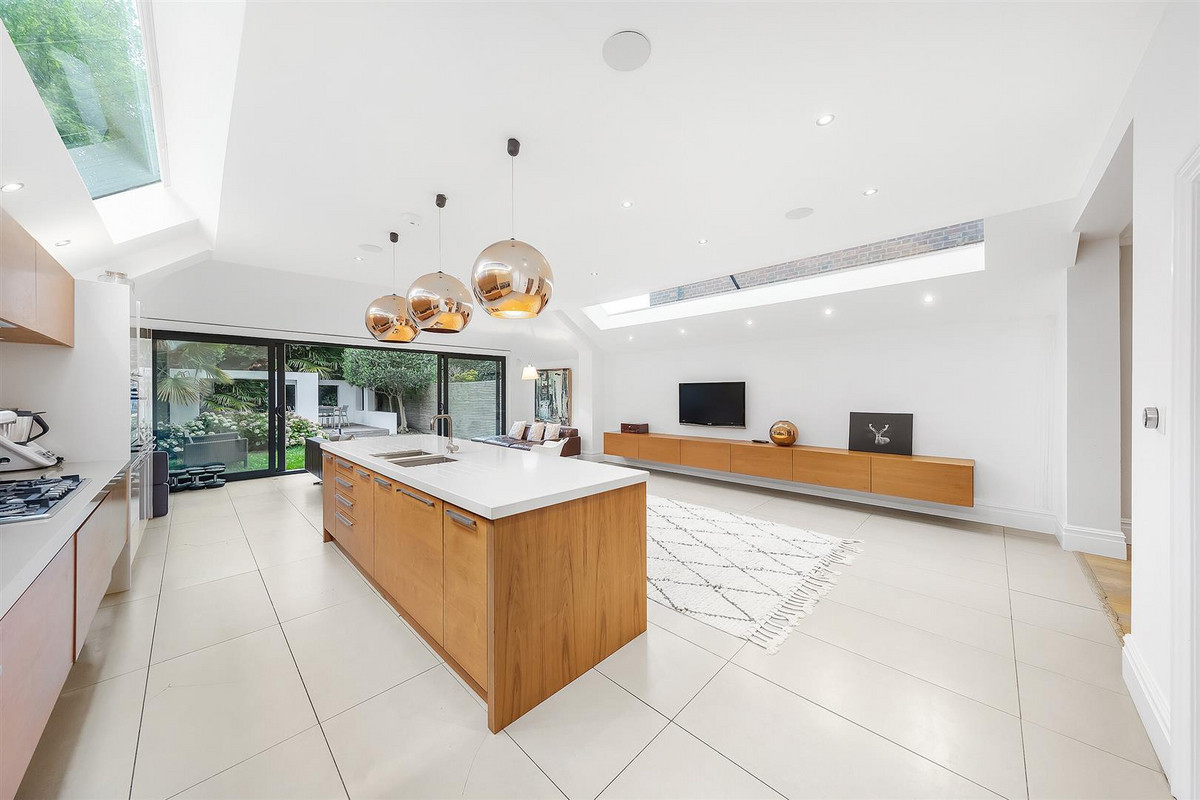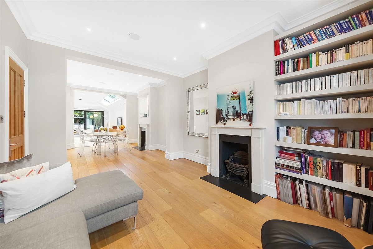 On the ground floor are three living areas, all arranged semi-open plan. The wide entrance hall leads to the living room at the front, the kitchen at the rear and also the guest cloakroom and utility room. The front living room has a grand fireplace, fitted shelves and a box bay with sash windows overlooking the front garden. The living room flows into the dining room, which has a matching fireplace, and wooden flooring unites the two spaces. The centrepiece of the house is the 27 ft kitchen, extended to both sides with dramatic skylights which bathe the space in natural light. A wealth of fitted kitchen units house integrated appliances and extensive storage, while a large island unit provides an opportunity for casual dining. There is ample room in the kitchen for secondary living and dining spaces, and sliding doors give a broad connection to the garden.||The main bedroom suite occupies the full width of the front of the house and comprises the bedroom, two dressing areas and a luxury en suite bathroom with inset bath, wall-mounted television and walk-in rainfall shower. The first floor is completed by another double bedroom, which overlooks the garden, and a separate bathroom. Three further double bedrooms, two with fitted wardrobes, and a bathroom are set on the second floor.||The property is presented in immaculate decorative condition, and features Lutron lighting controls and an integrated speaker system throughout. The ground floor and all bathrooms benefit from underfloor heating, while all bedrooms are carpeted.||The landscaped front garden is bordered by railings and an established hedge and provides space for off street parking, while a mature tree offers privacy. To the rear, a terrace by the kitchen leads to a lawn, and beyond that a cleverly designed outdoor room with decked floor, surrounded by mature trees and shrubs. The garden is not overlooked and enjoys an open westerly aspect.