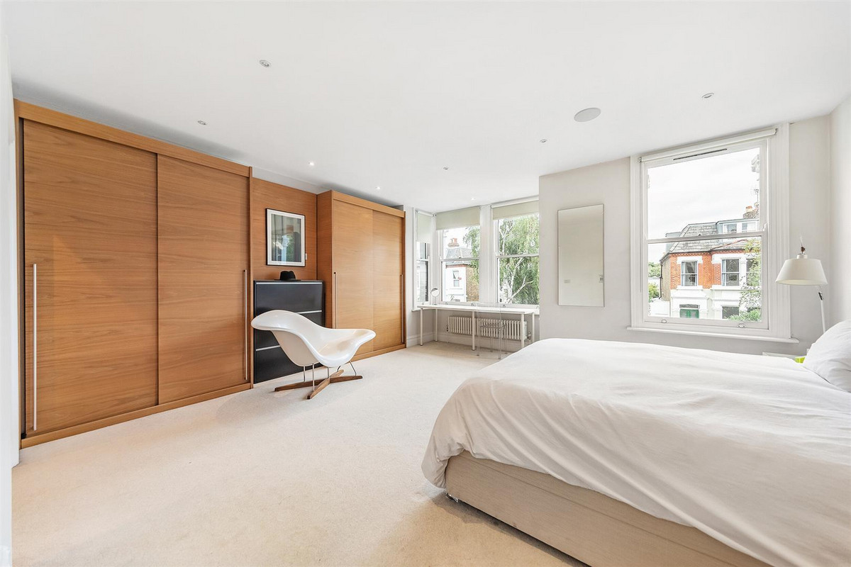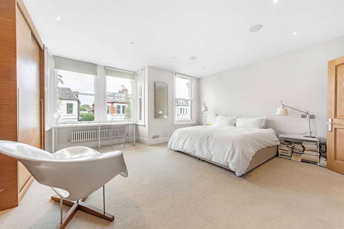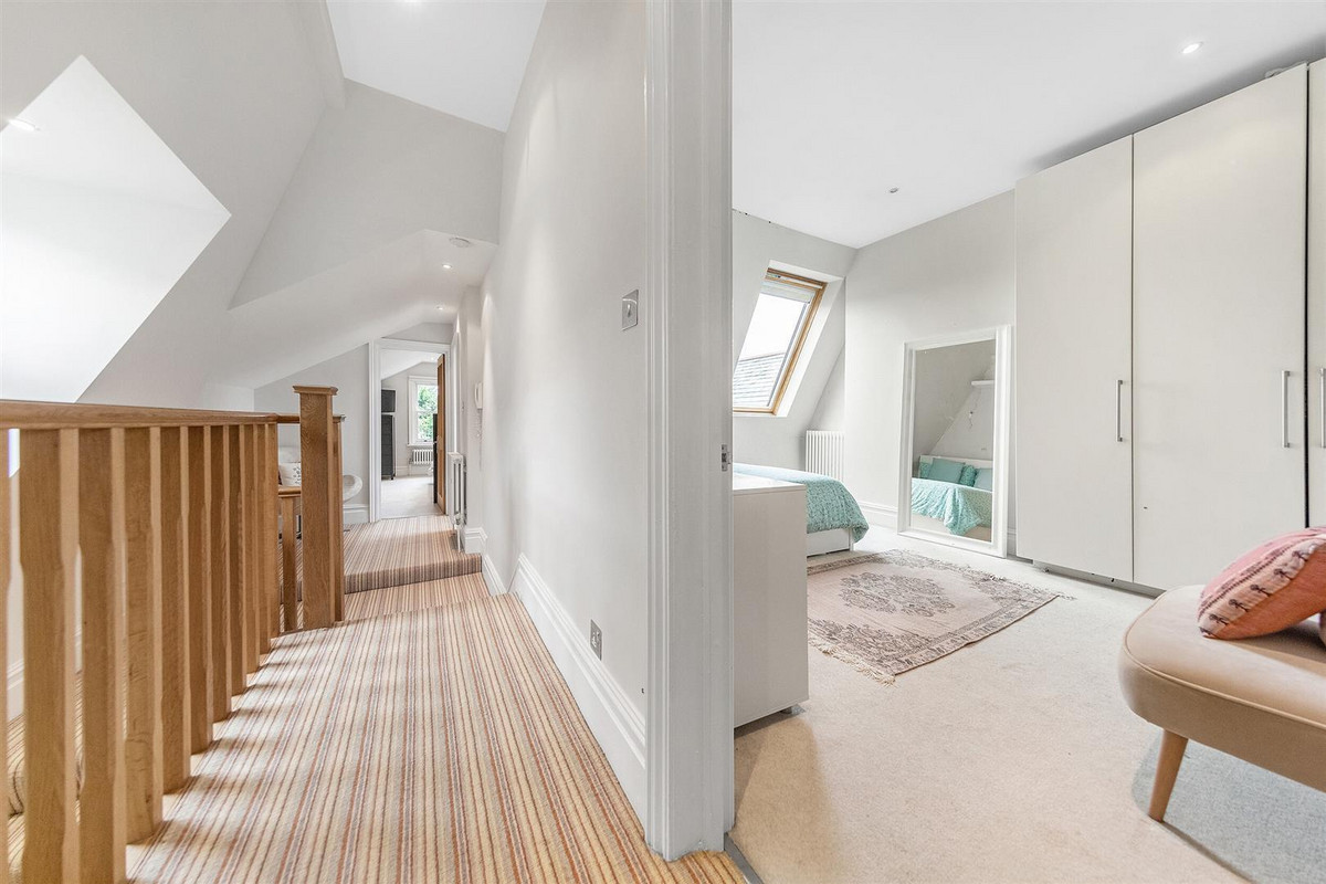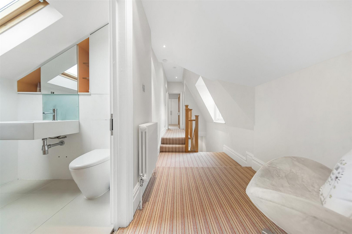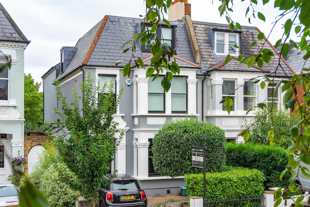 On the ground floor are three living areas, all arranged semi-open plan. The wide entrance hall leads to the living room at the front, the kitchen at the rear and also the guest cloakroom and utility room. The front living room has a grand fireplace, fitted shelves and a box bay with sash windows overlooking the front garden. The living room flows into the dining room, which has a matching fireplace, and wooden flooring unites the two spaces. The centrepiece of the house is the 27 ft kitchen, extended to both sides with dramatic skylights which bathe the space in natural light. A wealth of fitted kitchen units house integrated appliances and extensive storage, while a large island unit provides an opportunity for casual dining. There is ample room in the kitchen for secondary living and dining spaces, and sliding doors give a broad connection to the garden.||The main bedroom suite occupies the full width of the front of the house and comprises the bedroom, two dressing areas and a luxury en suite bathroom with inset bath, wall-mounted television and walk-in rainfall shower. The first floor is completed by another double bedroom, which overlooks the garden, and a separate bathroom. Three further double bedrooms, two with fitted wardrobes, and a bathroom are set on the second floor.||The property is presented in immaculate decorative condition, and features Lutron lighting controls and an integrated speaker system throughout. The ground floor and all bathrooms benefit from underfloor heating, while all bedrooms are carpeted.||The landscaped front garden is bordered by railings and an established hedge and provides space for off street parking, while a mature tree offers privacy. To the rear, a terrace by the kitchen leads to a lawn, and beyond that a cleverly designed outdoor room with decked floor, surrounded by mature trees and shrubs. The garden is not overlooked and enjoys an open westerly aspect.