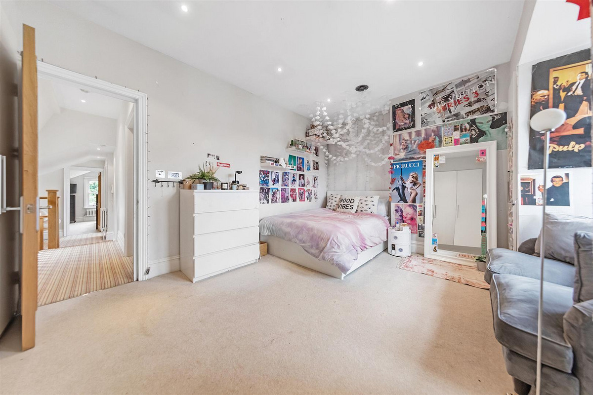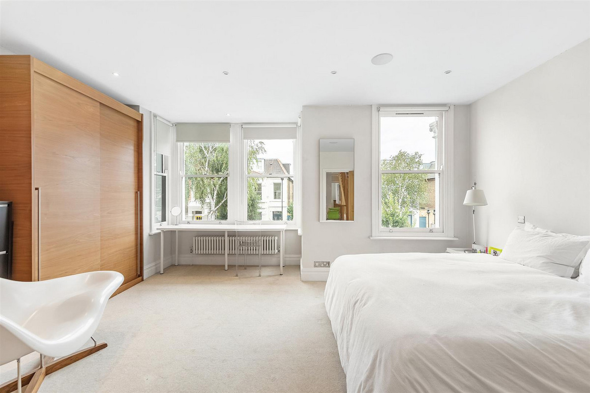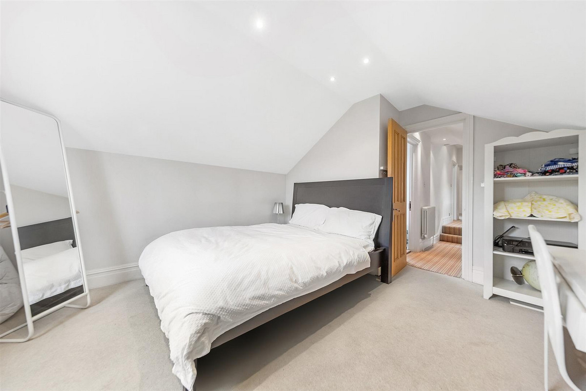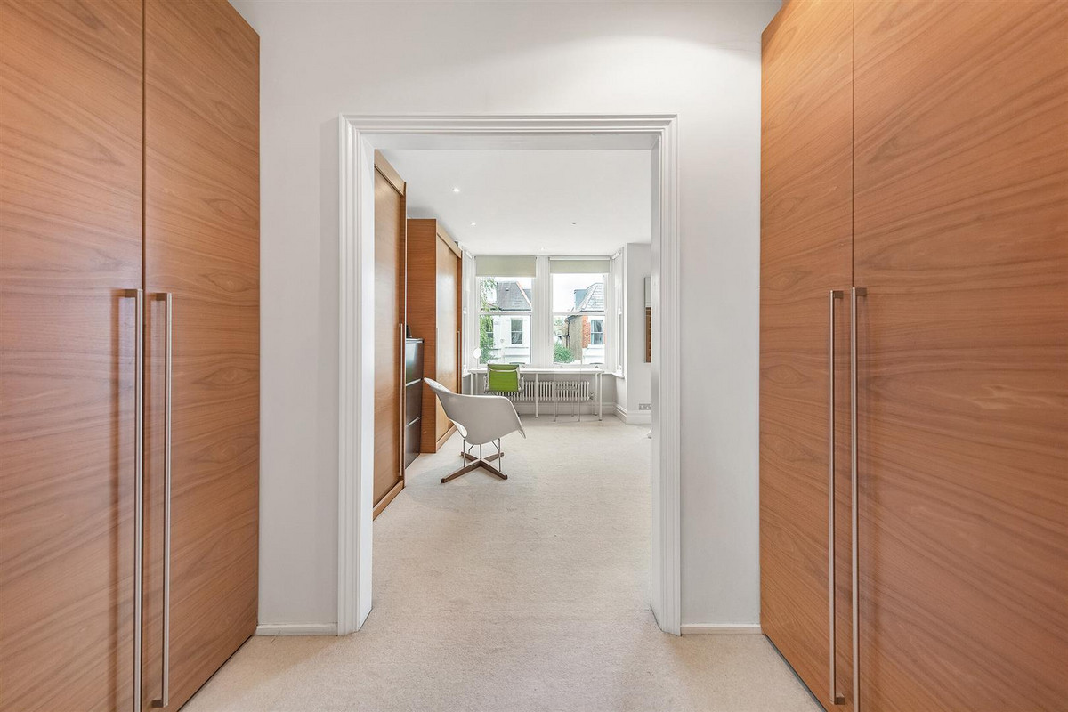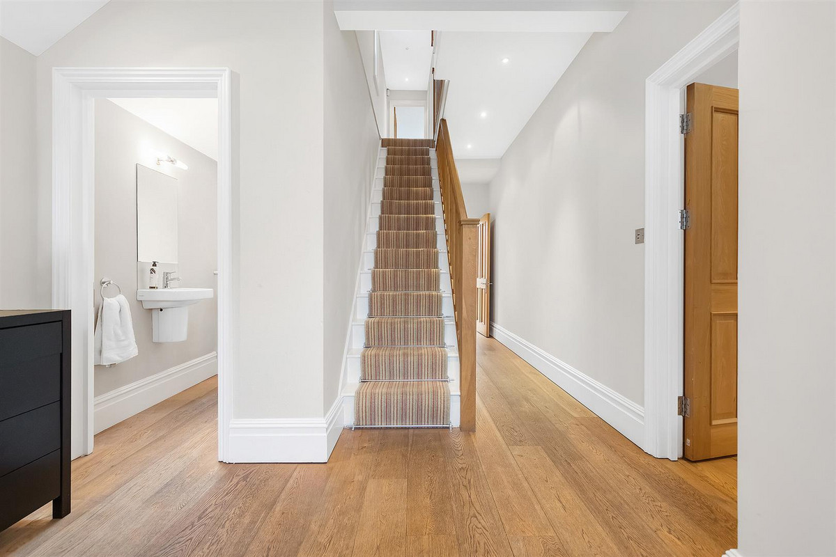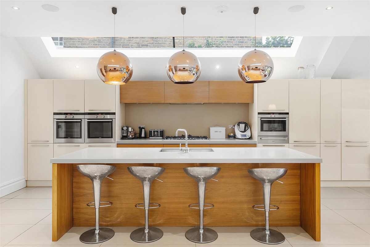 On the ground floor are three living areas, all arranged semi-open plan. The wide entrance hall leads to the living room at the front, the kitchen at the rear and also the guest cloakroom and utility room. The front living room has a grand fireplace, fitted shelves and a box bay with sash windows overlooking the front garden. The living room flows into the dining room, which has a matching fireplace, and wooden flooring unites the two spaces. The centrepiece of the house is the 27 ft kitchen, extended to both sides with dramatic skylights which bathe the space in natural light. A wealth of fitted kitchen units house integrated appliances and extensive storage, while a large island unit provides an opportunity for casual dining. There is ample room in the kitchen for secondary living and dining spaces, and sliding doors give a broad connection to the garden.||The main bedroom suite occupies the full width of the front of the house and comprises the bedroom, two dressing areas and a luxury en suite bathroom with inset bath, wall-mounted television and walk-in rainfall shower. The first floor is completed by another double bedroom, which overlooks the garden, and a separate bathroom. Three further double bedrooms, two with fitted wardrobes, and a bathroom are set on the second floor.||The property is presented in immaculate decorative condition, and features Lutron lighting controls and an integrated speaker system throughout. The ground floor and all bathrooms benefit from underfloor heating, while all bedrooms are carpeted.||The landscaped front garden is bordered by railings and an established hedge and provides space for off street parking, while a mature tree offers privacy. To the rear, a terrace by the kitchen leads to a lawn, and beyond that a cleverly designed outdoor room with decked floor, surrounded by mature trees and shrubs. The garden is not overlooked and enjoys an open westerly aspect.