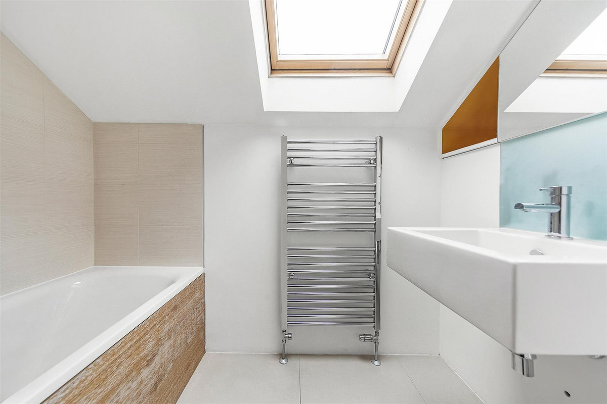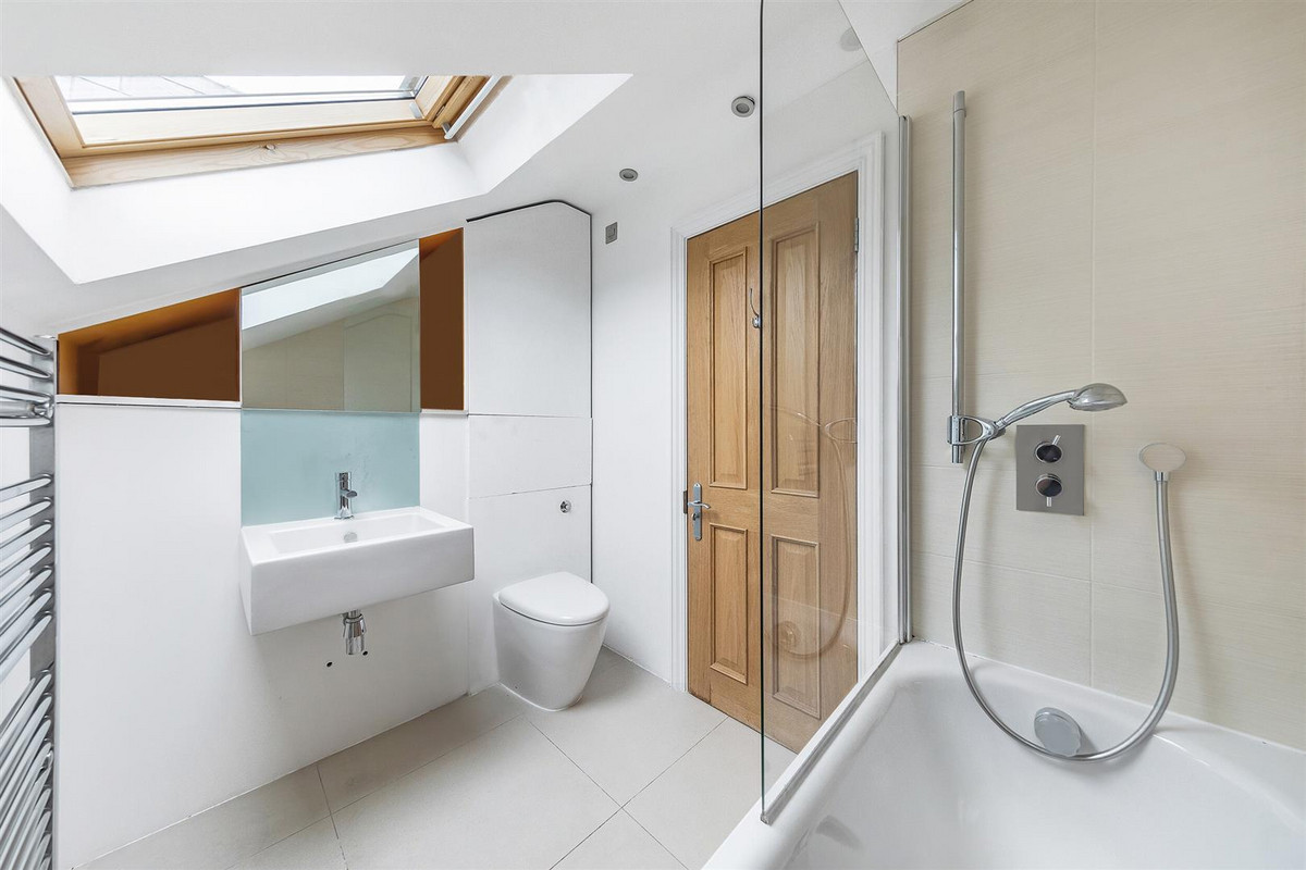 On the ground floor are three living areas, all arranged semi-open plan. The wide entrance hall leads to the living room at the front, the kitchen at the rear and also the guest cloakroom and utility room. The front living room has a grand fireplace, fitted shelves and a box bay with sash windows overlooking the front garden. The living room flows into the dining room, which has a matching fireplace, and wooden flooring unites the two spaces. The centrepiece of the house is the 27 ft kitchen, extended to both sides with dramatic skylights which bathe the space in natural light. A wealth of fitted kitchen units house integrated appliances and extensive storage, while a large island unit provides an opportunity for casual dining. There is ample room in the kitchen for secondary living and dining spaces, and sliding doors give a broad connection to the garden.