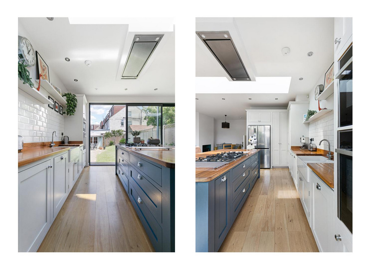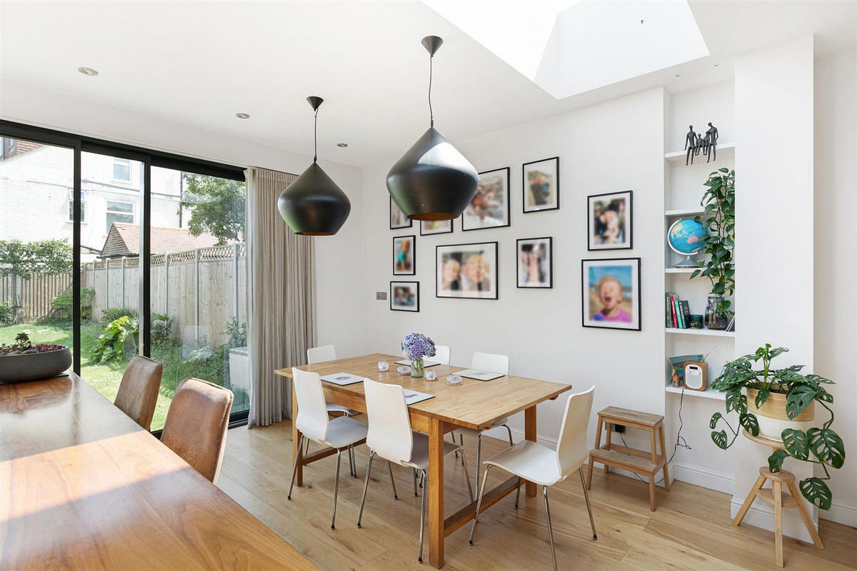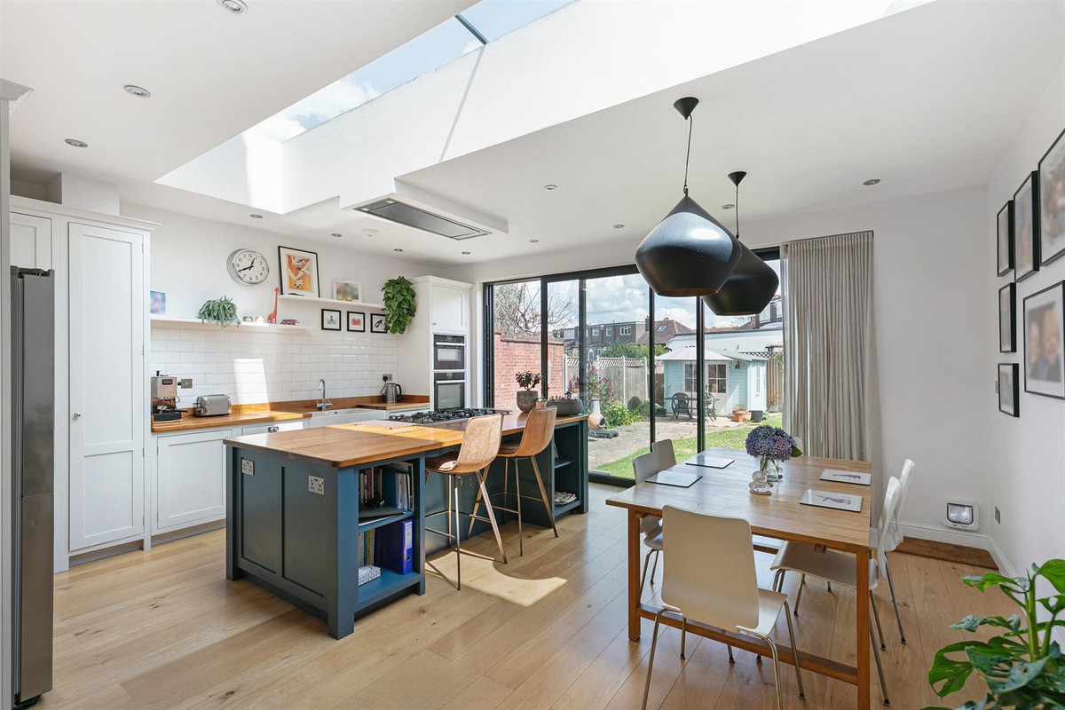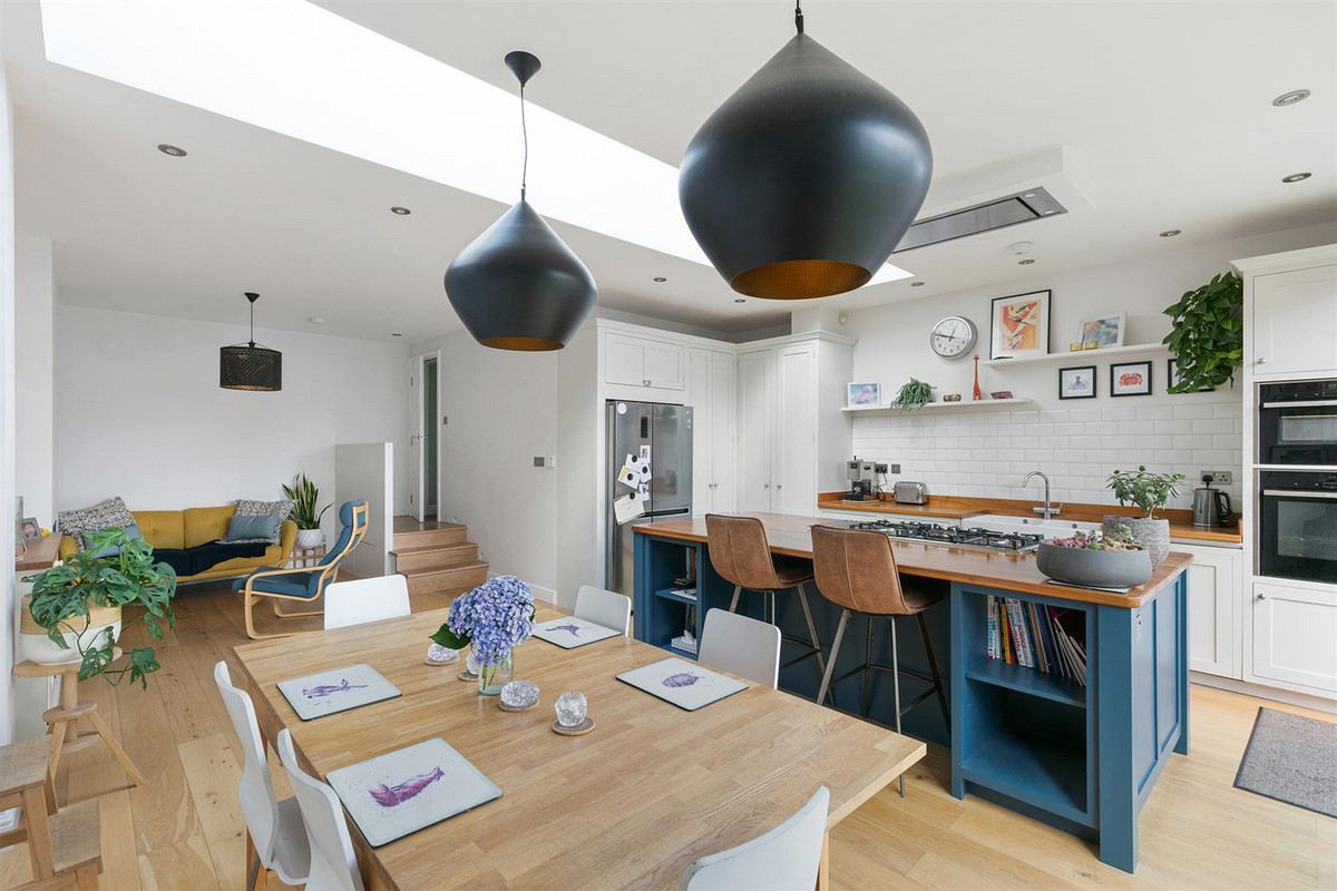 At the core of this home lies a captivating kitchen, with a central kitchen island as its centrepiece. Flanked by a bespoke fitted kitchen on one side and dining area on the other with a cozy seating area at the rear, this space is bathed in natural light from skylights and floor-to-ceiling sliding doors, providing seamless access to the 50ft garden.