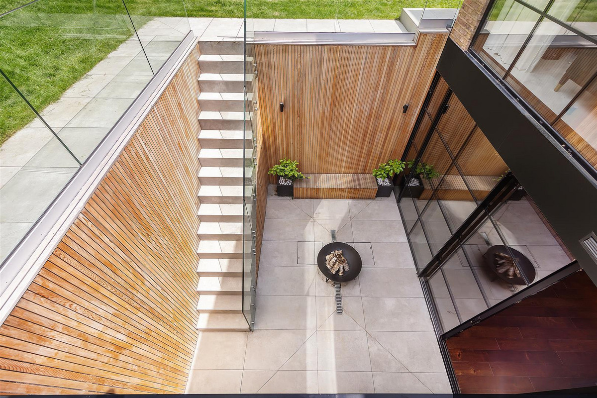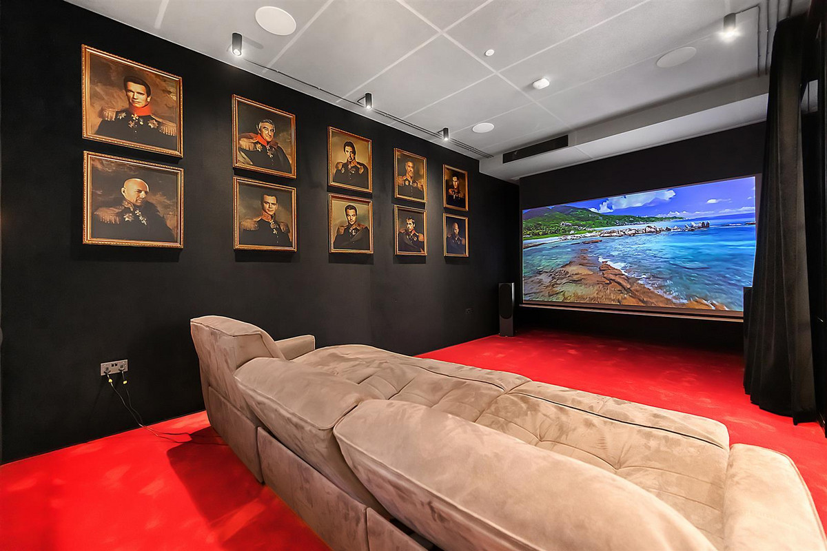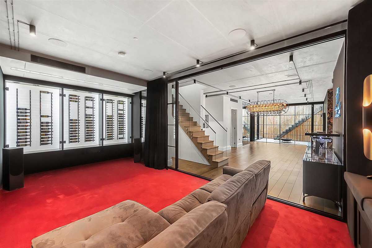 The living space continues on the lower ground floor, home to a magnificent 31 ft living room with a network of feature lights and integrated speakers. A butler's kitchen, fitted with appliances by Smeg, makes this room perfect for entertaining and relaxing, and its size lends itself to multiple purposes. Sliding internal doors reveal the sumptuous cinema room, flanked on one side by a climate-controlled wine cellar with space for over 200 bottles. Screened by an eye-catching terrarium and a sliding glass door, a further room provides space for an additional bedroom, games room or study, with a bathroom adjacent. Both this room and the main entertaining room have sliding Crittal doors opening on to a sunken, cedar-clad courtyard.