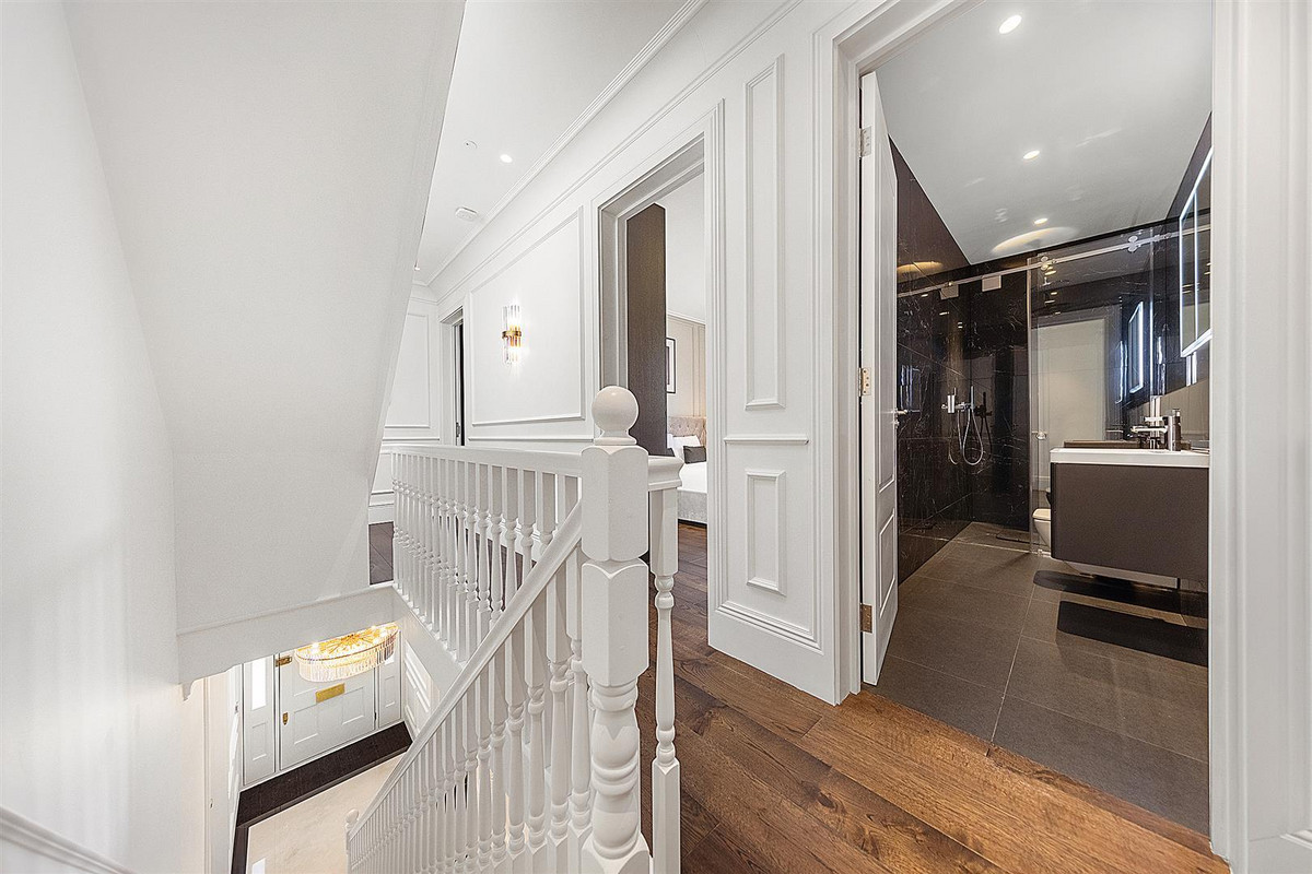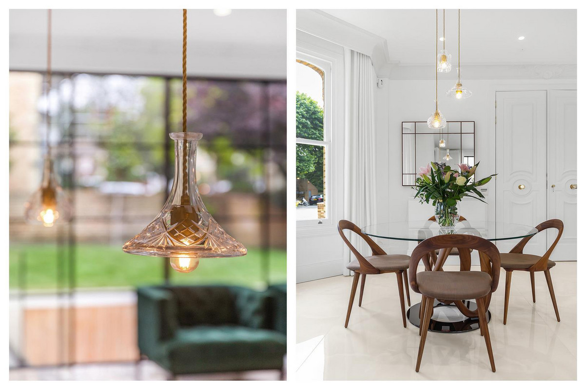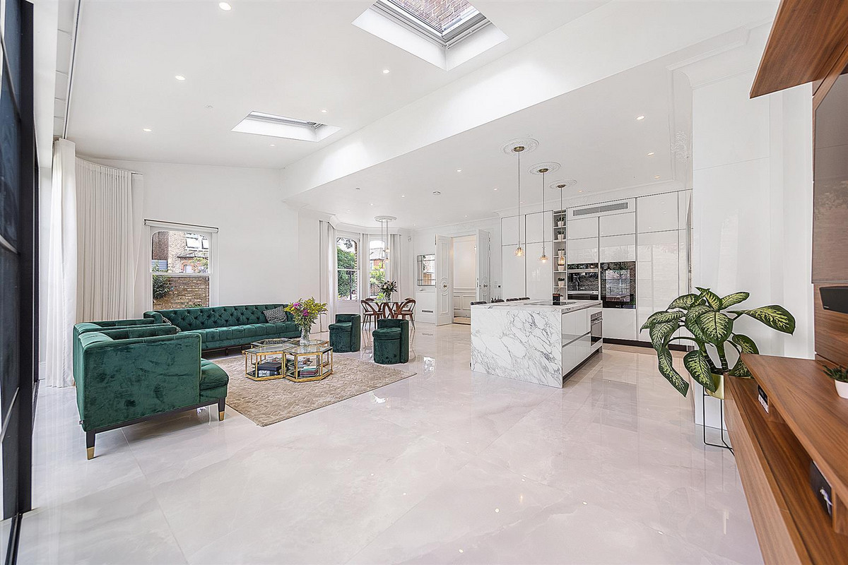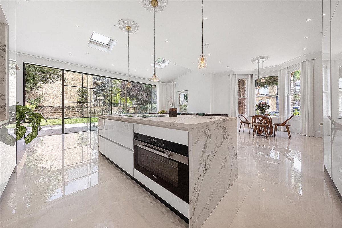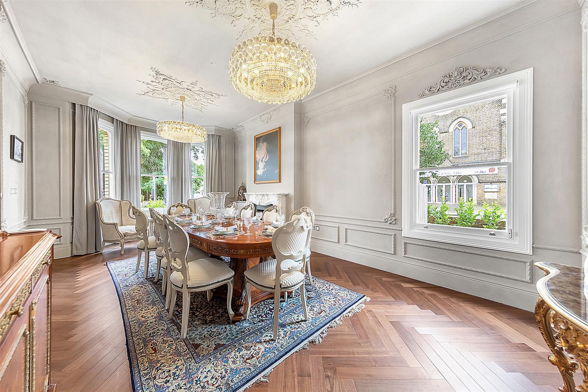 Entered through a grand door on the double-fronted elevation of the house, the 20 ft panelled entrance hall leads to both the formal dining room and the open plan family kitchen. The dining room, with a bay window with sash frames to the front and a further sash window to the side, also features a grand fireplace, elaborate plasterwork and a walnut parquet floor. The kitchen is a sight to behold, at 24 ft by 25 ft, with a bay of sash windows to one side, skylights in the ceiling and a full height, full width set of sliding Crittal doors giving a cinema-style view of the garden. The kitchen, with an impressive island unit, is fully fitted with premium integrated appliances by Miele, a large induction hob, food waste system and a Quooker instant boiling water tap. Completing the ground floor is a guest cloakroom with adjacent fitted storage cupboards.||The living space continues on the lower ground floor, home to a magnificent 31 ft living room with a network of feature lights and integrated speakers. A butler's kitchen, fitted with appliances by Smeg, makes this room perfect for entertaining and relaxing, and its size lends itself to multiple purposes. Sliding internal doors reveal the sumptuous cinema room, flanked on one side by a climate-controlled wine cellar with space for over 200 bottles. Screened by an eye-catching terrarium and a sliding glass door, a further room provides space for an additional bedroom, games room or study, with a bathroom adjacent. Both this room and the main entertaining room have sliding Crittal doors opening on to a sunken, cedar-clad courtyard.||The main bedroom suite is on the first floor, with two dressing areas and a luxurious en suite bathroom, featuring a freestanding bath and walk-in shower. Two further equally-proportioned bedrooms on this floor have fitted wardrobes and share a shower room.||On the second floor is a pair of double bedrooms, each with an en suite bathroom and both with fitted storage in the eaves. As in the oth