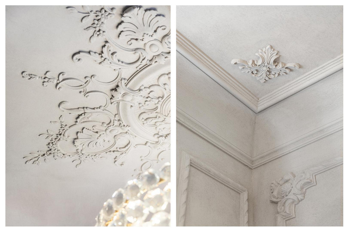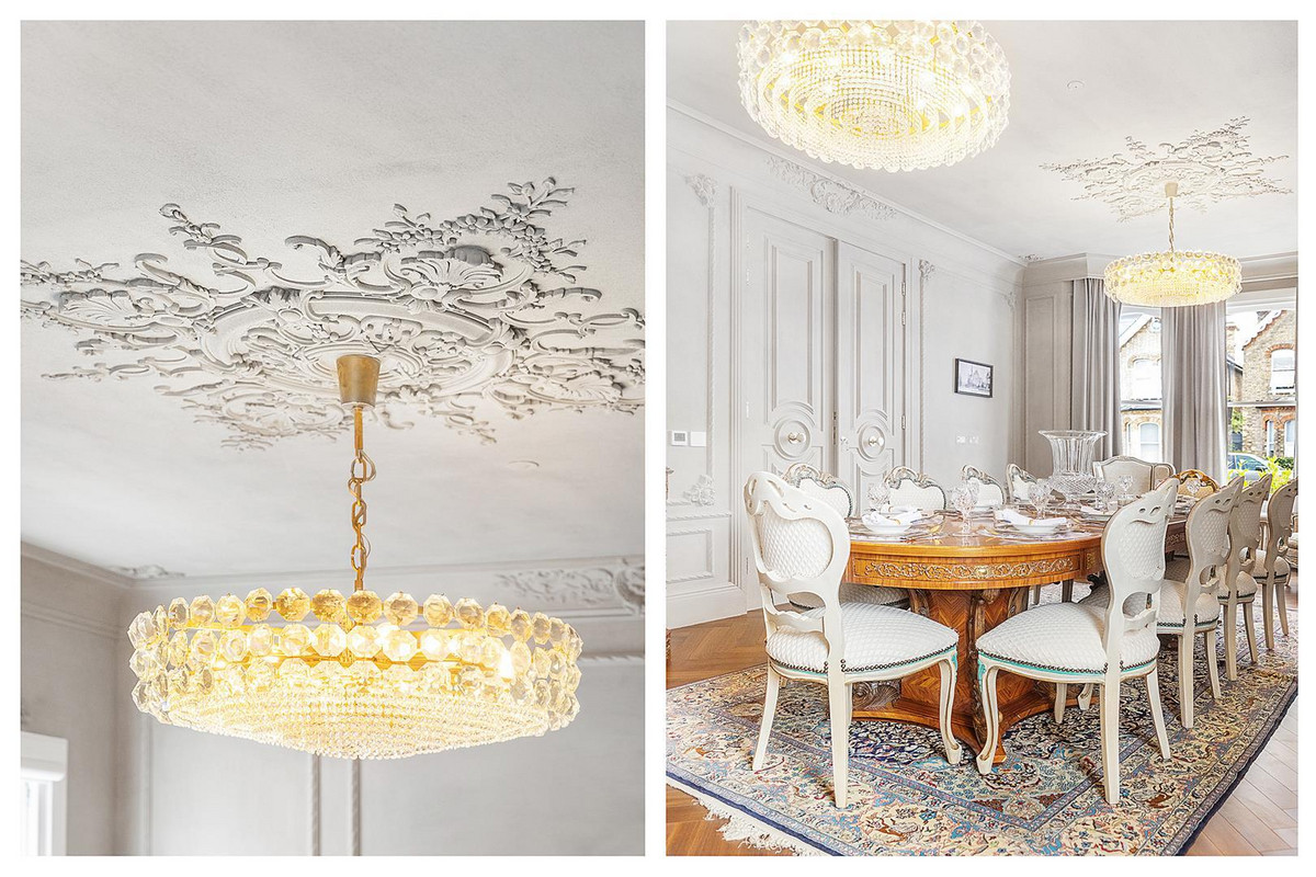 Entered through a grand door on the double-fronted elevation of the house, the 20 ft panelled entrance hall leads to both the formal dining room and the open plan family kitchen. The dining room, with a bay window with sash frames to the front and a further sash window to the side, also features a grand fireplace, elaborate plasterwork and a walnut parquet floor. The kitchen is a sight to behold, at 24 ft by 25 ft, with a bay of sash windows to one side, skylights in the ceiling and a full height, full width set of sliding Crittal doors giving a cinema-style view of the garden. The kitchen, with an impressive island unit, is fully fitted with premium integrated appliances by Miele, a large induction hob, food waste system and a Quooker instant boiling water tap. Completing the ground floor is a guest cloakroom with adjacent fitted storage cupboards.