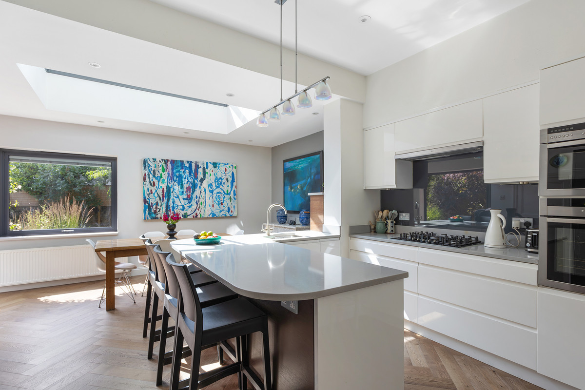 At the heart of the home is a beautifully designed dual-aspect kitchen and dining room, featuring an extensive array of high-quality fitted units and integrated appliances. Expansive glass doors open onto a paved terrace, creating a seamless transition to the breathtaking south-facing garden, professionally landscaped by a renowned garden designer— a true horticultural gem reminiscent of a Chelsea Flower Show exhibit. Mature planting, lawned areas, and vibrant borders create a tranquil outdoor sanctuary perfect for al fresco dining and play.
