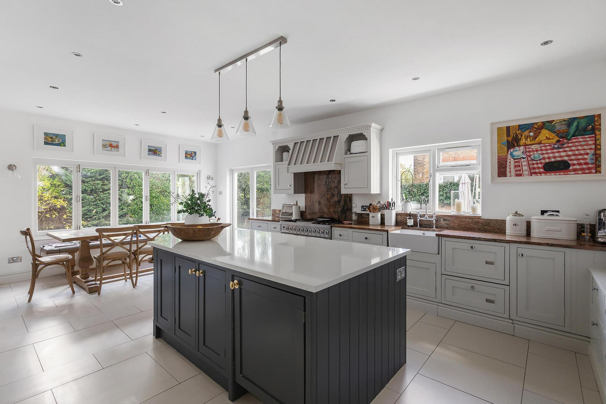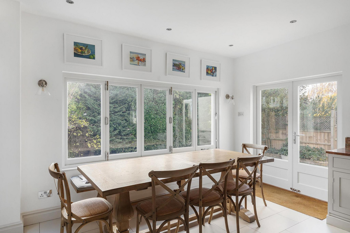A welcoming entrance hall forms the focal point of the ground floor, and leads into reception rooms on both sides, including a large dining room, cosy front study room and a rear living room with French windows leading to the garden. A fourth living room to the rear of the ground floor leads into a modern fitted kitchen with an attached utility room. The kitchen features a stylish kitchen island, large dining area and bi-folding doors leading to the garden.