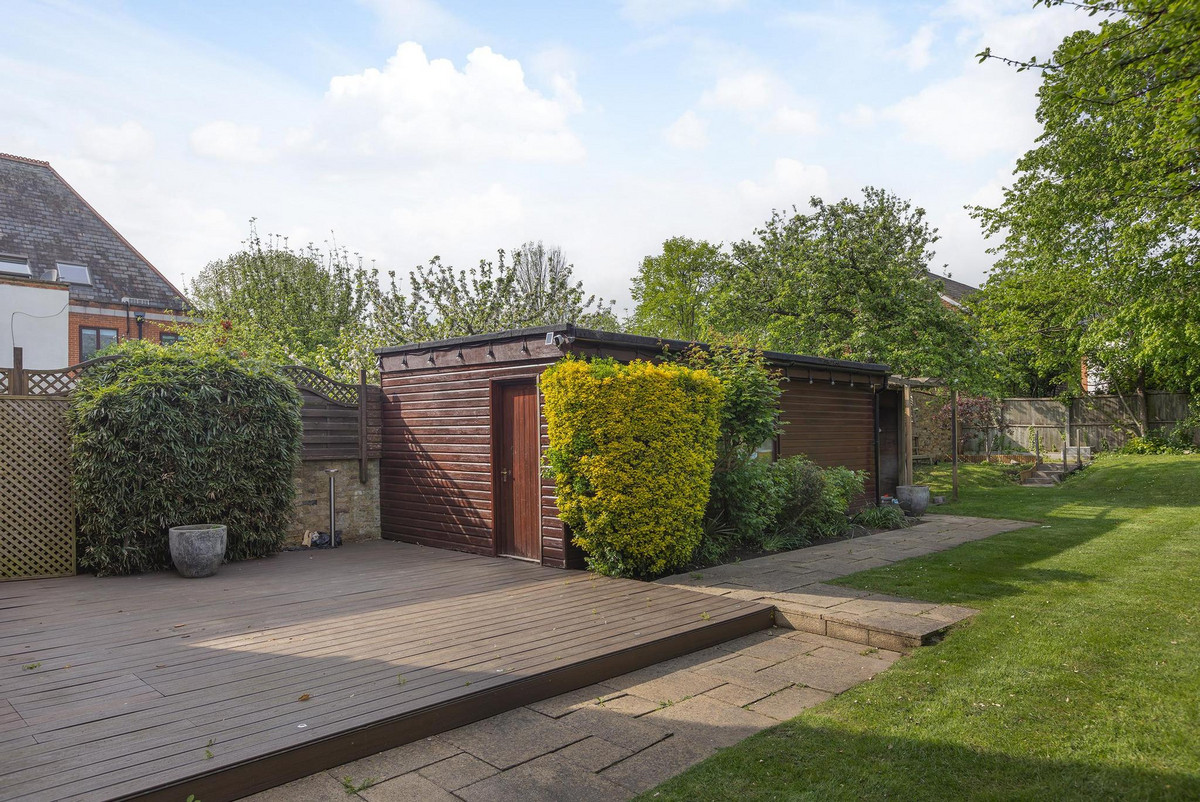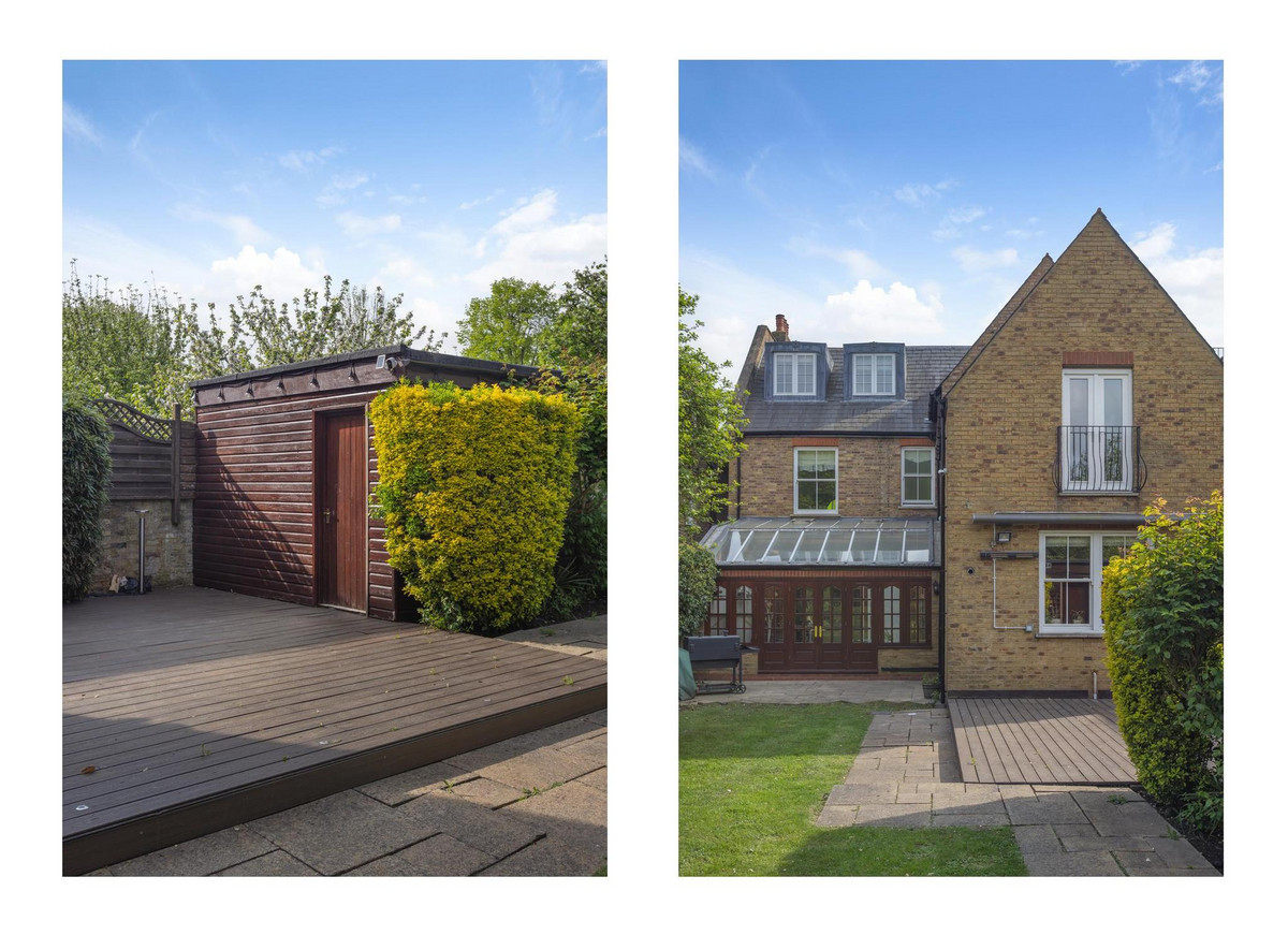 On the first floor, there are four beautifully proportioned double bedrooms. At the front of the property is the gorgeous principal bedroom, with wooden flooring leading into a stylish en suite shower room. The second bedroom is thoughtfully designed with its own en suite, a balcony overlooking the garden, and plenty of fitted wardrobes. Two additional double bedrooms offer generous space — one with garden views and the other with built-in storage. This floor is completed by a large family bathroom, an additional shower room, and extensive storage.