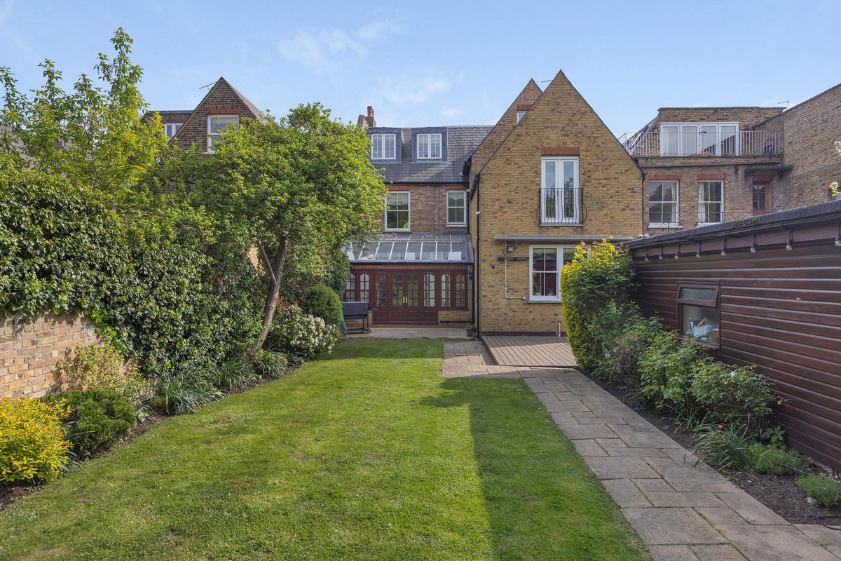 To the rear of the property is a generously sized kitchen, well-equipped with two full-size ovens, ample storage, and a large dining area that flows seamlessly into a stylish rear reception room. This leads into an elegant conservatory, complete with an impressive skylight roof and large wooden doors that bathe the space in natural light. The large garden, surrounded by mature trees, creates a peaceful at-home oasis — perfect for relaxing or entertaining.