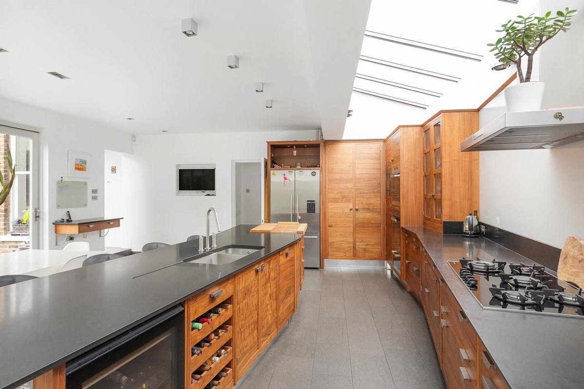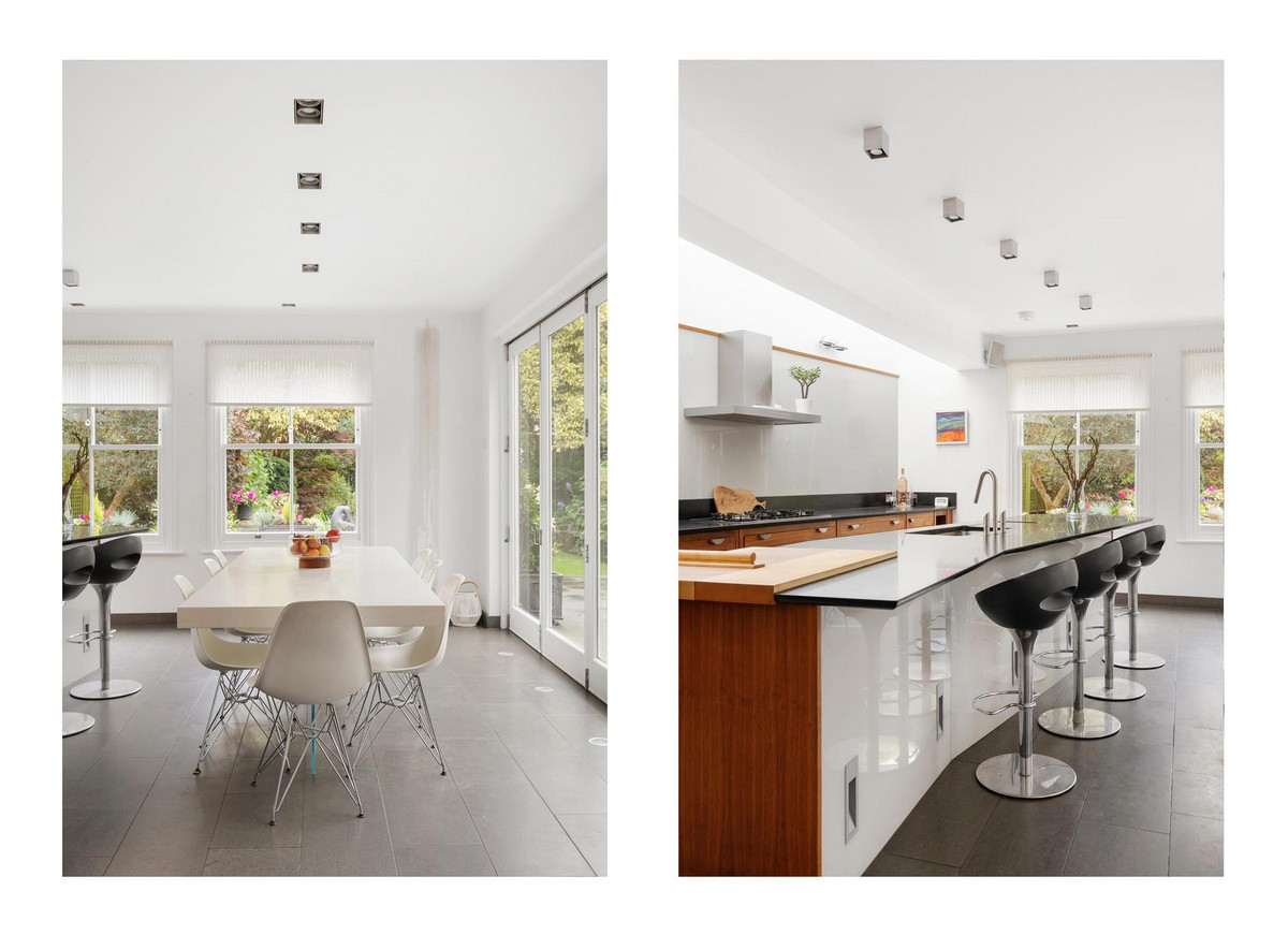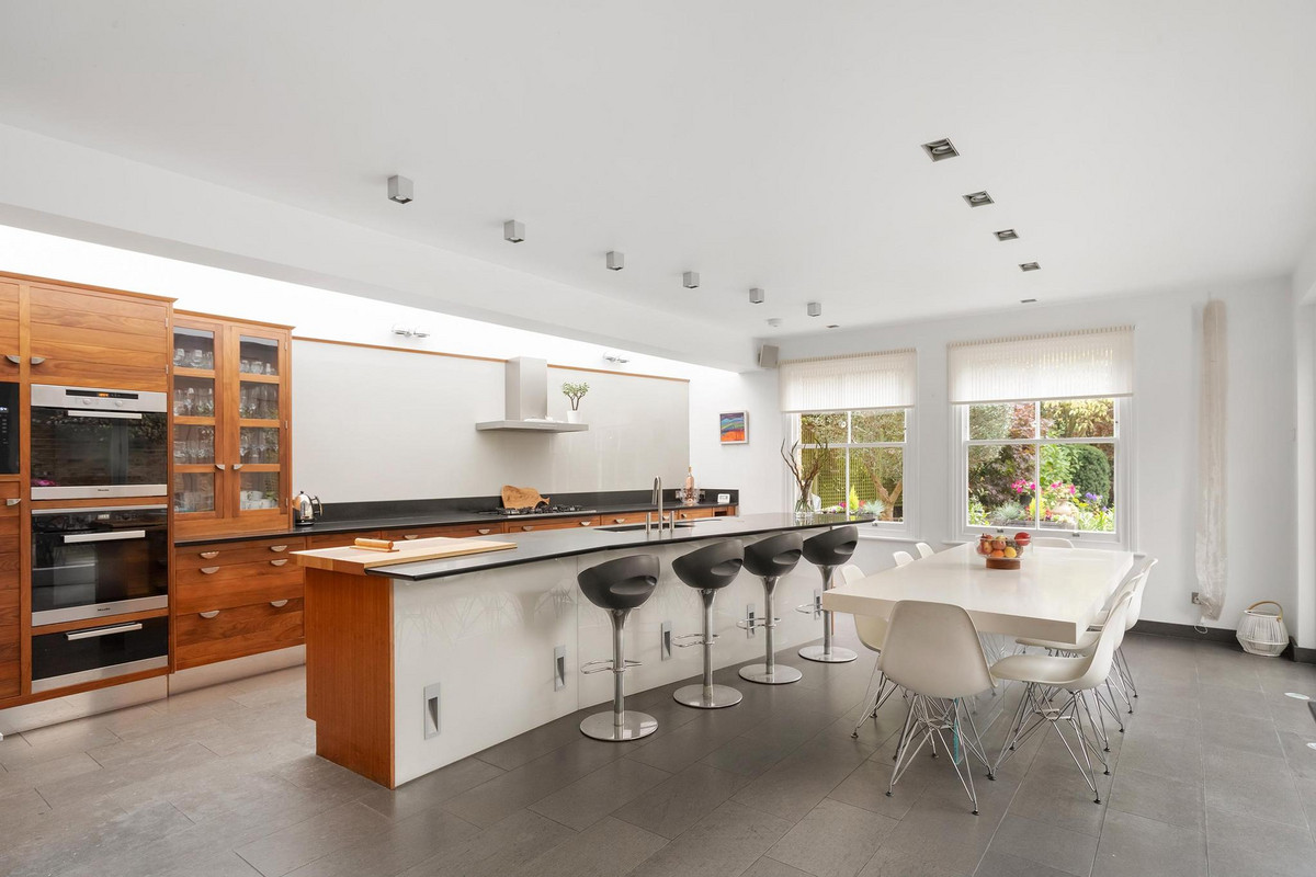 At the heart of the home is a beautifully designed Smallbone kitchen, complete with a spacious island, dining area, and bi-fold doors opening onto the garden, blending indoor and outdoor living effortlessly. Additional ground-floor highlights include a study, basement utility room, and direct access to the garage.