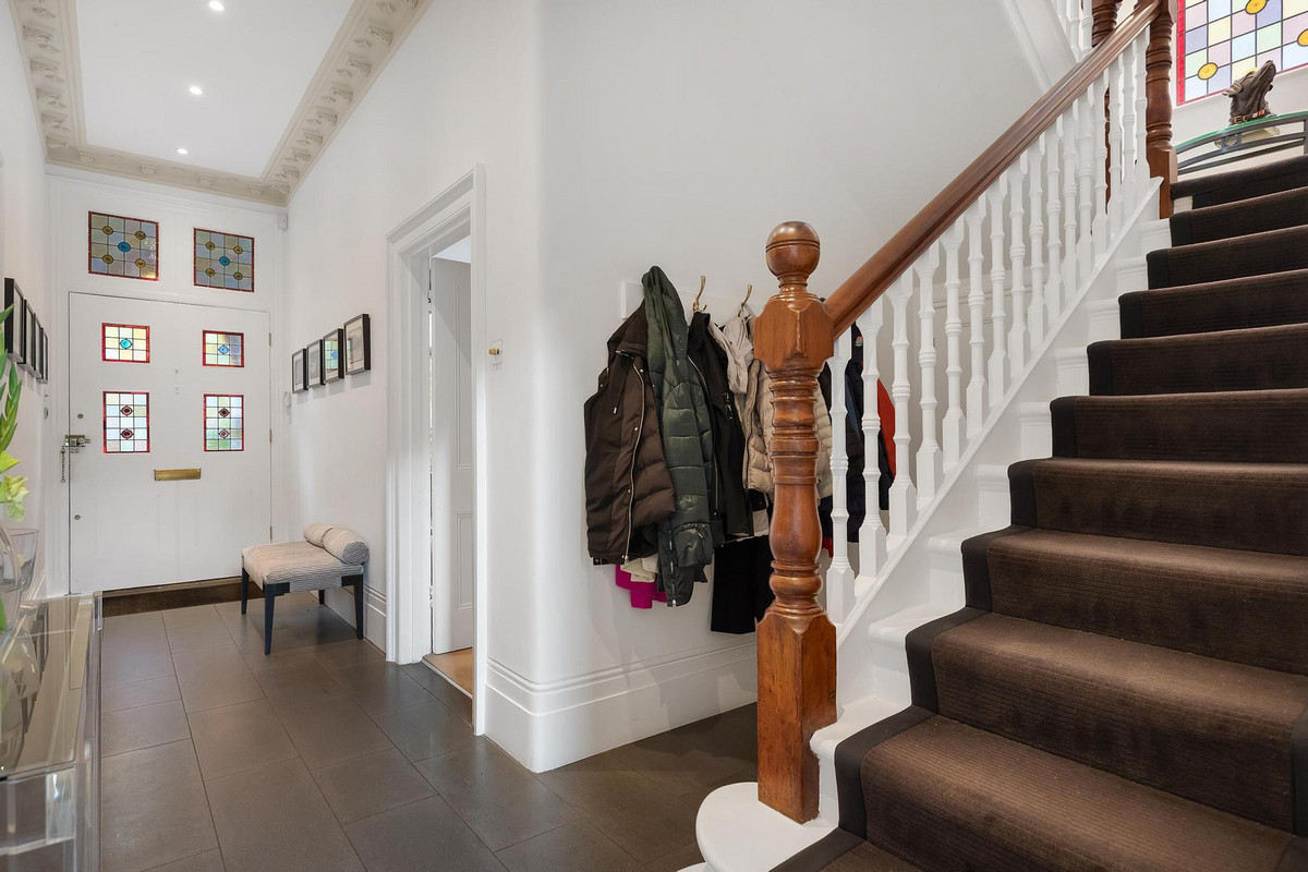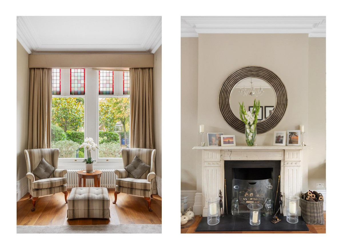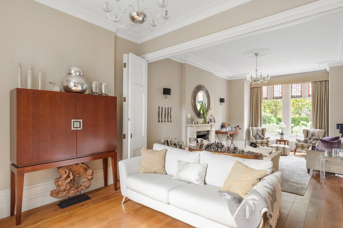 Inside, grand proportions and lovingly preserved original features are immediately apparent. The spacious, double-aspect reception rooms feature high ceilings, bay windows, original fireplaces, and cornicing, creating elegant spaces for both family living and entertaining, with French doors leading directly to the garden.