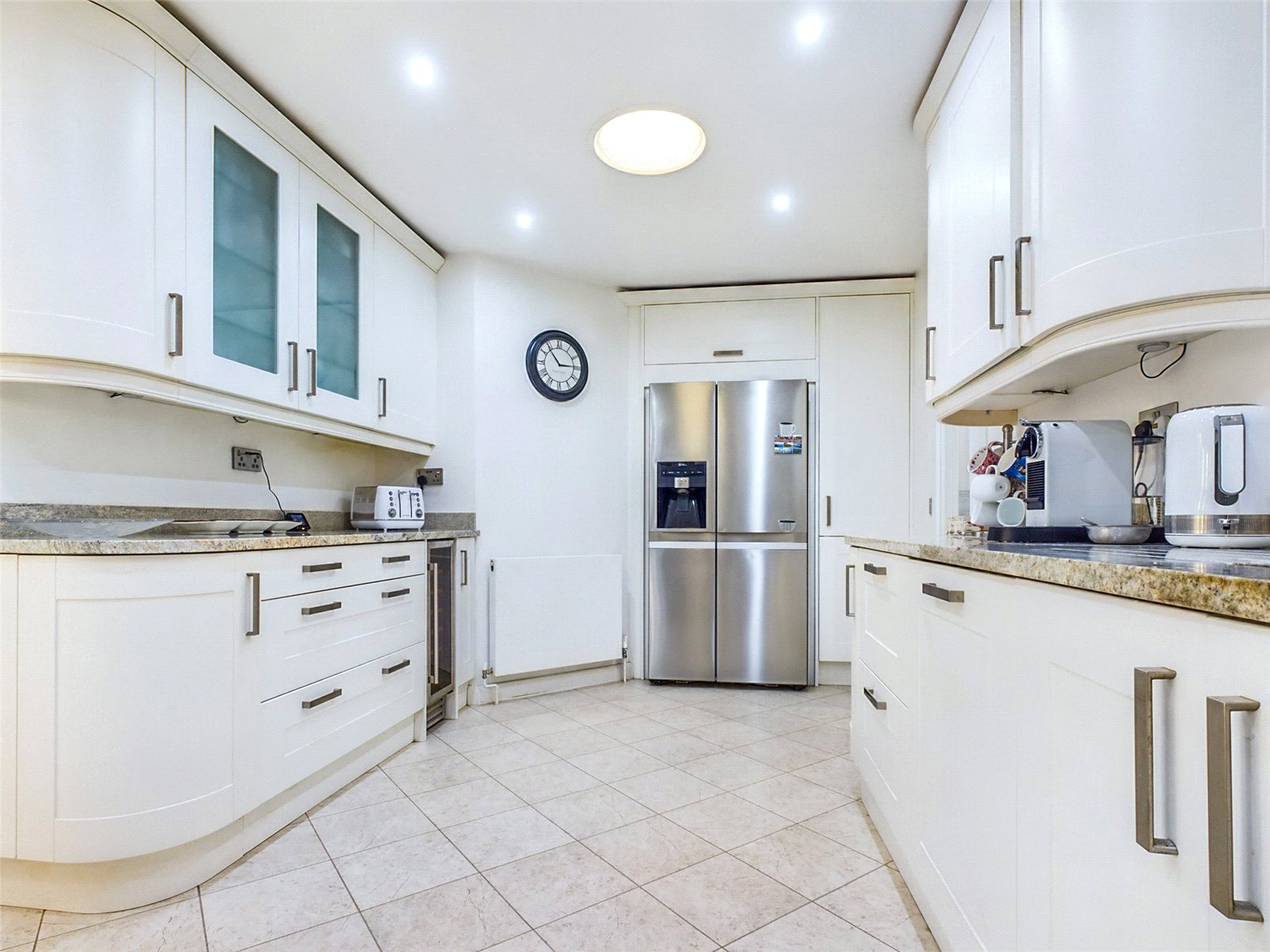Glass panelled door through to the modern kitchen where you have space for an American style fridge freezer, a Rangemaster cooker a wine cooler and integrated dishwasher. The washing machine and tumble dryer are located in the nearby utility room where you can also find the gas boiler.