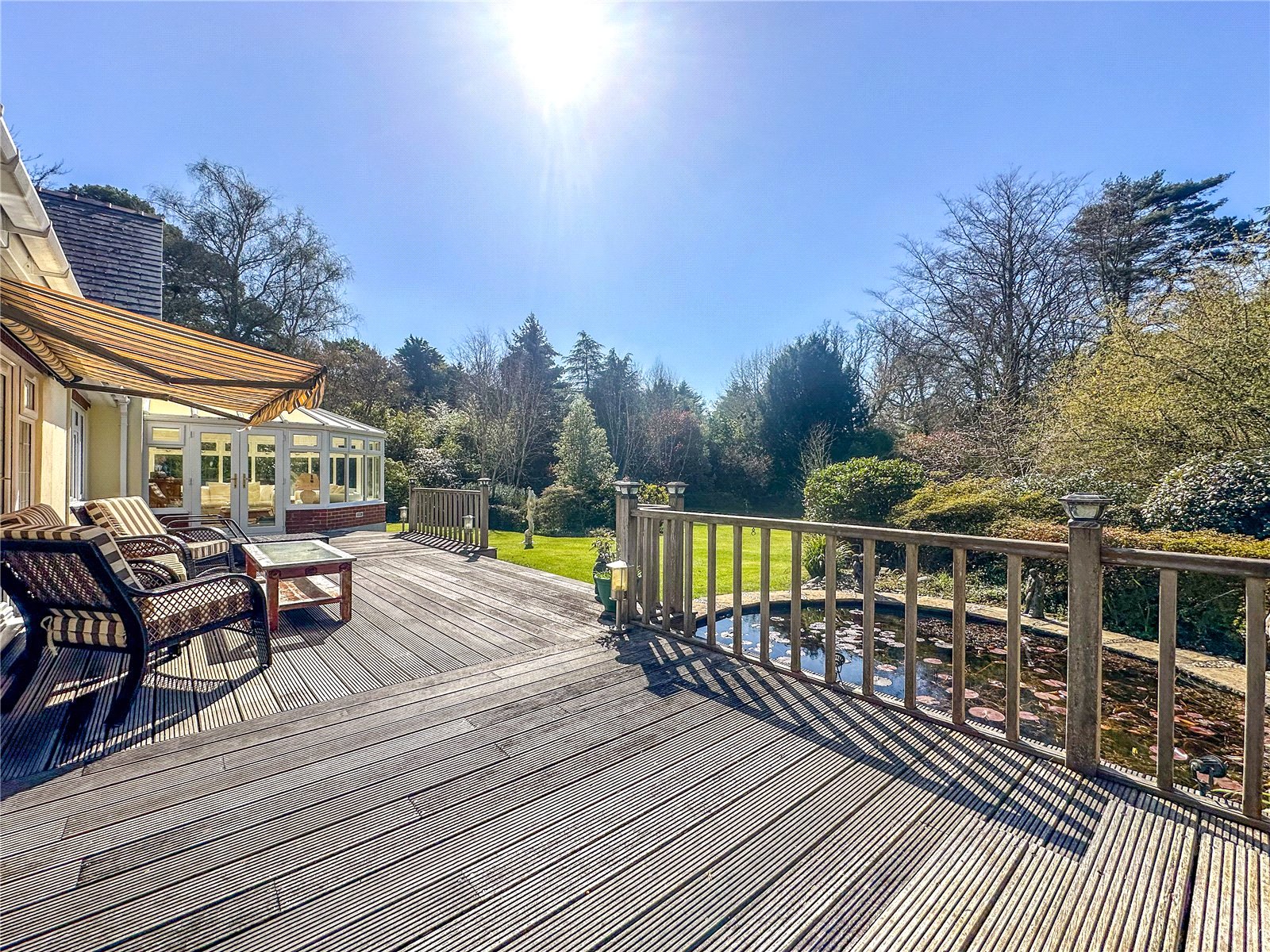 Immediately abutting the rear of the property is a large decked area and a water feature, the Garen extends to two areas of lawned Garden, which enjoy a variety of well stocked shrub and flower borders and mature trees, along with a Summer House