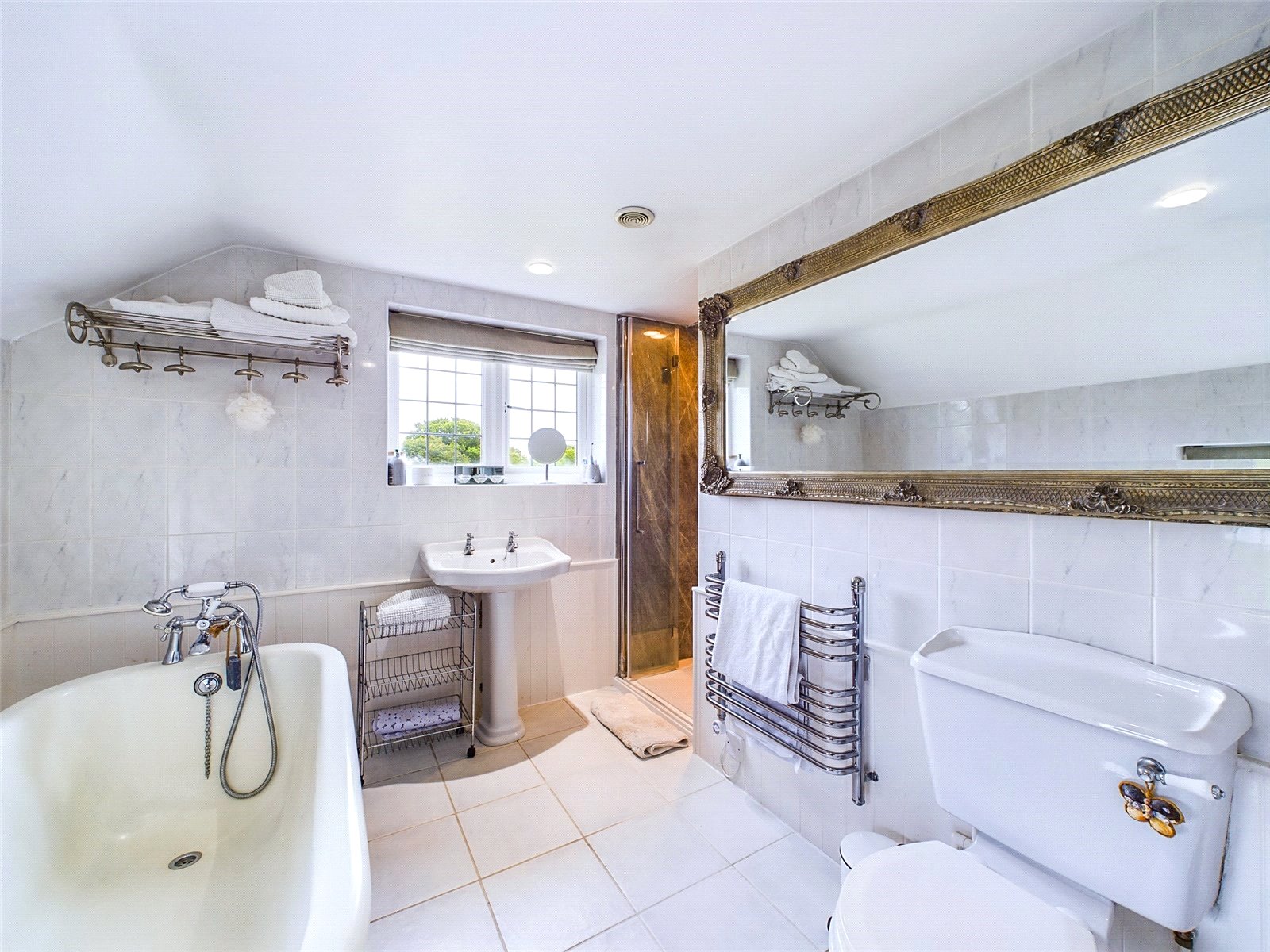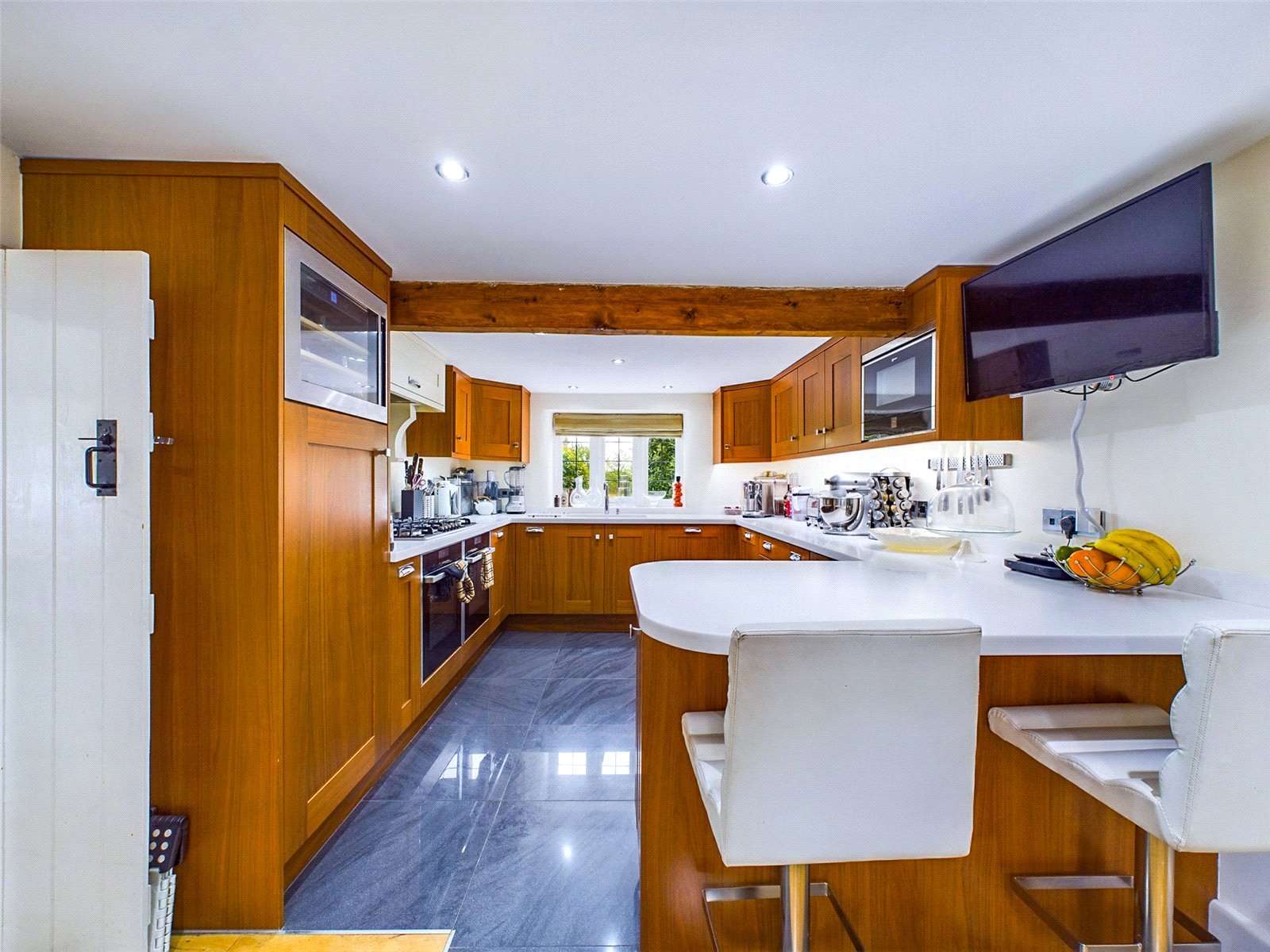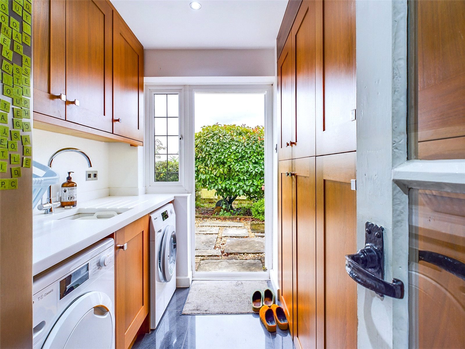 The kitchen offers plenty of storage, with eye and base level units, breakfast bar, range of integrated appliances and a Quooker tap. Additional storage and space for white goods is provided by the utility, with external door to the rear. Another hallway has a handy study area and the secondary staircase leading to the 4th/guest bedroom with adjacent shower room