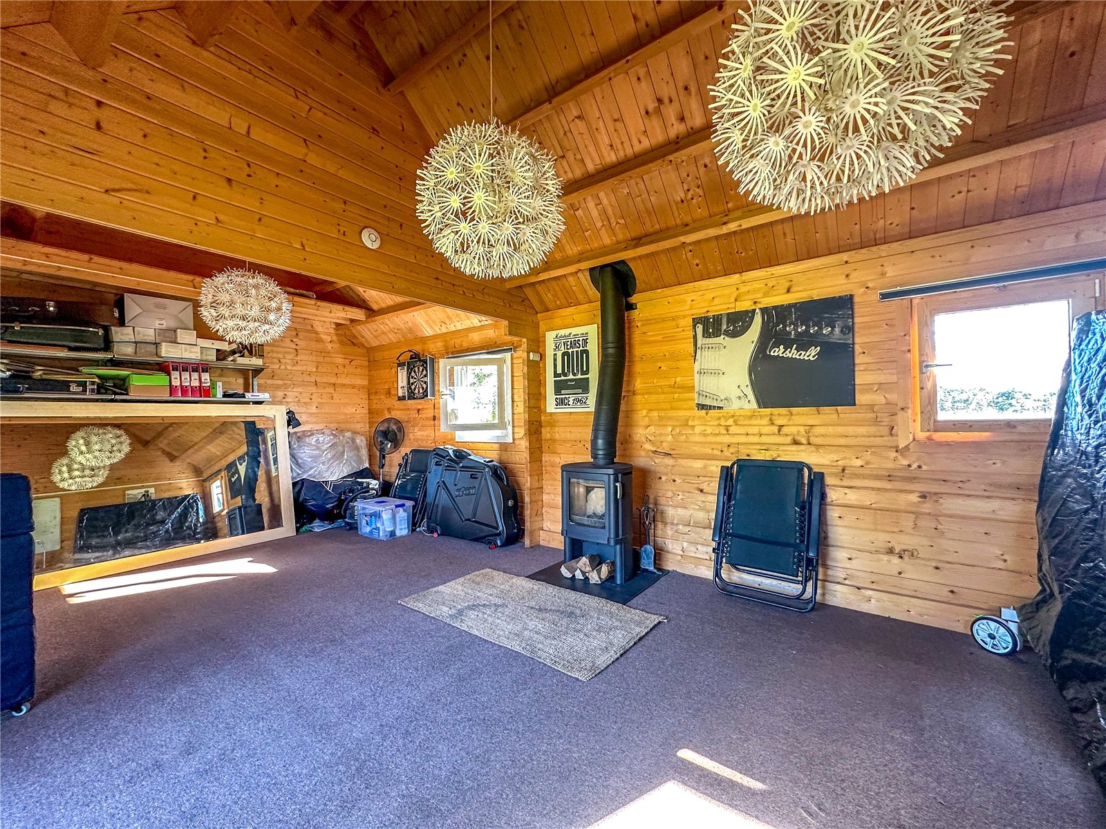 Externally to the front, there is a large driveway, with plenty of space for a multitude of vehicles and bordered by large fence. The rear garden is truly exceptional. On a plot of approximately a third of an acre, the rear garden is predominantly laid to lawn, with low-level fencing circumference. A patio space sits to the rear of the dining room, perfect for al fresco dining or a morning coffee. There is a raised area of decking to the rear, offering a lovely seating area to entertain and a home office/games room in the garden with power, lighting and its own log burner, situated alongside a picturesque orchard. A double garage sits to the left of the property.