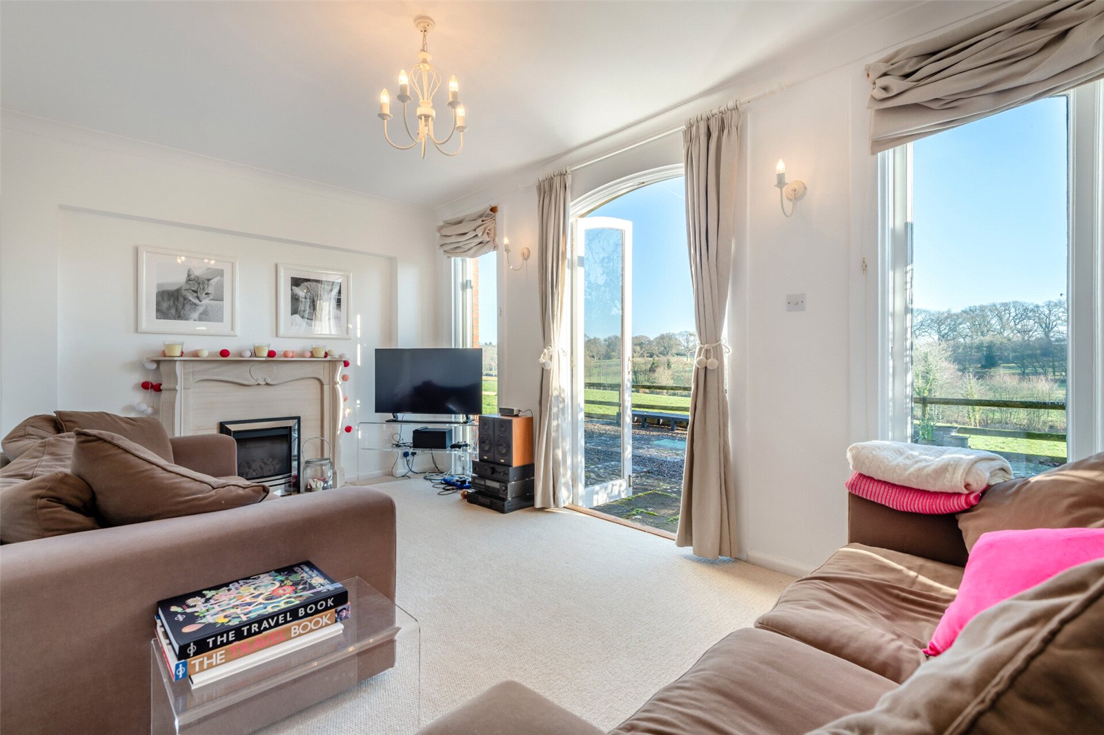 The exquisite sitting room features a stately stone fireplace with an inset gas fire, full-height glazing and French doors leading to the private courtyard, maximising the incredible views.