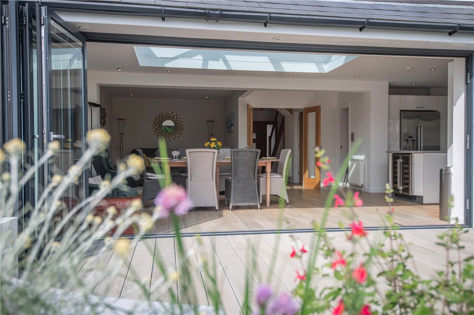 Entry via front door in to lobby, with coats cupboard and further door leading to bright and airy hall, providing access to primary ground floor accommodation. To the rear is a stunning open plan kitchen/living area. A beautiful space for entertaining, with a glass lantern roof, and bifold doors to the rear, ensuring an abundance of natural light. The kitchen has a plenty of eye and base level units, with worktop over, a central island with breakfast bar, and a range of high-end integrated appliances.