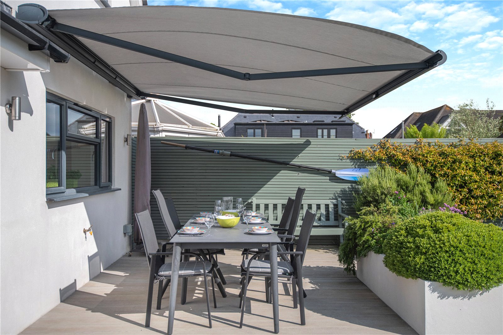 Externally, the front has a block-paved drive, with space for plenty of vehicles. The rear garden has been beautifully landscaped and faces South-Westerly. From the bifold doors to the rear, there is an area of decking, with electric sun awning offering a perfect space for al-fresco dining. This steps down to an area of artificial grass and a summer house, with power. All bordered by flower beds, shrubs and a relaxing water feature.