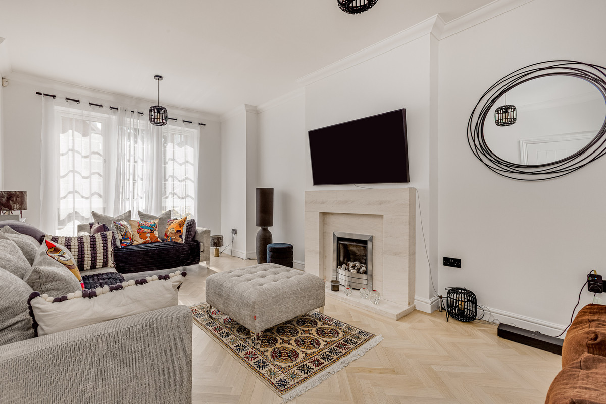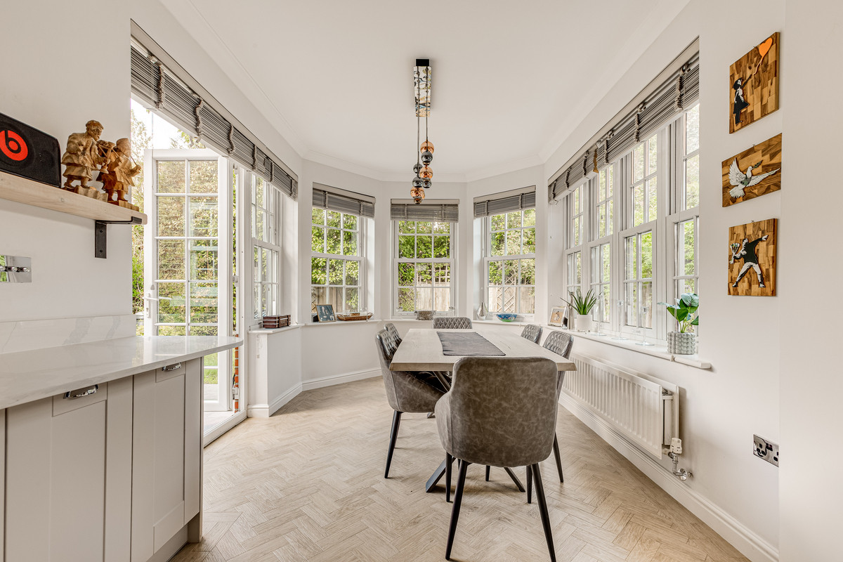 At the heart of the house is a stunning open-plan kitchen/family/dining room. The kitchen, recently modernised, features sleek cabinetry, integrated appliances, and striking herringbone-style Amtico flooring. It opens onto a practical utility room and an additional reception space. This versatile room is ideal as a playroom, snug, or home cinema, making it perfect for modern family life.