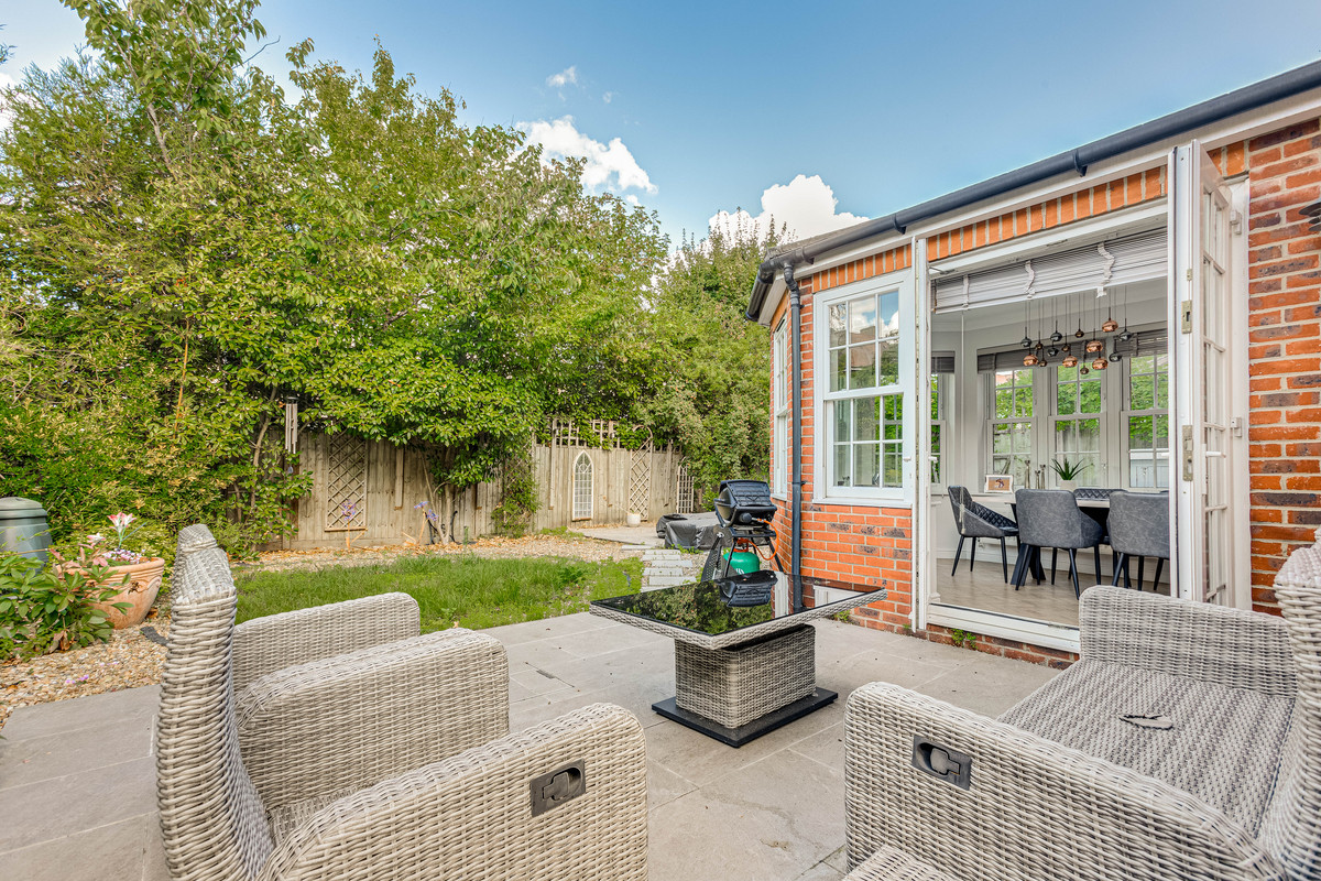 To the rear, the private garden has been professionally landscaped and features atmospheric outdoor lighting—offering year-round beauty and a serene escape from everyday life. French doors from the kitchen provide seamless indoor-outdoor living. To the front, a paved driveway provides ample off-street parking.