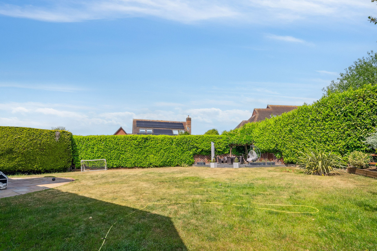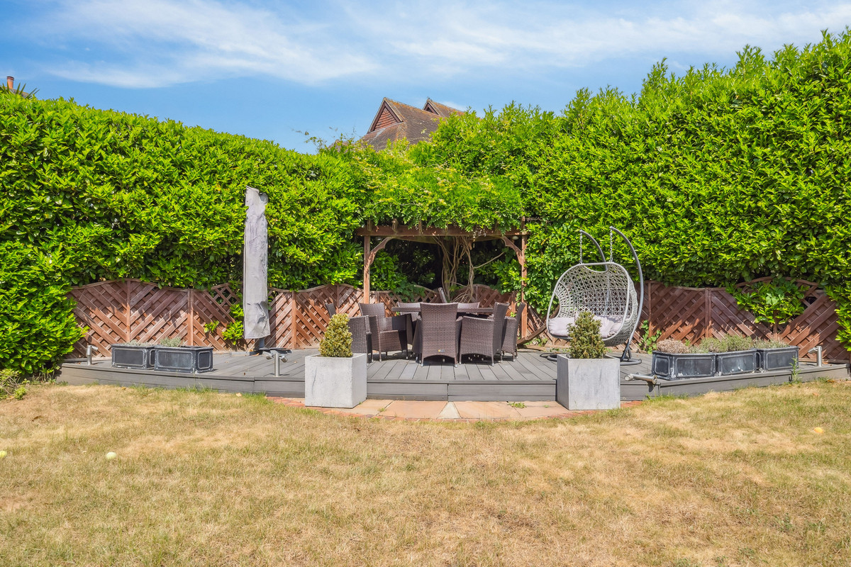 The landscaped rear garden is an idyllic space for relaxation and entertaining, with a full-width stone terrace, manicured borders, and a secluded decked seating area. A gated carriage driveway provides secure parking for several vehicles alongside the triple garage.