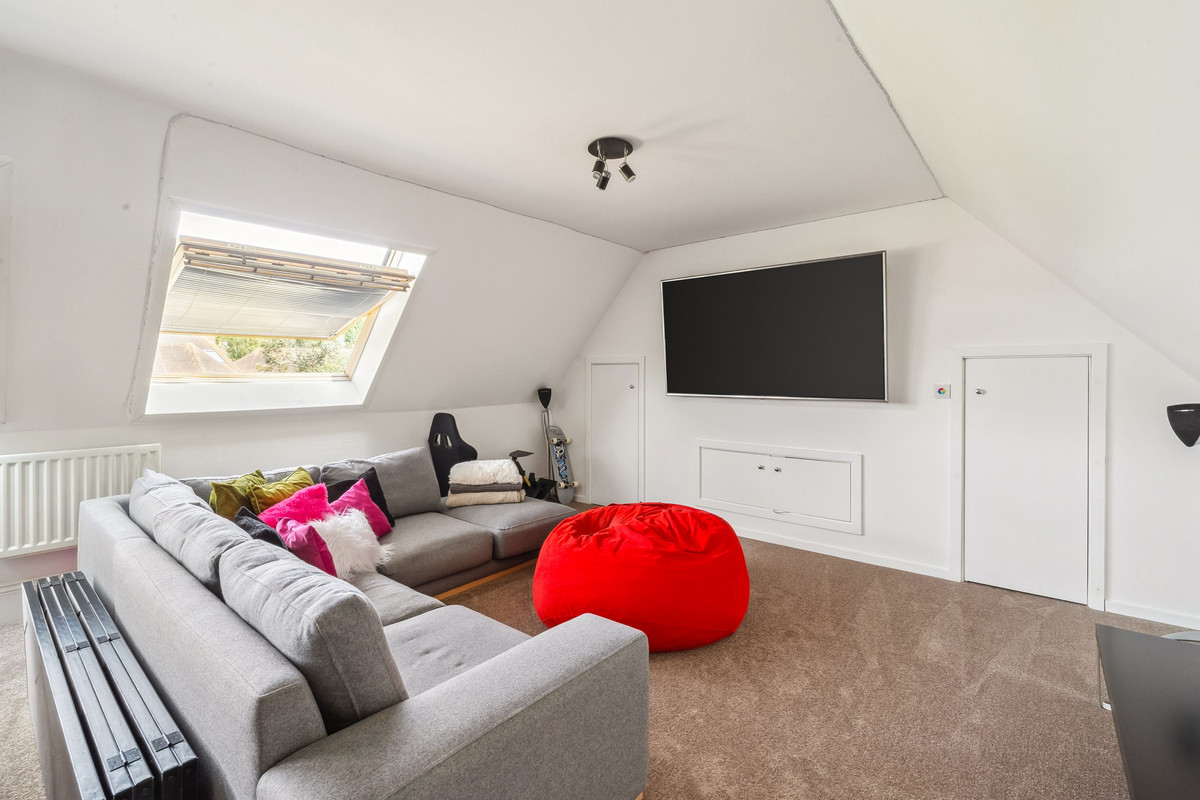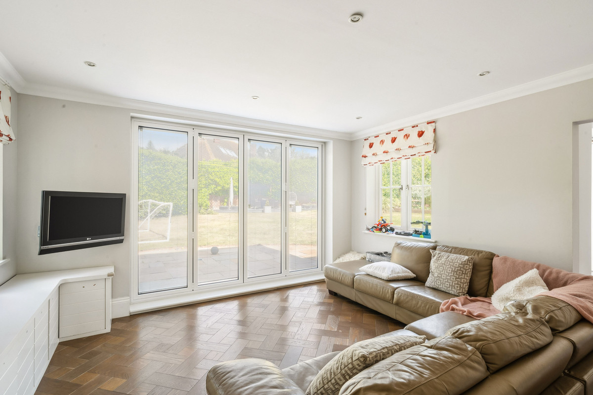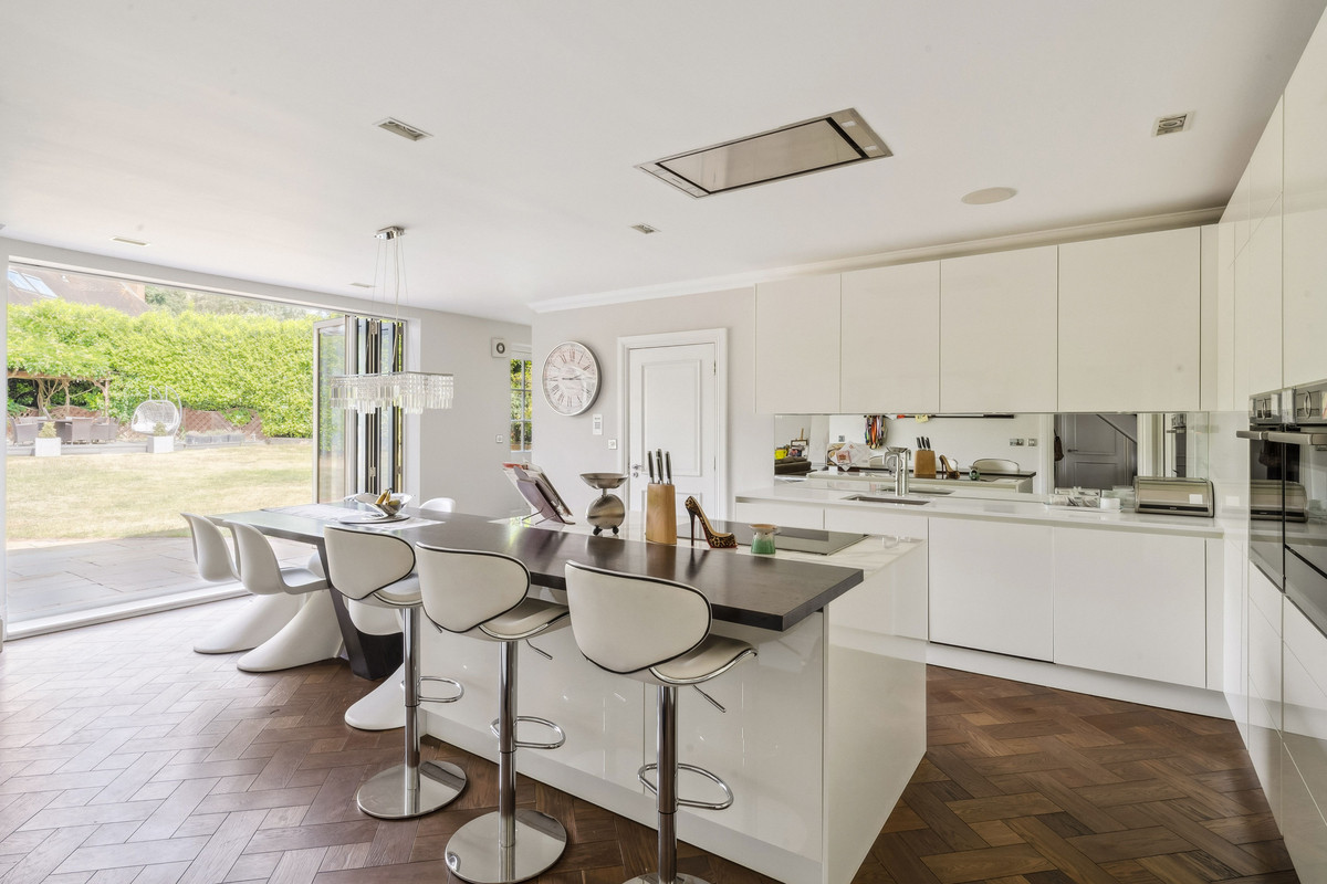 To the rear, the spacious kitchen/breakfast/family room serves as the heart of the home. Sleek cabinetry, Quartz worktops, and high-end integrated appliances make this kitchen both stylish and functional, while French doors open to the garden terrace—perfect for al fresco dining and summer gatherings. A well-appointed utility room, private study, guest cloakroom and integral triple garage complete the ground floor, which also benefits from underfloor heating and a premium SONOS sound system.