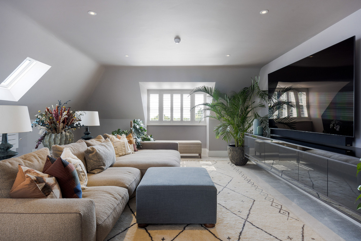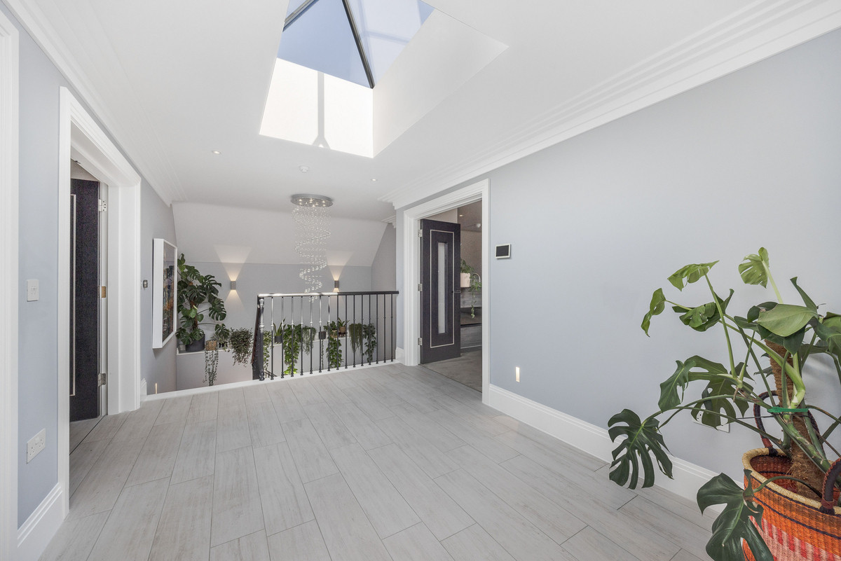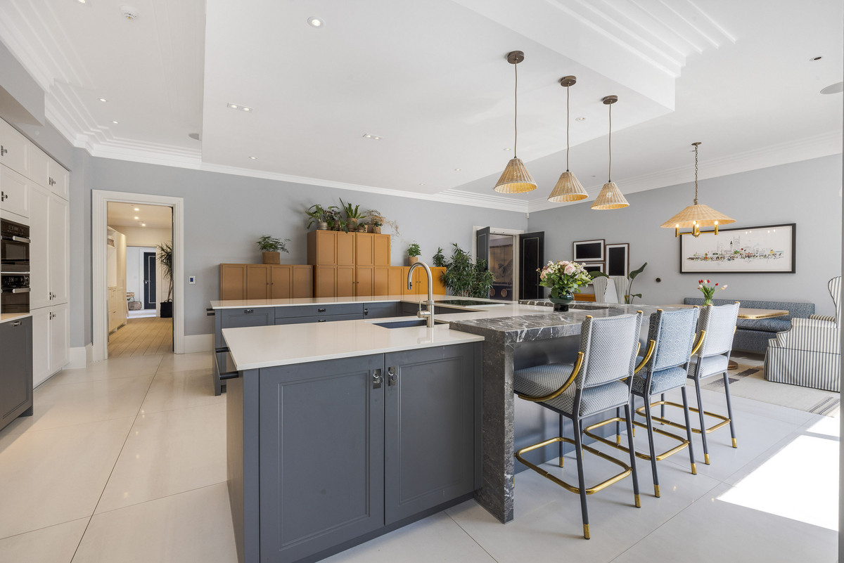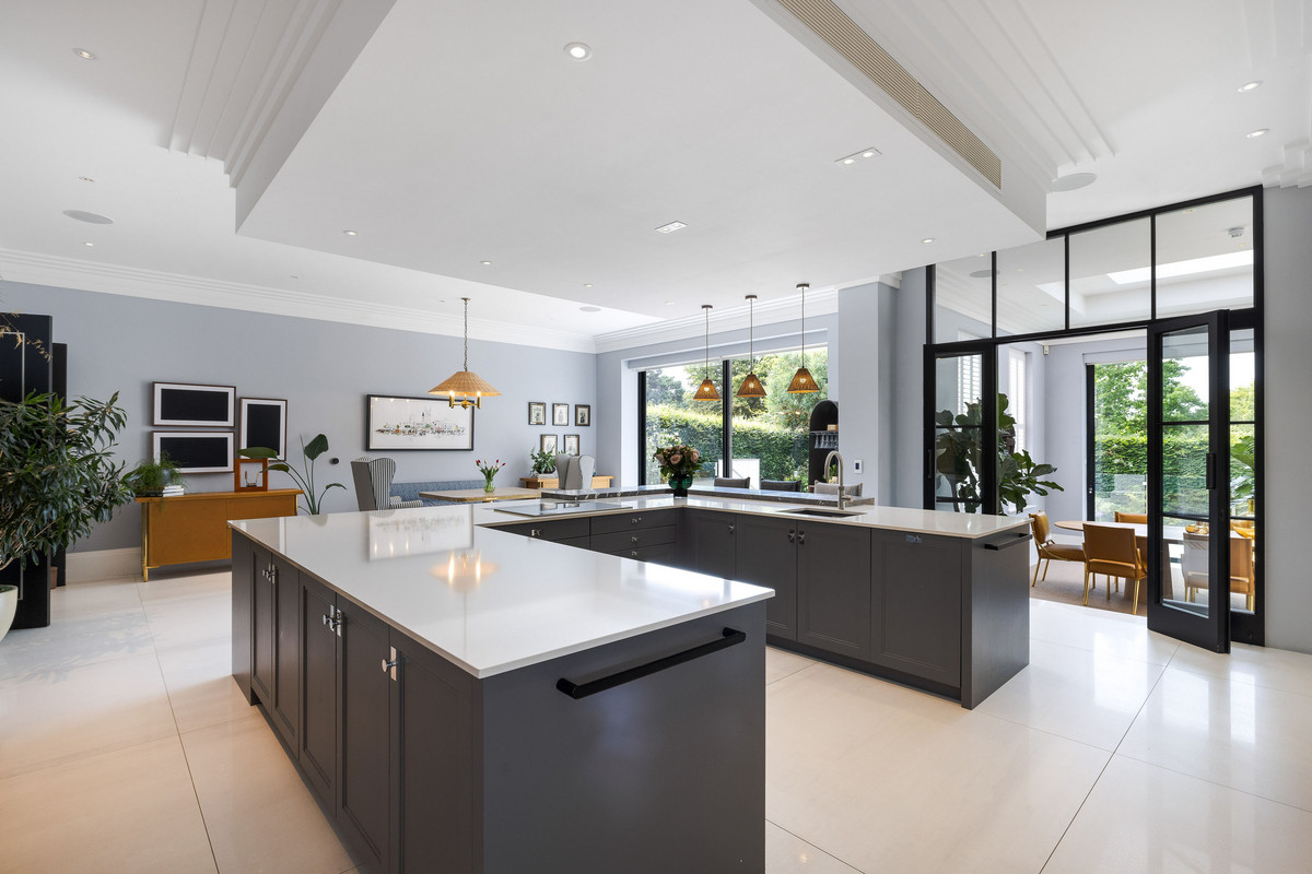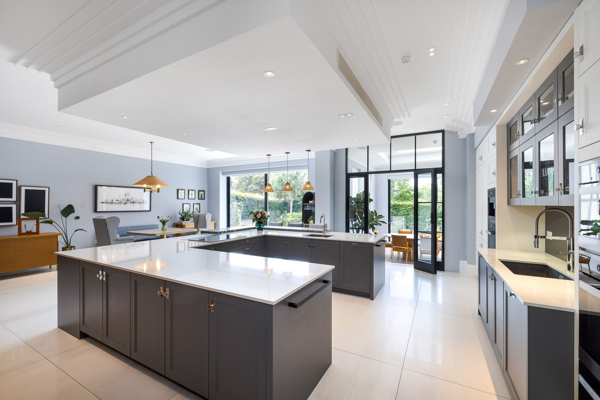 A superb six bedroom detached residence situated in one of Cobham’s most sought after addresses. Arranged over three floors, the property boasts over 8,504 sq ft of stylish interiors with the ground floor welcoming you into a showstopping entrance hall which leads onto a formal dining room, separate study/home office, drawing room and an incredible open plan kitchen/family room that leads onto a gorgeous garden room overlooking the landscaped gardens. The bespoke integrated kitchen is every chef’s dream and is equipped with a range of appliances as well as having a fabulous horseshoe island providing ample space to cook and entertain.