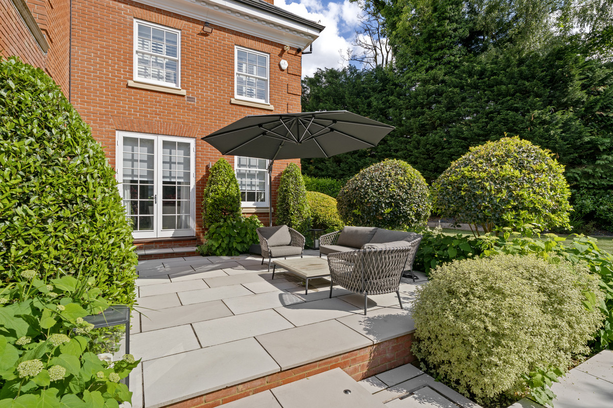 The magnificent full-width terrace at the back of the house offers an ideal space for summer entertaining and enjoys views across the grounds.