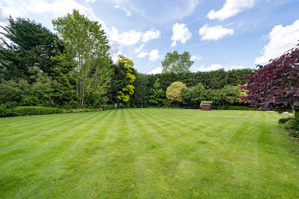 The garden is primarily laid to lawn and is bordered by mature plants and shrubs, providing privacy from neighboring properties. A fully incorporated irrigation system, atmospheric lighting, and water features create a special ambiance.