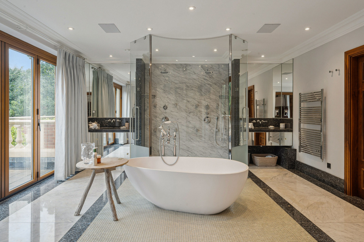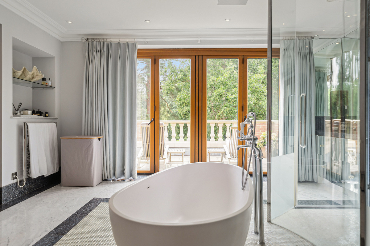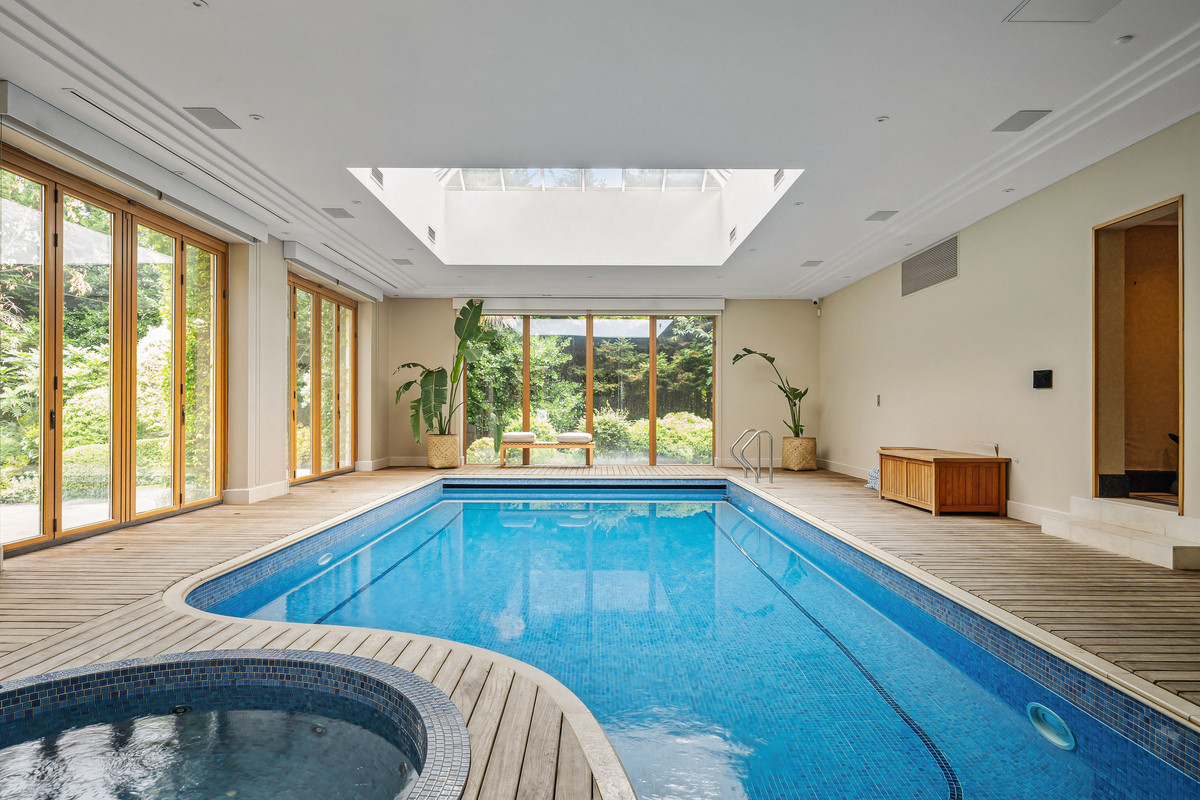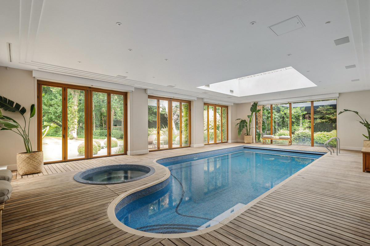 Wellness and leisure are centre stage: an indoor swimming-pool complex with steam room, gym and changing facilities opens to the gardens, while a self contained staff apartment ensures discreet service. The specification includes air conditioning and underfloor heating. A double garage completes the offering.