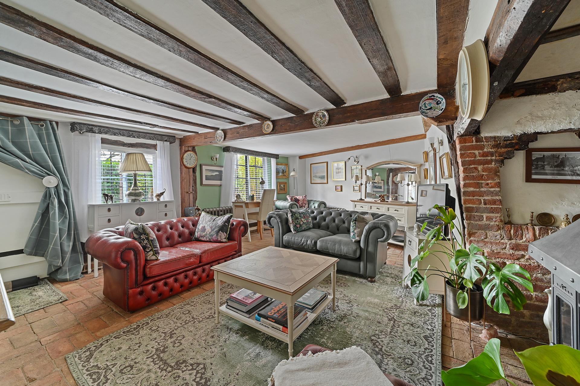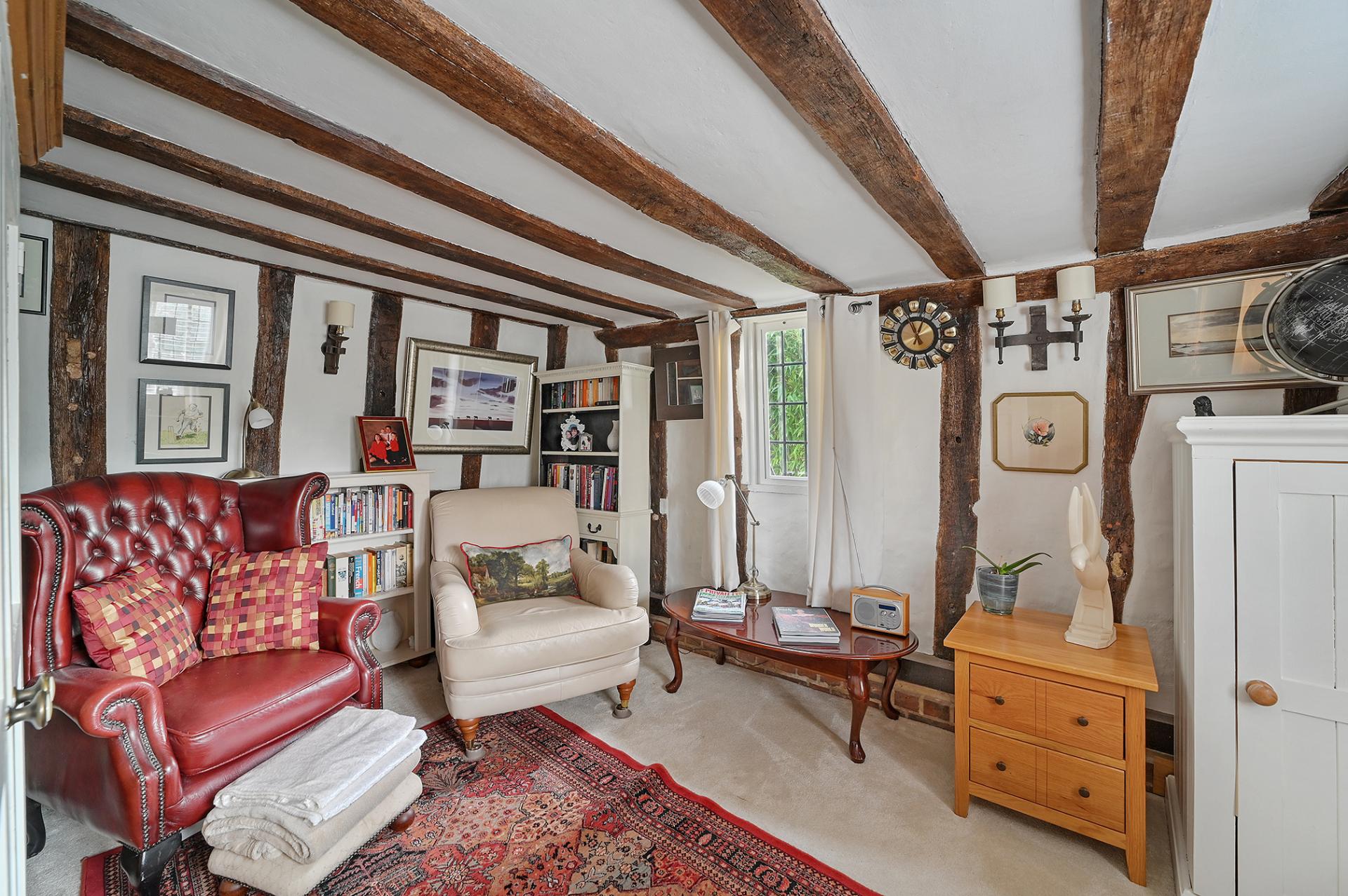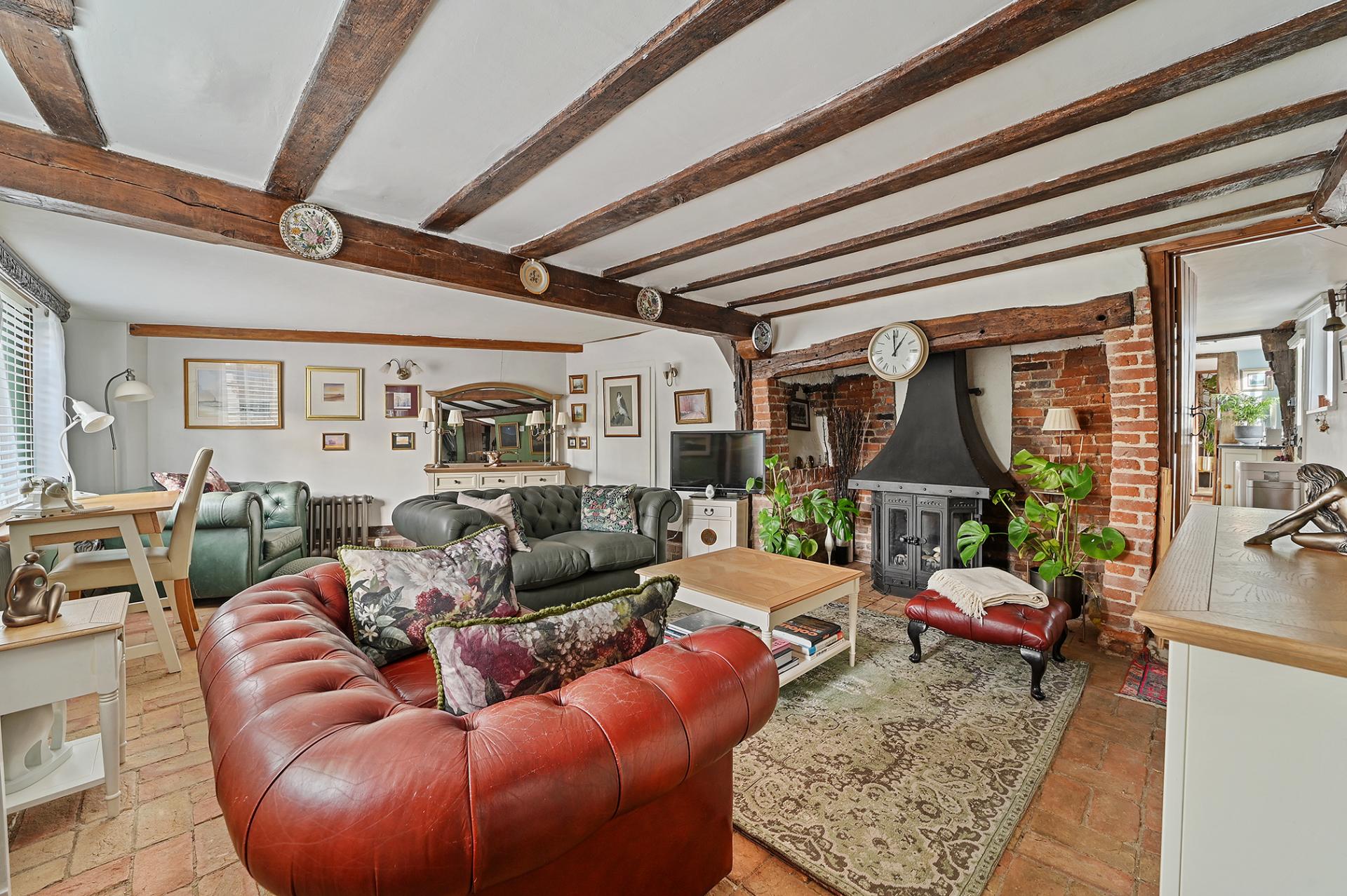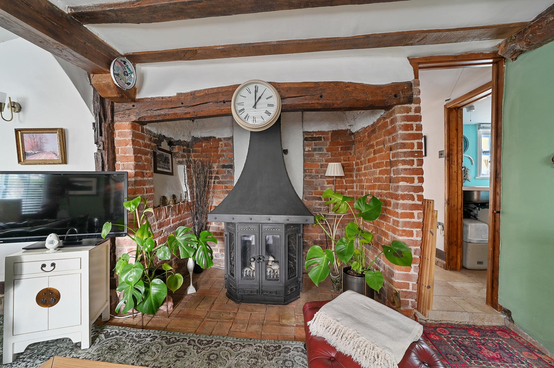 Moving through to the front of the house the large sitting room, with original brick paver floor and impressive inglenook fireplace and log burner, has views across to the village green, with access to the front garden via a traditional front door. Leading off the sitting room is a cosy, double aspect snug, which could be utilised as an additional bedroom if required.